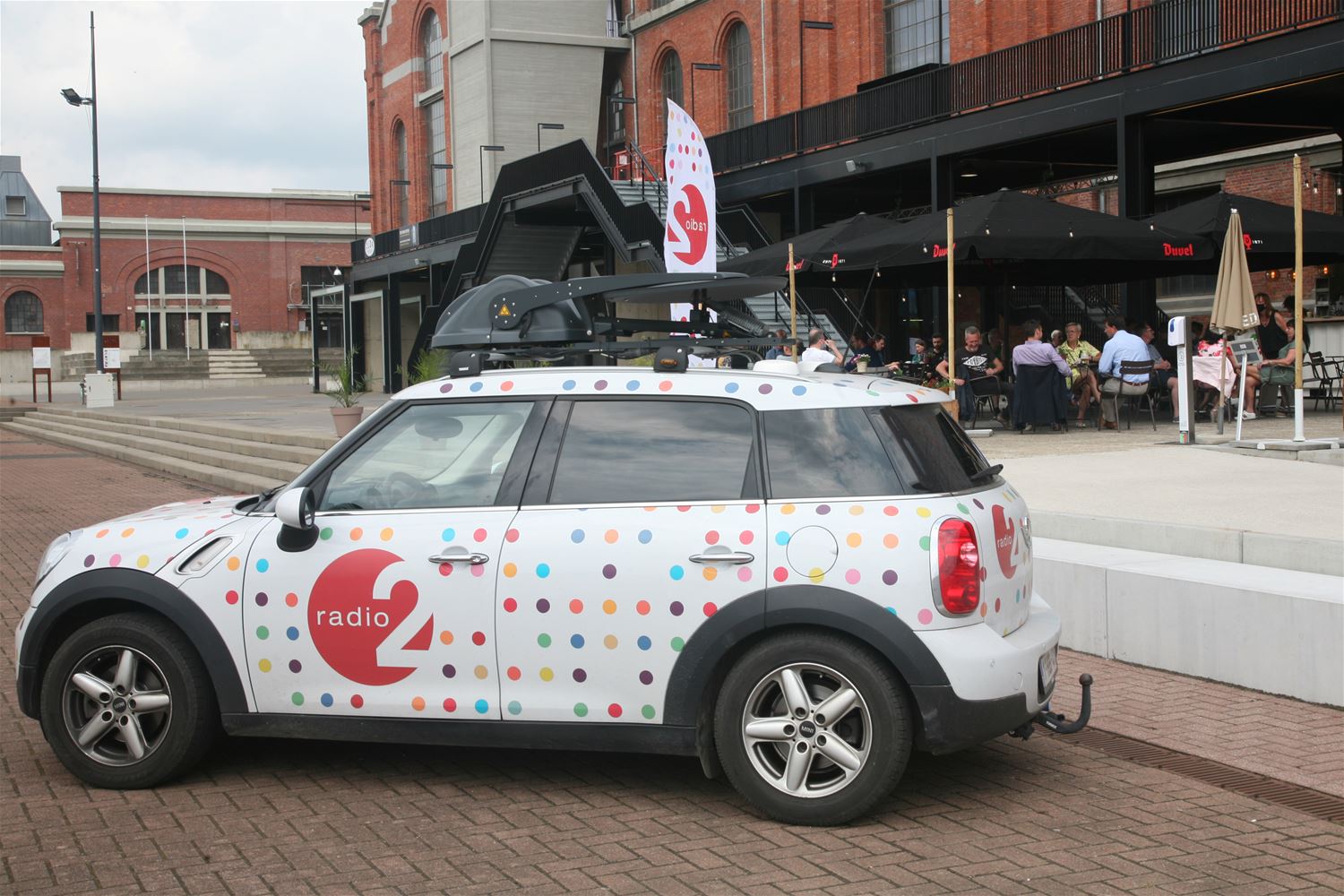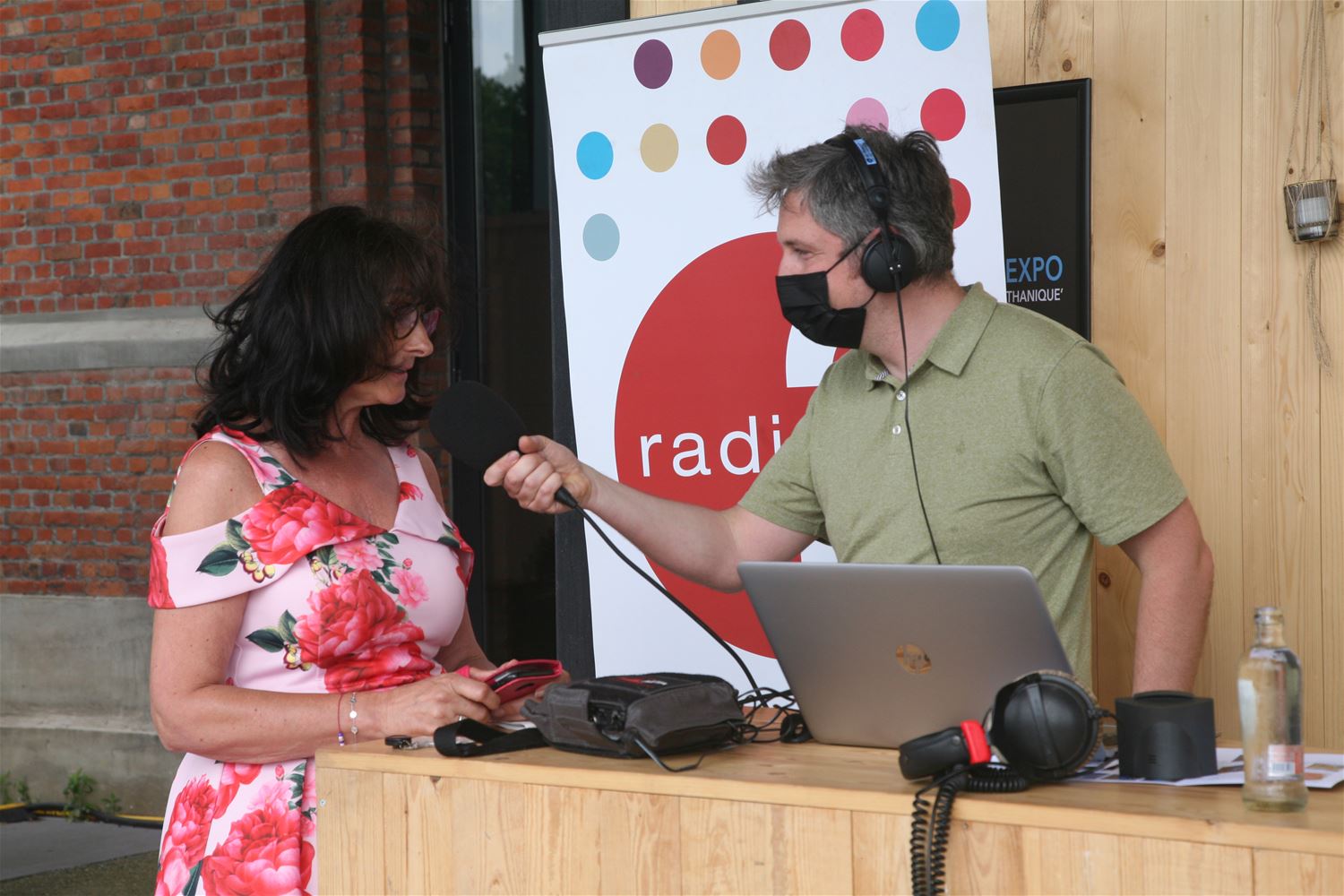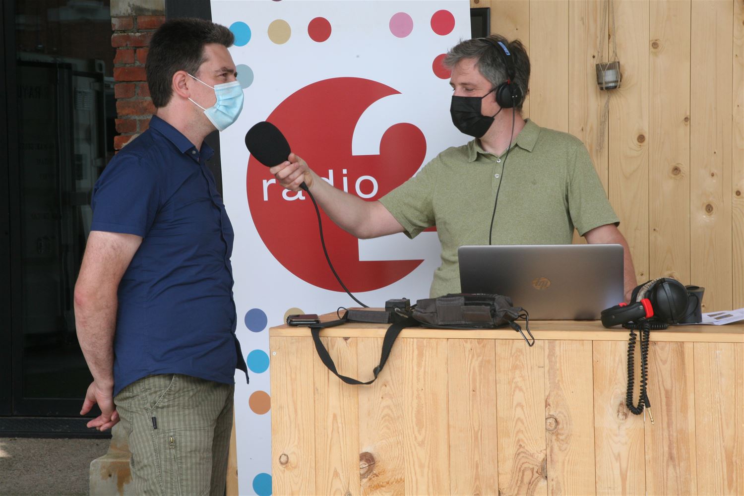 Radio 2 Limburg was vanmiddag met het middagprogramma te gast op het terras van Muze. Geen toeval want volgende week start het cultuurcentrum weer volop met zijn programmatie en de vaccinatiecentra staan een hele dag centraal bij Radio 2. Muze-directeur Tom Michielsen vertelde aan presentator Mathijs Bijnens hoe het cultuurcentrum tijdens de coronaperiode actief is gebleven en wat er de de komende weken op het programma staat. Kunstenaars Mark Swysen en Danie Jordens kwamen uitleg geven bij hun tentoonstellingen die nog tot en met het weekend in ZLDR Luchtfabriek lopen. Rita Christiaens, vrijwilligster in hetvaccinatiecentrum aan de overkant van het Marktplein, vertelde hoe het daar aan toegaat en enkele leerlingen van het 7de jaar veiligheid van het Sint-Franciscus waren enthousiast over hun stage die ze in Watt17 doen. (foto's Herman Eerdekens)