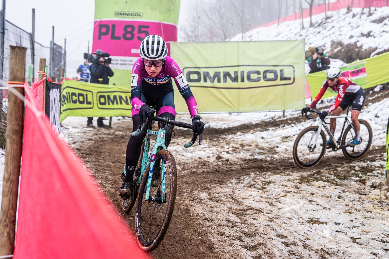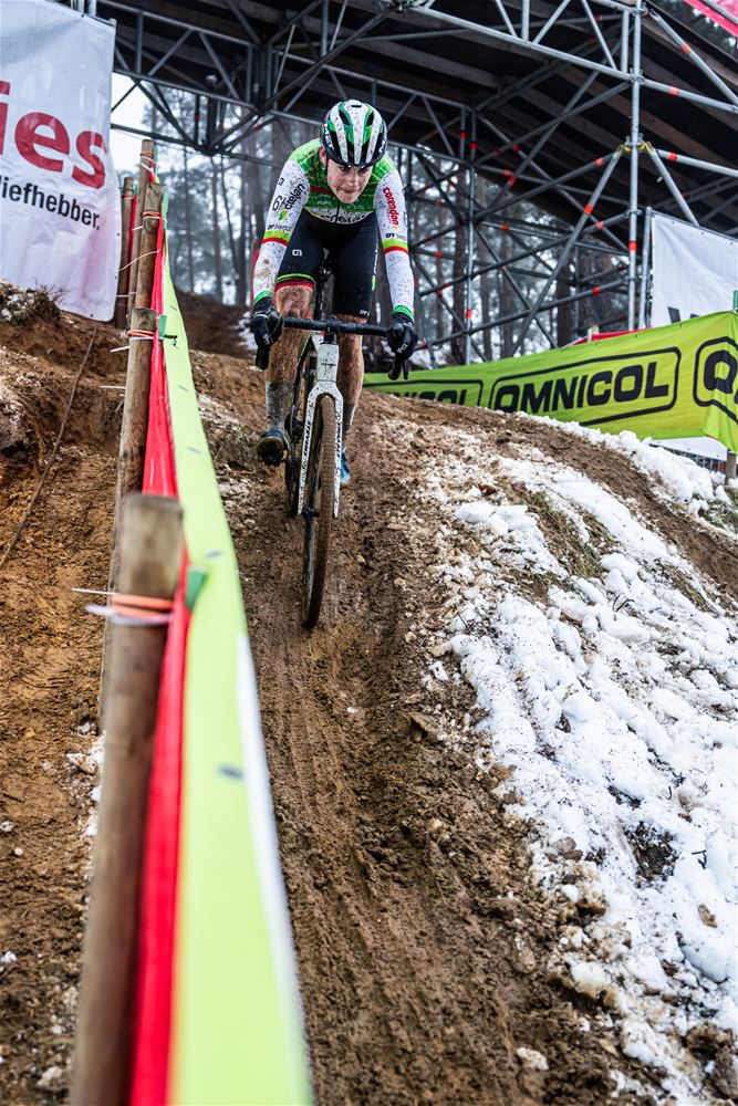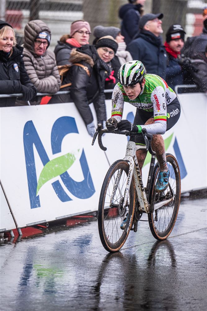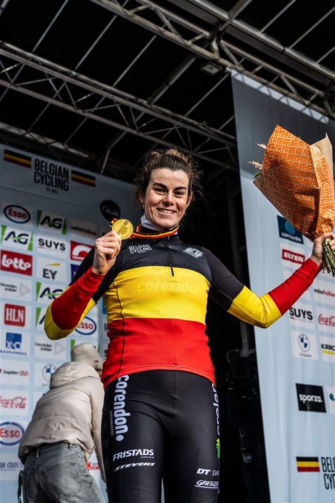 Marion Norbert-Riberolle heeft niet onverwacht de Belgische titel bij de elite vrouwen gewonnen. Het zag er in het begin nochtans bekaaid uit, door een aanrijding na de start, reed ze de eerste ronde in 15de positie. Maar ze bleef rustig, zette de situatie recht en nam de leiding. Daarbij sloeg ze een stevige kloof zodat ze zonder veel risico's kon uitrijden. Achter haar zorgde Laura Verdonschot voor de verrassing door de zilveren medaille te pakken. Verdonschot - die zoals bekend aan verstopte aders in beide dijbenen moet geopereerd worden - was louter voor de supporters en sponsors gestart, maar gaf mee kleur aan de wedstrijd. Derde werd Julie Brouwers die iets te veel fouten maakte om Verdonschot nog te kunnen bedreigen. Sterre Vervloet pakte de titel bij de beloften. (foto's DD)84192