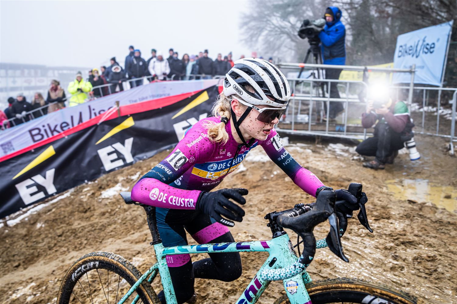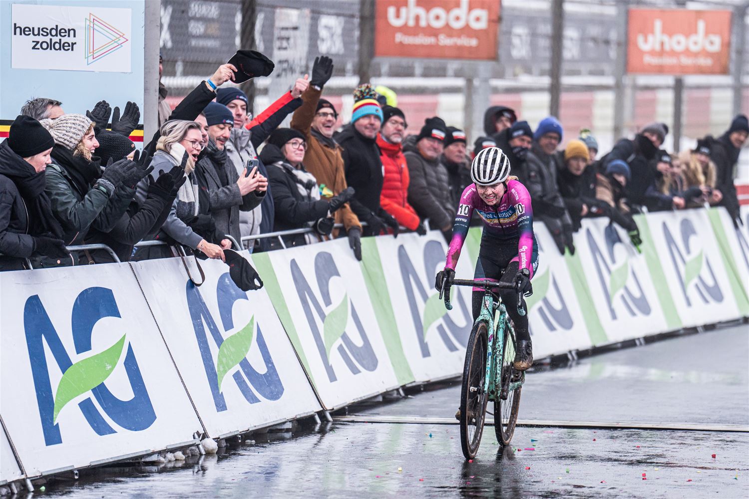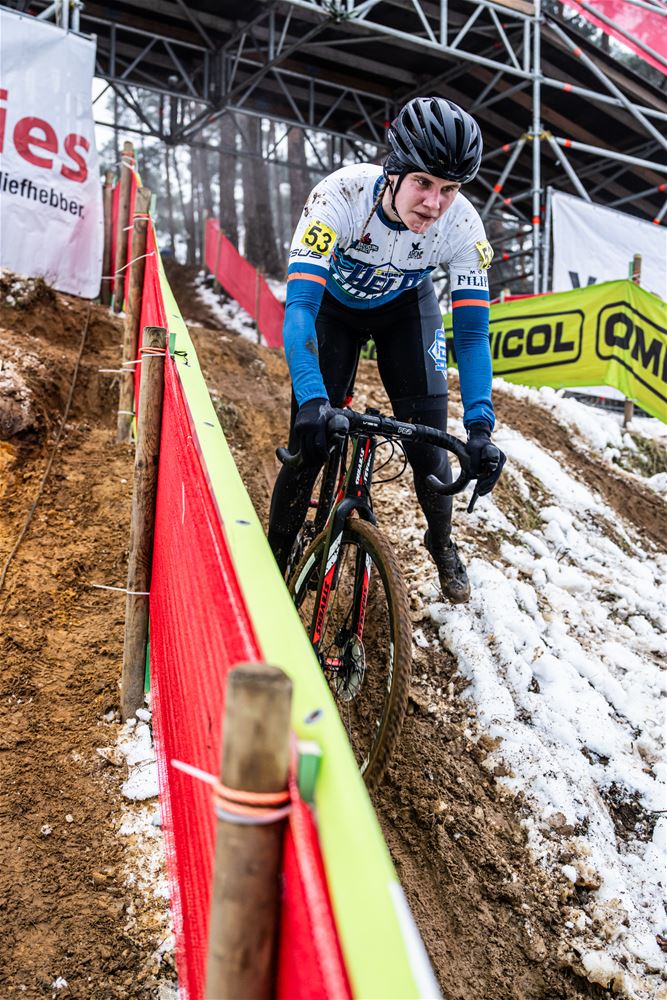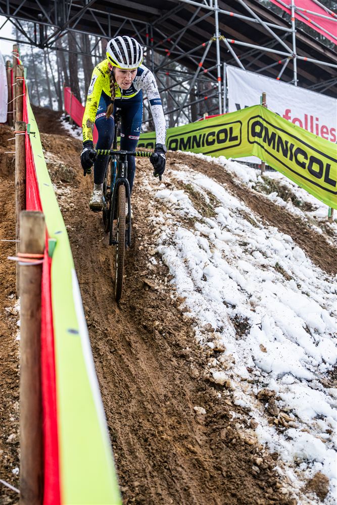 Marion Norbert-Riberolle heeft niet onverwacht de Belgische titel bij de elite vrouwen gewonnen. Het zag er in het begin nochtans bekaaid uit, door een aanrijding na de start, reed ze de eerste ronde in 15de positie. Maar ze bleef rustig, zette de situatie recht en nam de leiding. Daarbij sloeg ze een stevige kloof zodat ze zonder veel risico's kon uitrijden. Achter haar zorgde Laura Verdonschot voor de verrassing door de zilveren medaille te pakken. Verdonschot - die zoals bekend aan verstopte aders in beide dijbenen moet geopereerd worden - was louter voor de supporters en sponsors gestart, maar gaf mee kleur aan de wedstrijd. Derde werd Julie Brouwers die iets te veel fouten maakte om Verdonschot nog te kunnen bedreigen. Sterre Vervloet pakte de titel bij de beloften. (foto's DD)84192