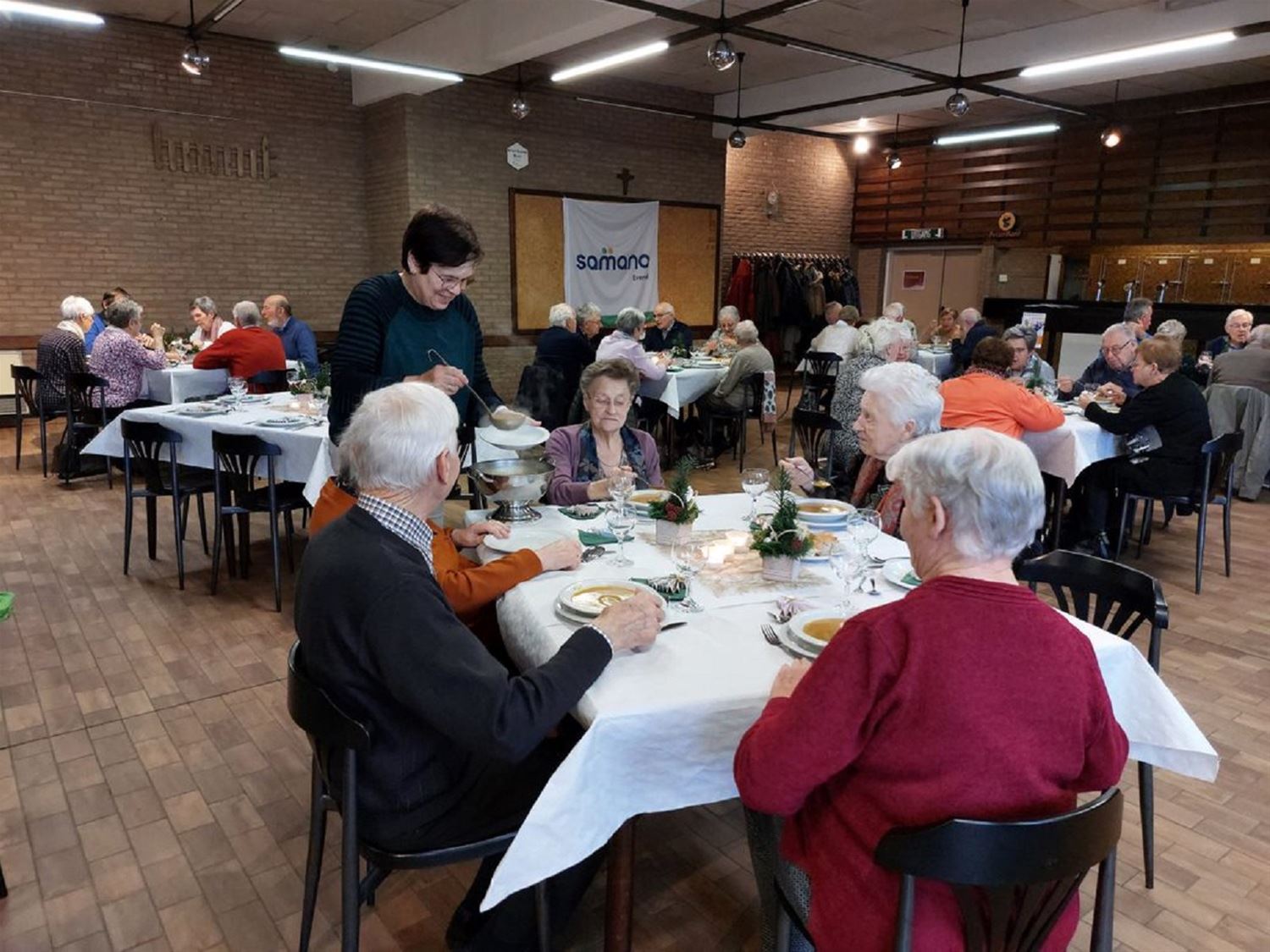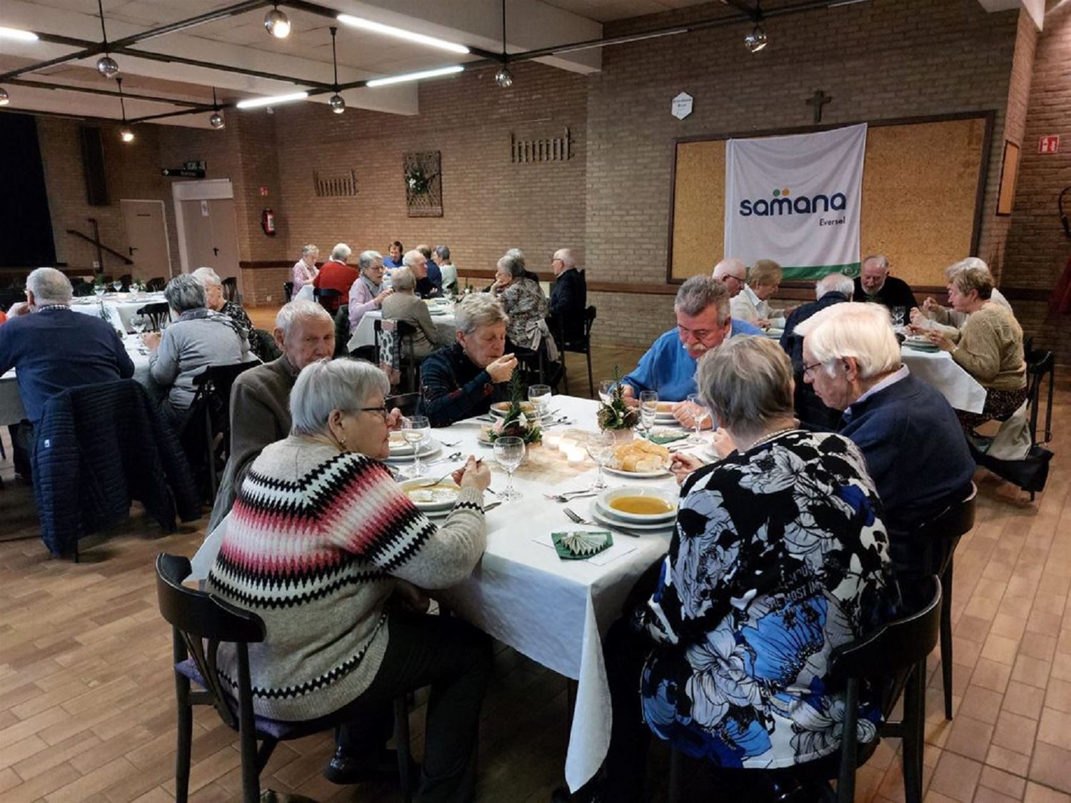 Samana Eversel had zijn leden uitgenodigd om aan de mooi versierde feesttafel in Sint-Baaf aan te schuiven voor een kerstfeest. Na het welkom door de voorzitster, volgde een kerstbezinning met stemmige muziek. Na het eten zorgde de toneelgroep van Femma Eversel voor de leutige noot met kersttoneel en sketches. (foto's Mieke Swerts)76221