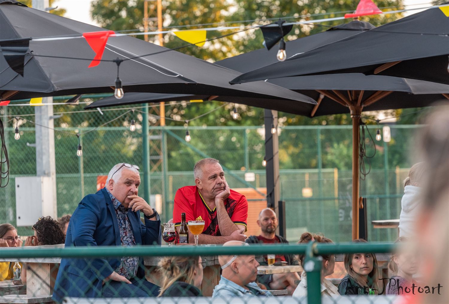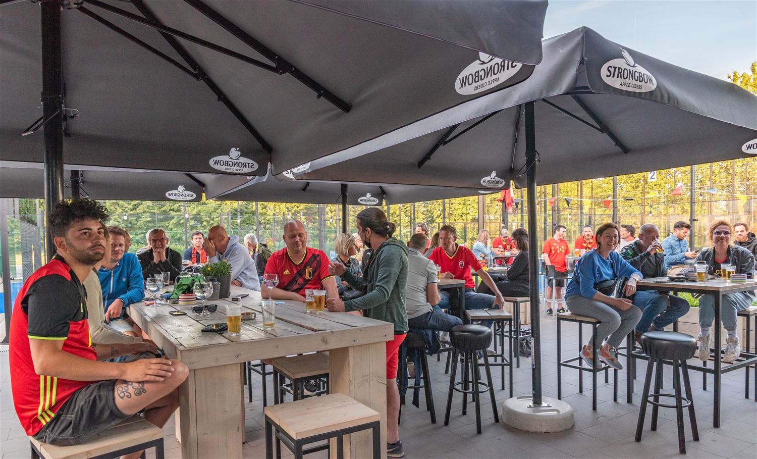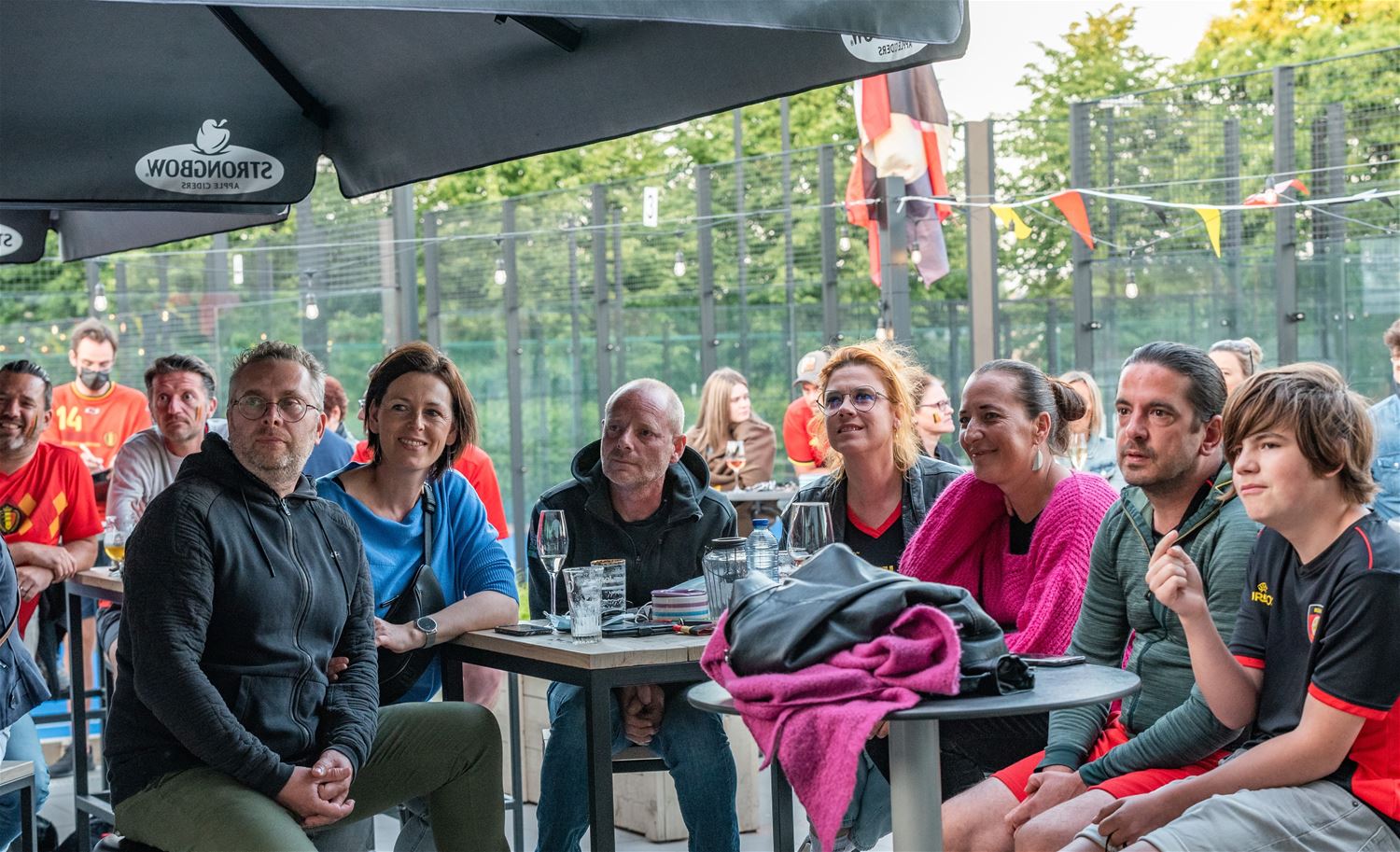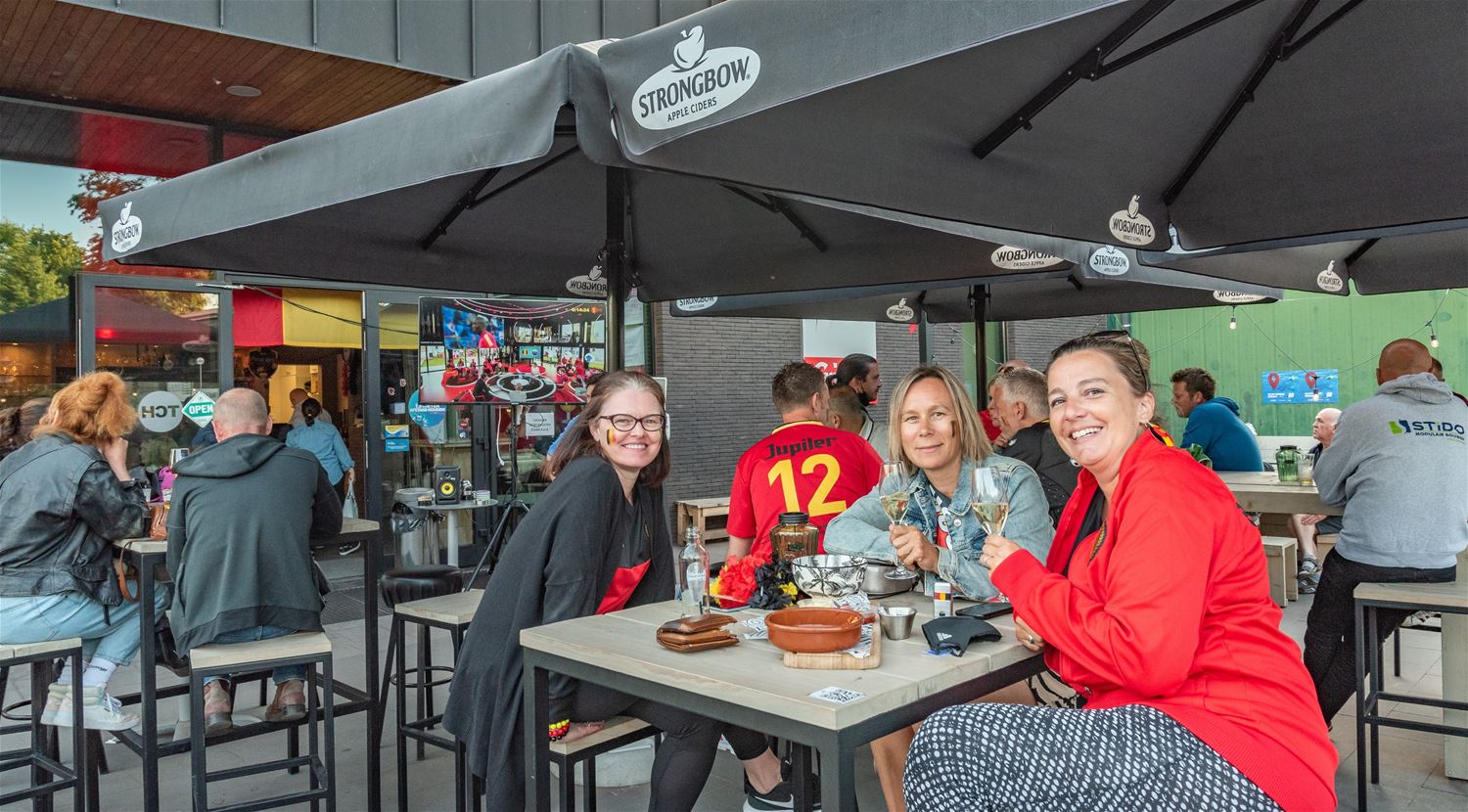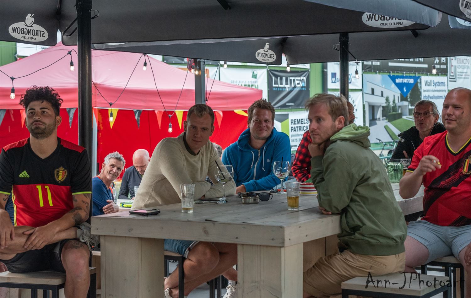 Op verschillende plaatsen troepten de voetbalsupporters samen om samen op een groot scherm de EK-partij van de Rode Duivels te volgen. Zo ook bij Tennis- en Padel Heusden waar op drie plaatsen grote schermen stonden opgesteld zodat het publiek verspreid en met afstand de wedstrijd kon volgen. Er heerste een zomerse sfeer, toch zeker in de eerste helft, nadien was het wachten tot Lukaku kort voor affluiten de temperatuur weer wat omhoog dreef. (foto's Ann Jordens)