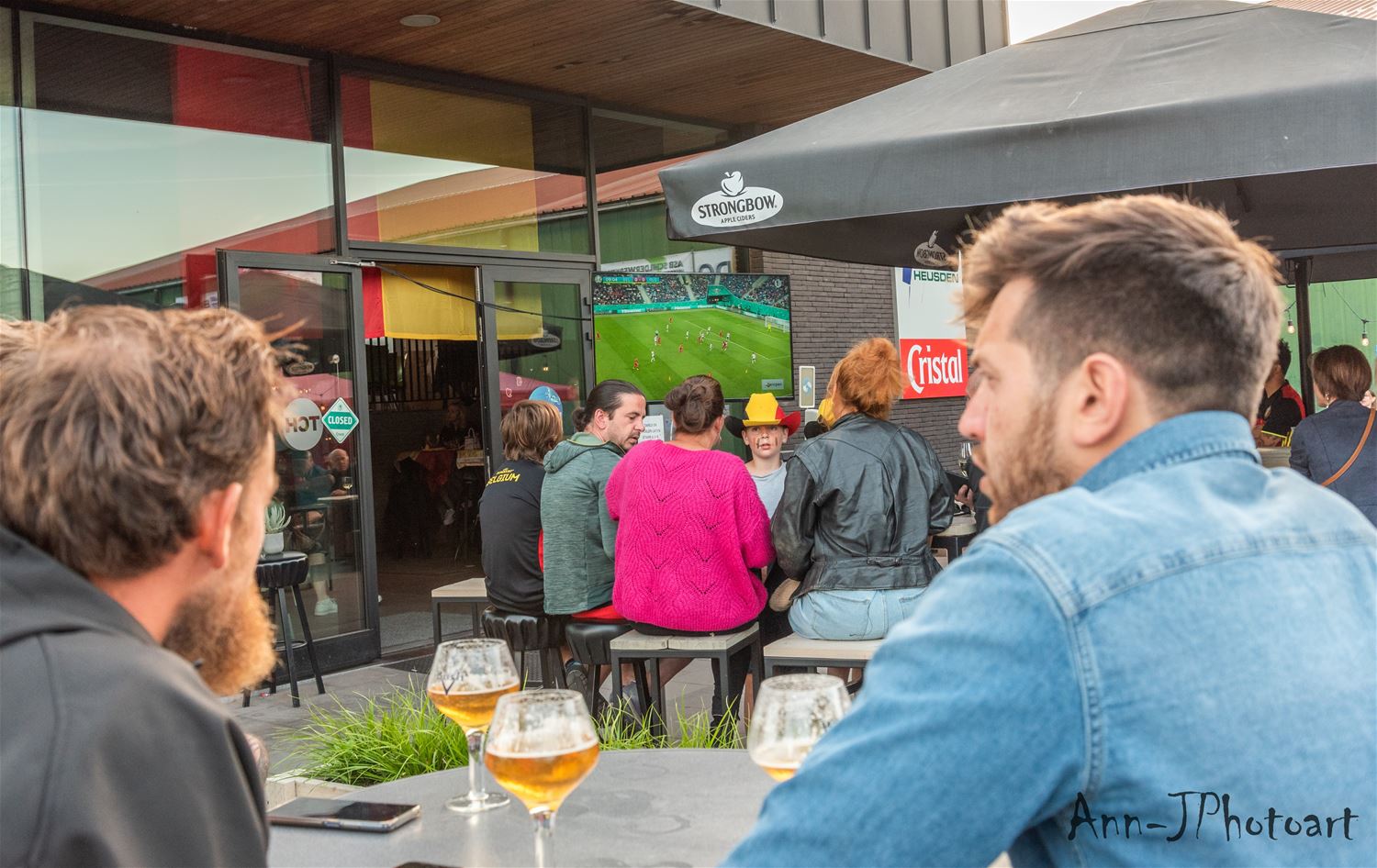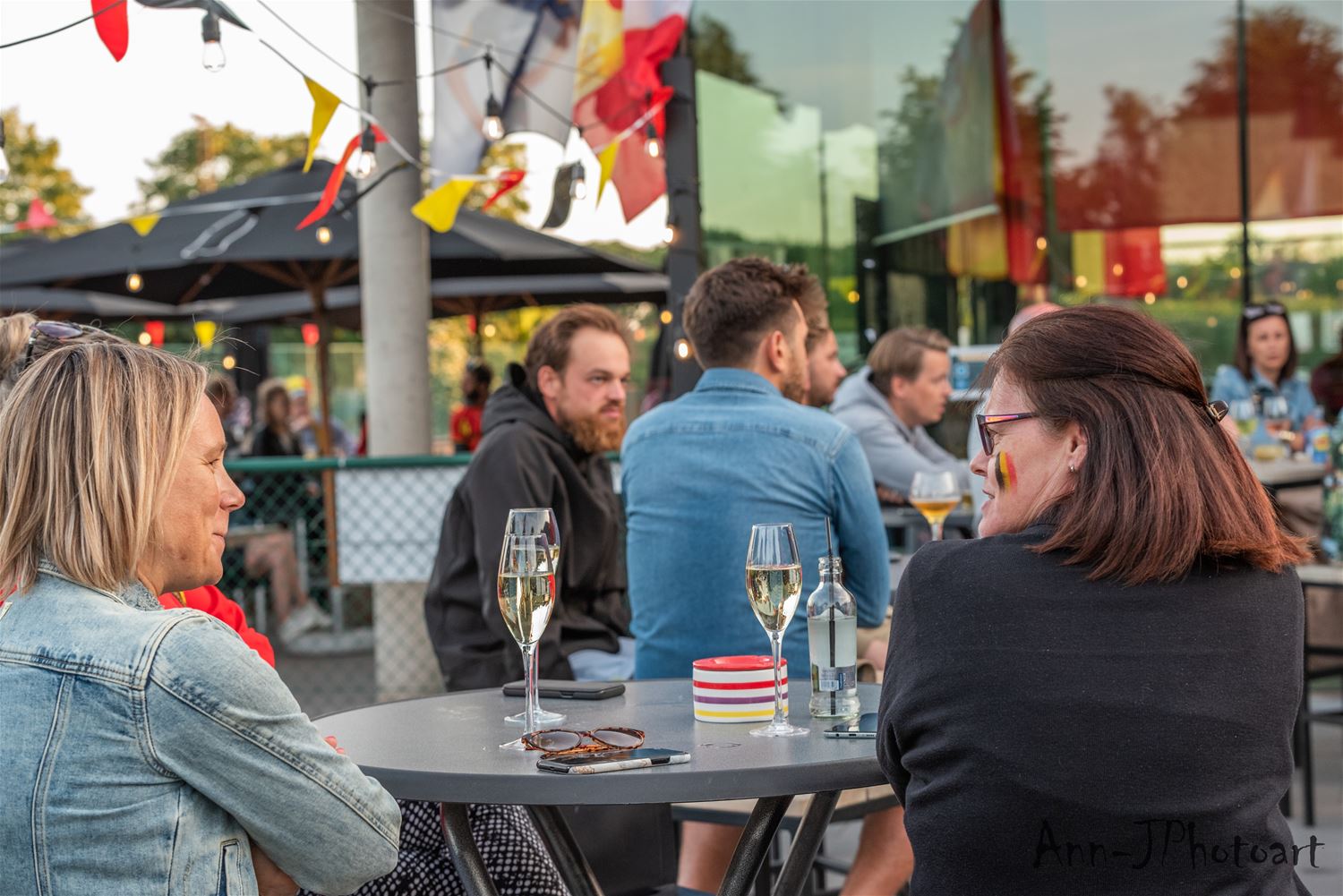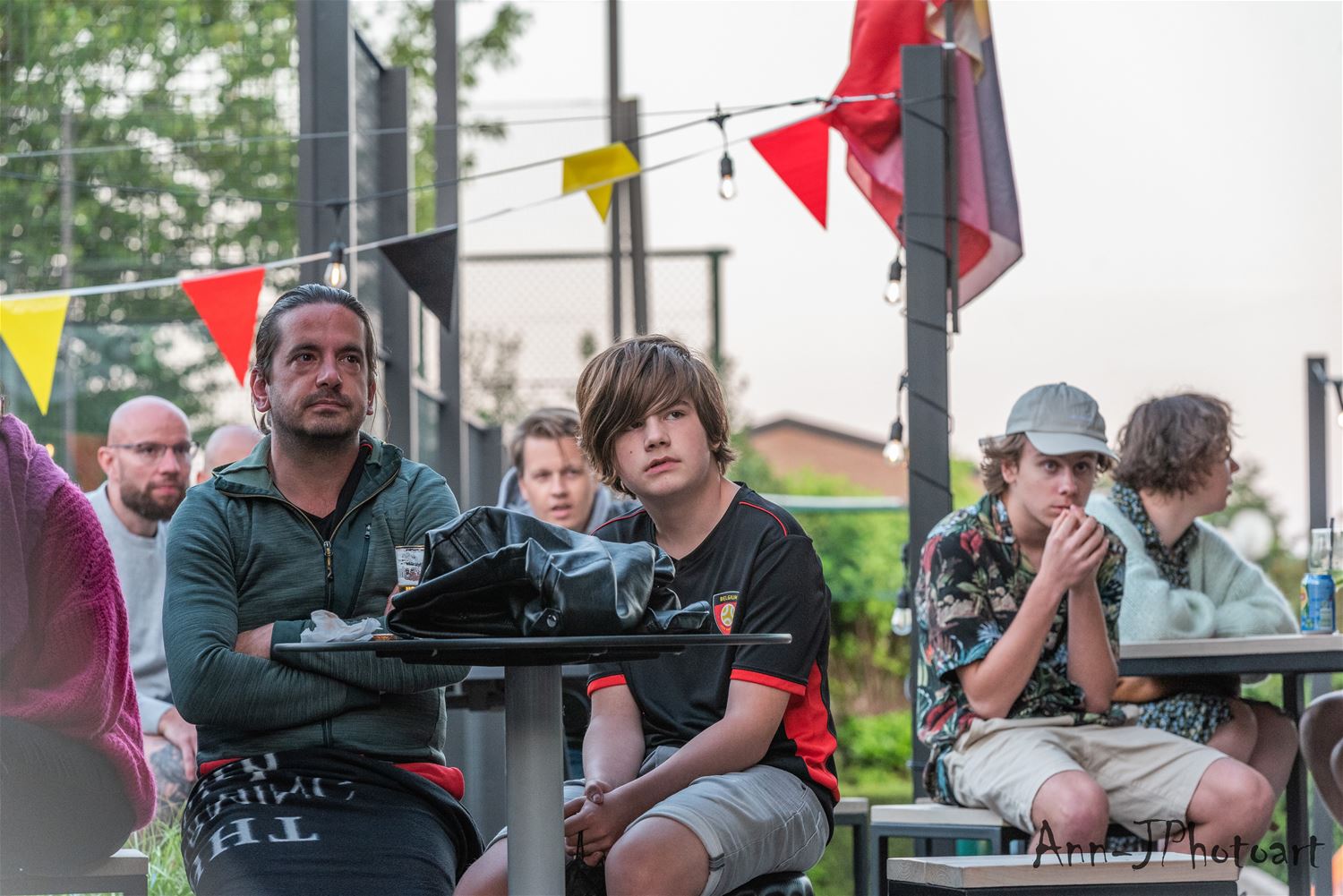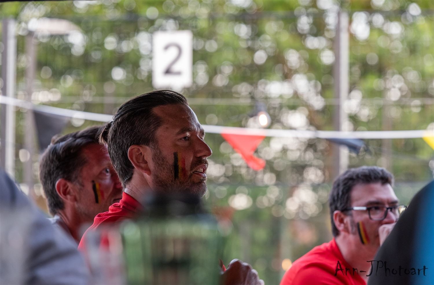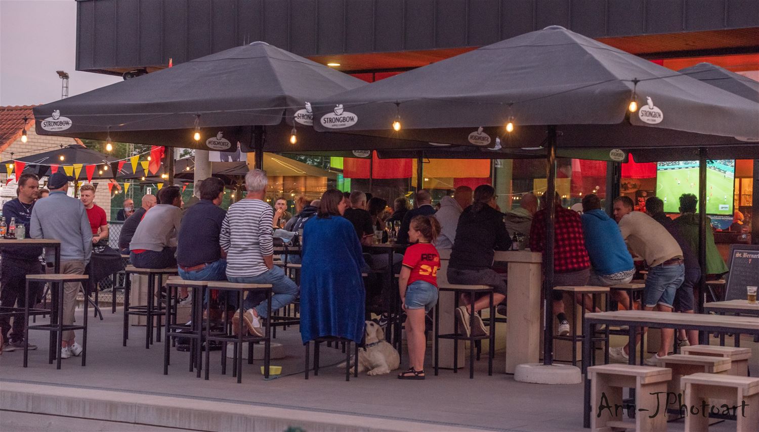 Op verschillende plaatsen troepten de voetbalsupporters samen om samen op een groot scherm de EK-partij van de Rode Duivels te volgen. Zo ook bij Tennis- en Padel Heusden waar op drie plaatsen grote schermen stonden opgesteld zodat het publiek verspreid en met afstand de wedstrijd kon volgen. Er heerste een zomerse sfeer, toch zeker in de eerste helft, nadien was het wachten tot Lukaku kort voor affluiten de temperatuur weer wat omhoog dreef. (foto's Ann Jordens)