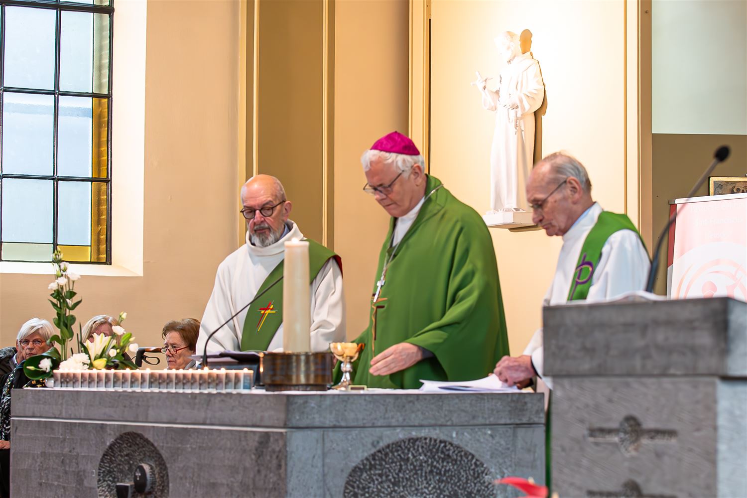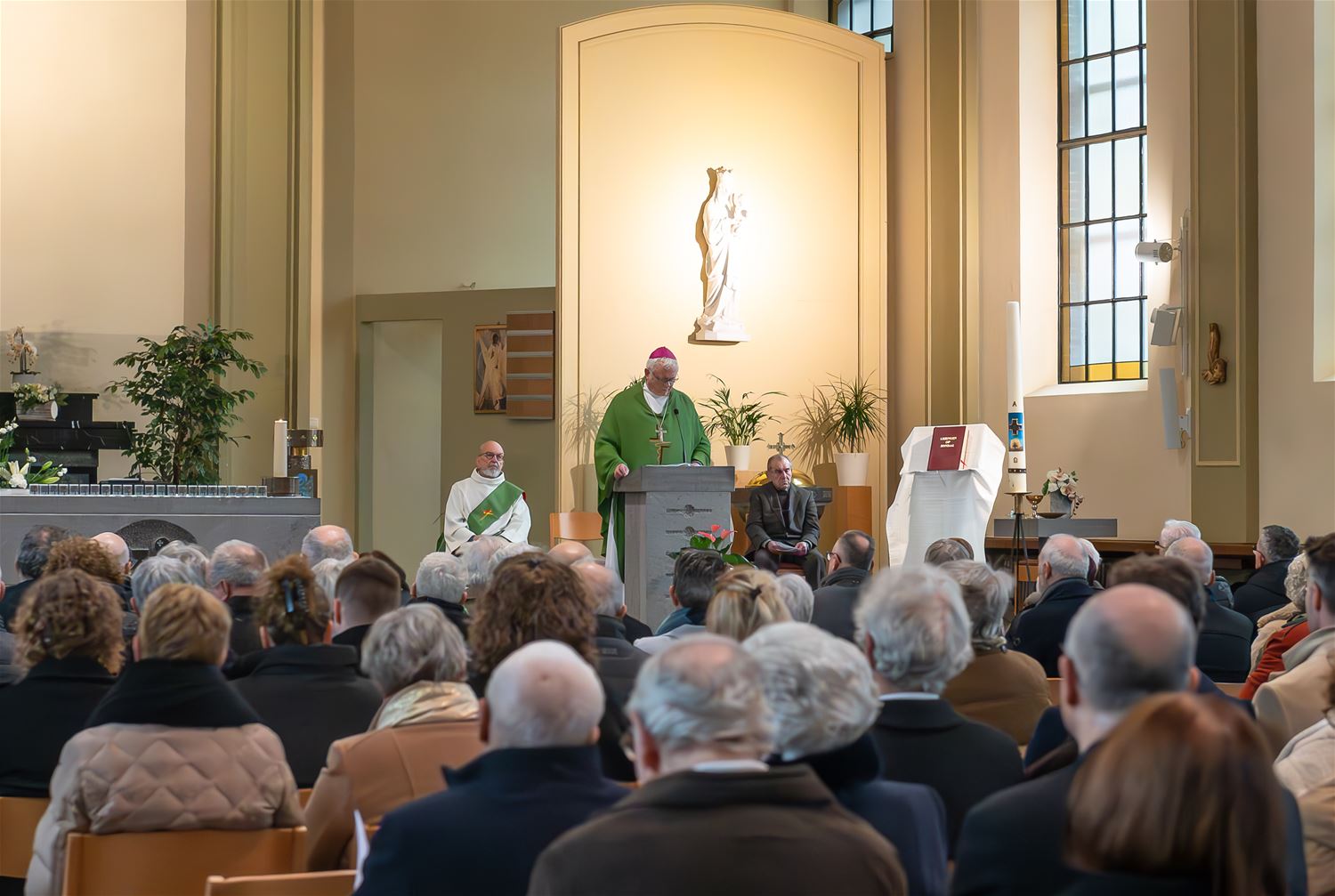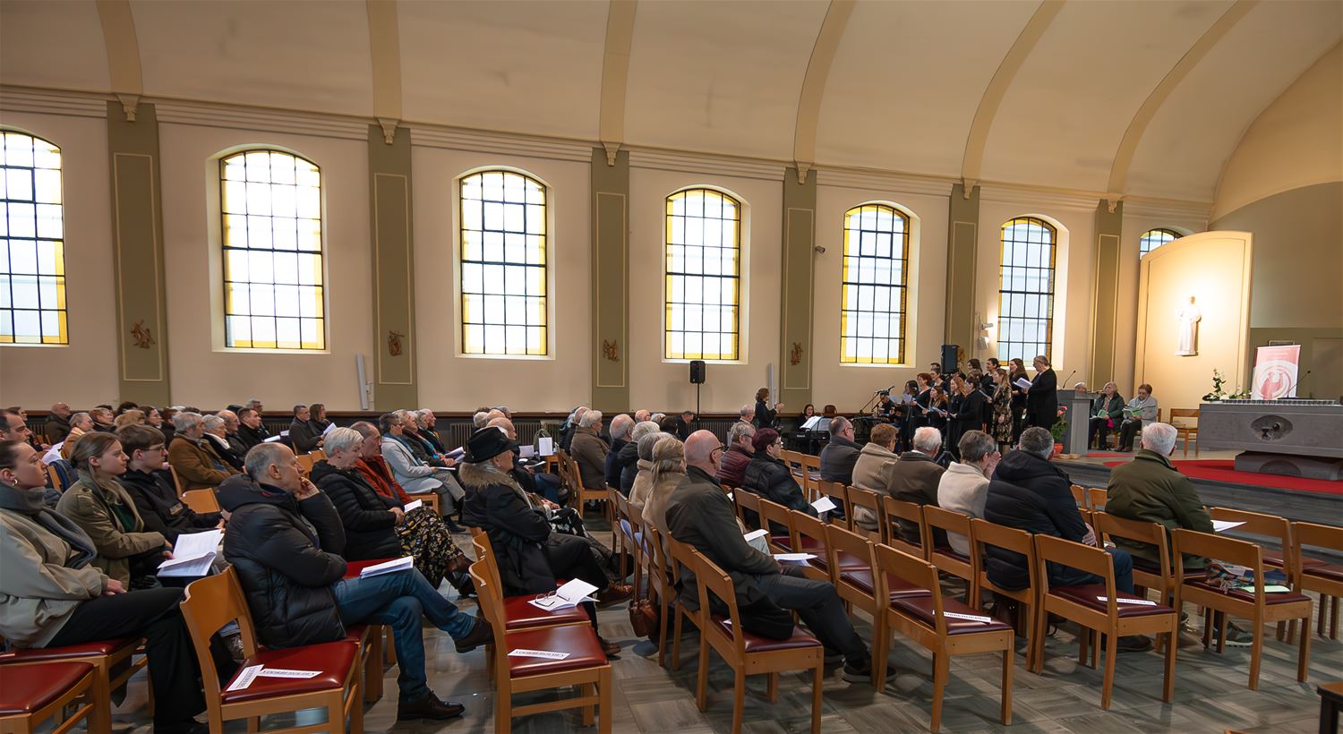 Er was vrij veel volk afgezakt naar de kerk van Berkenbos waar een eucharistieviering werd opgedragen naar aanleiding van de 50ste droeve verjaardag van de collegebrand. Bisschop Patrick Hoogmartens ging voor in de mis met heel wat pakkende momenten en boodschappen. Vooraan op het altaar stonden 23 kaarsjes, één voor elke jongen die het leven liet bij de brand. Er was koozang en tijdens de live-uitvoering van Il Silenzio was het voor de rest muisstil. Jarenlang werd de brand en de gevolgen ervan verdrongen, maar nu is het meer dan ooit de bedoeling om het drama een plaatsje in de geschiedenis te geven. (foto's Roman Martyka)79843