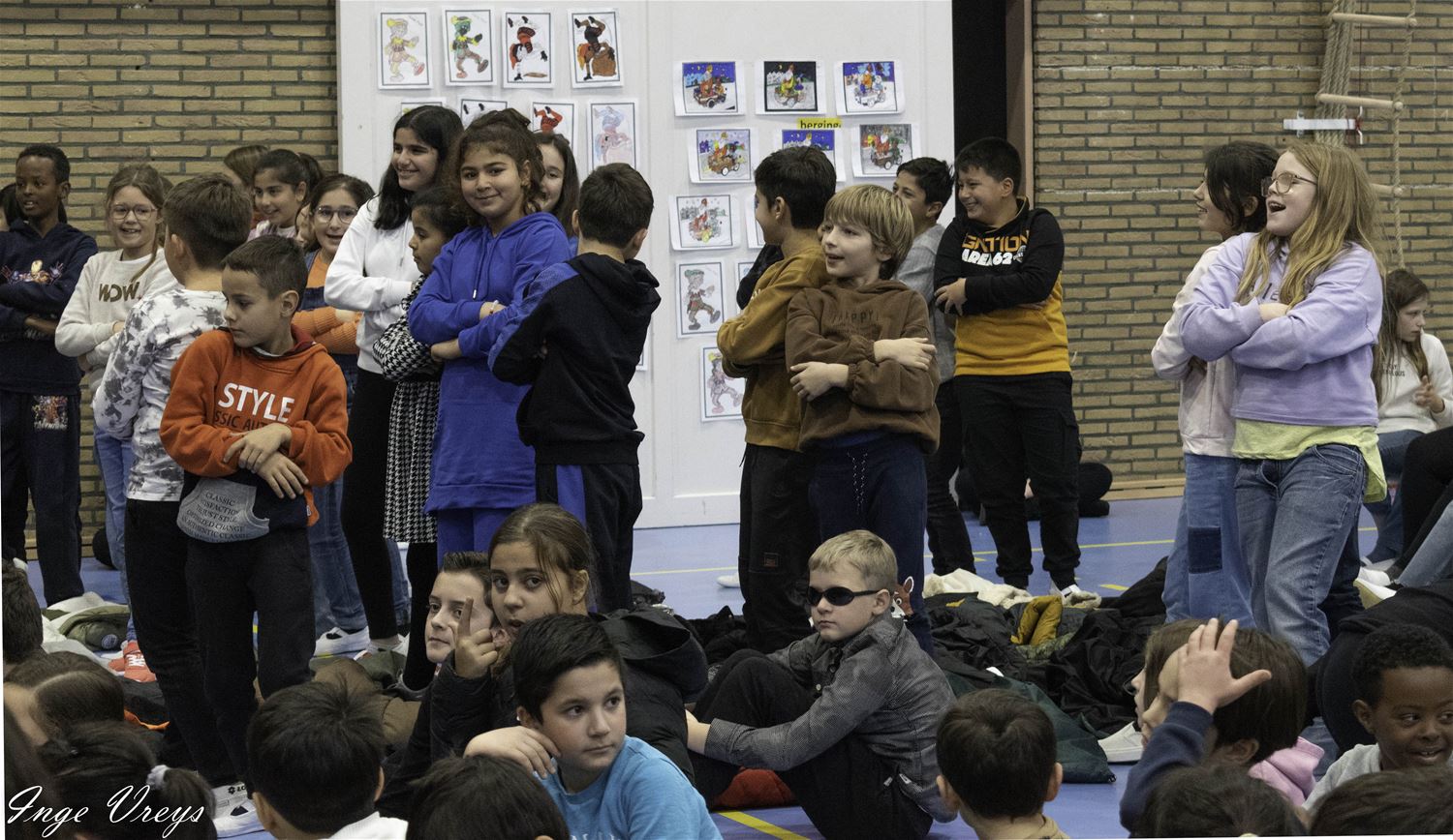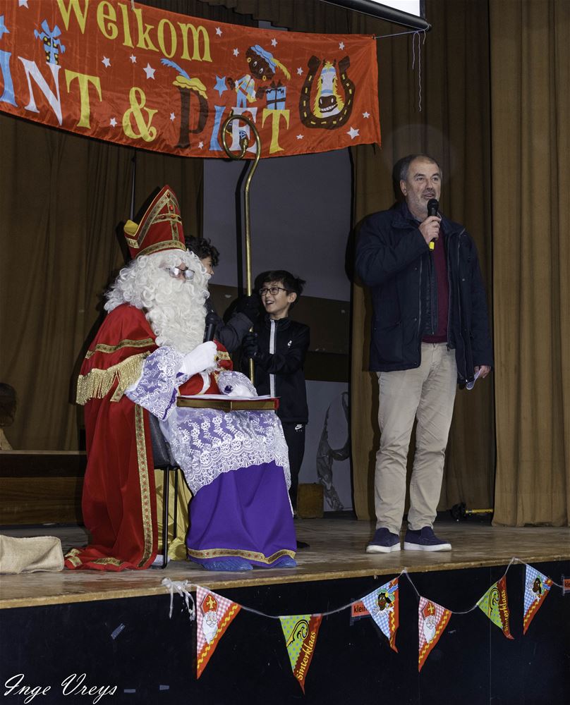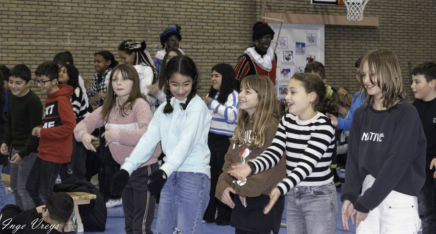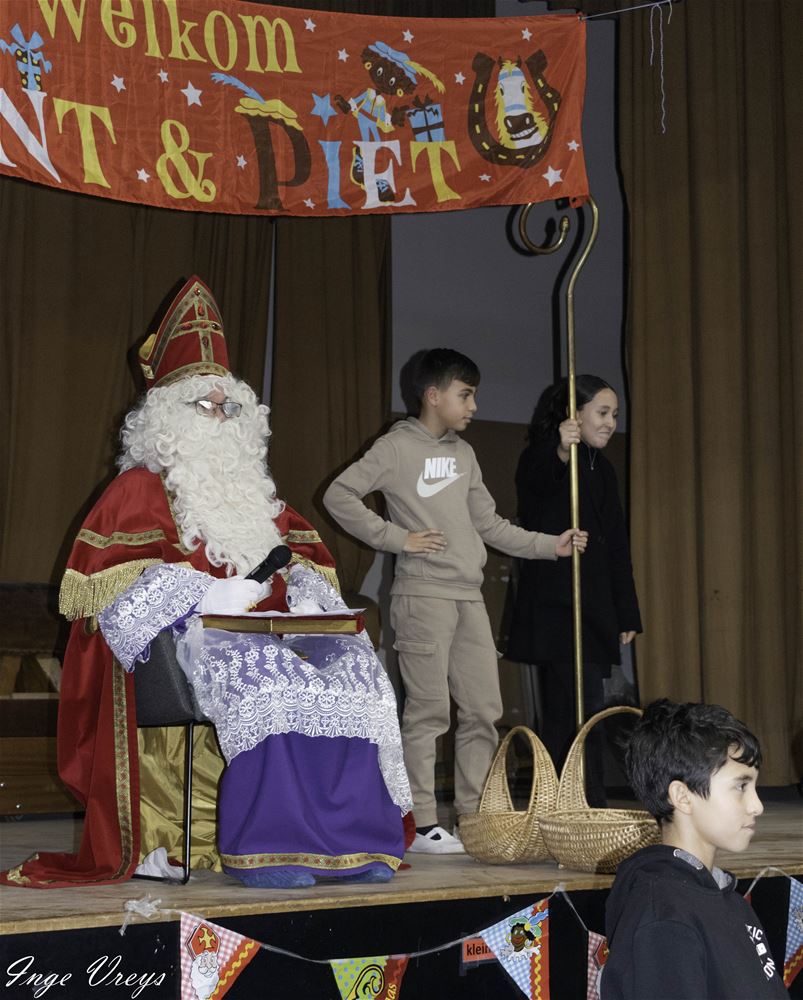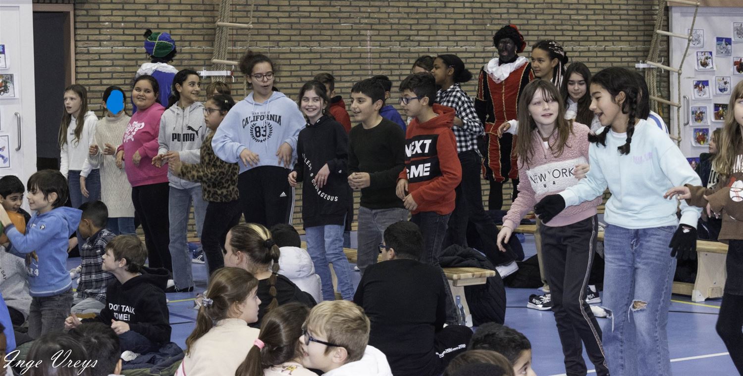 De Sint had het druk vandaag want hij bezocht ook VLS De Brug. Daar had de sportpiet 14 dagen gelogeerd om weer wat fitter te worden, want hij raakte niet meer door de schoorsteen. Maar sportpiet had ook van alles weggehaald uit de klassen, als cadeautje voor de Sint. De kinderen hebben dat dan maar gecompenseerd met een liedje en dansje voor de Sint. (foto's Inge Vreys)76022