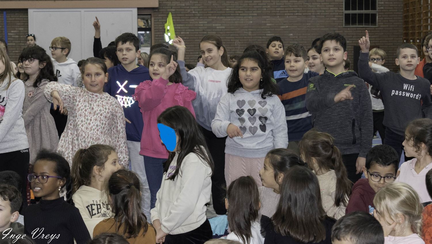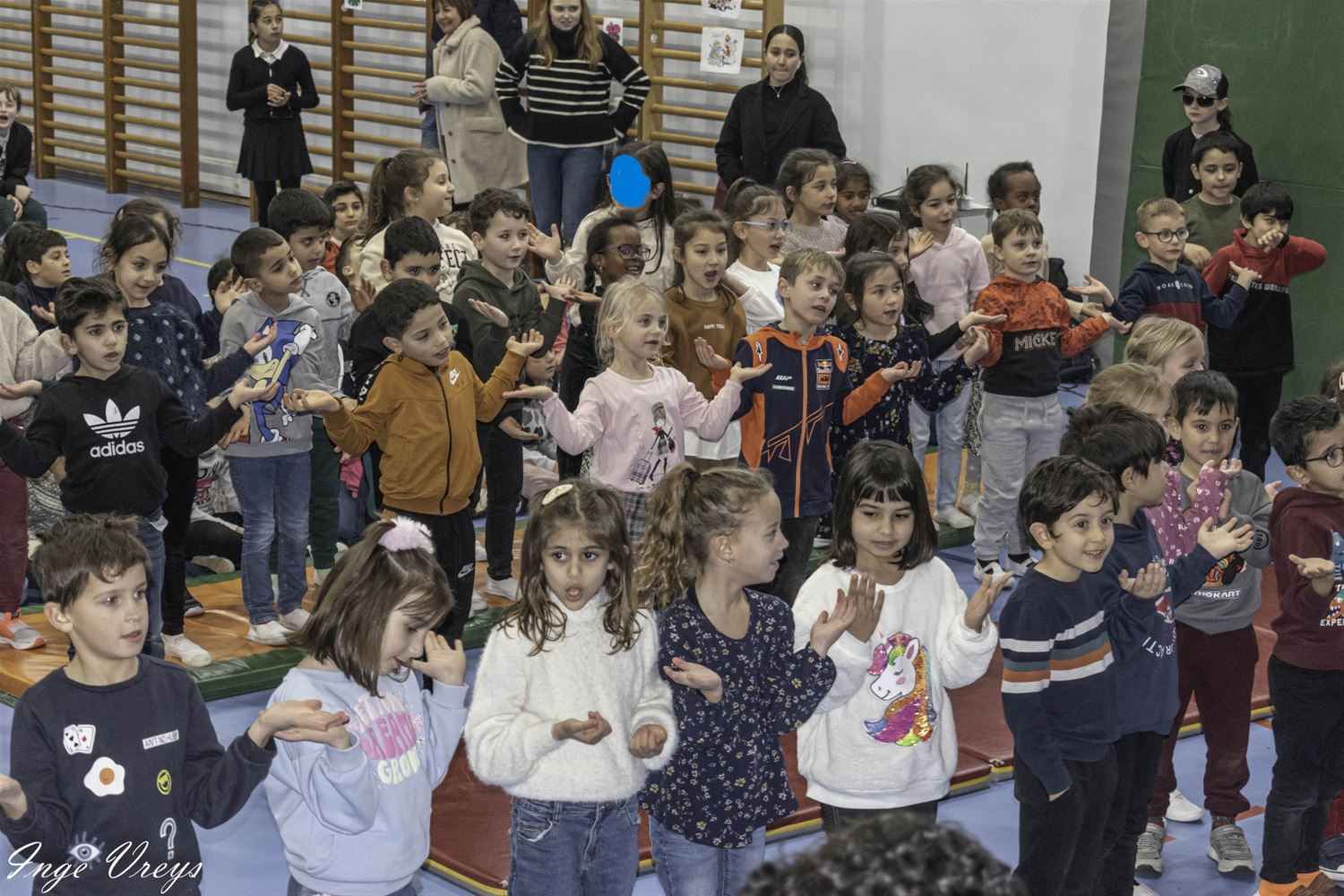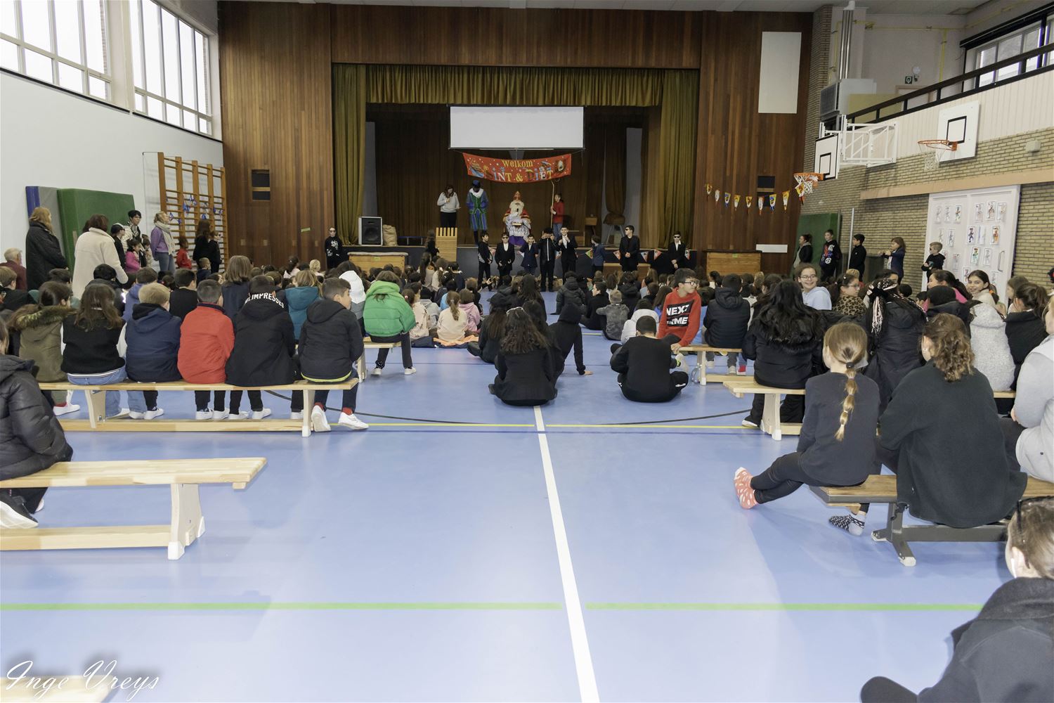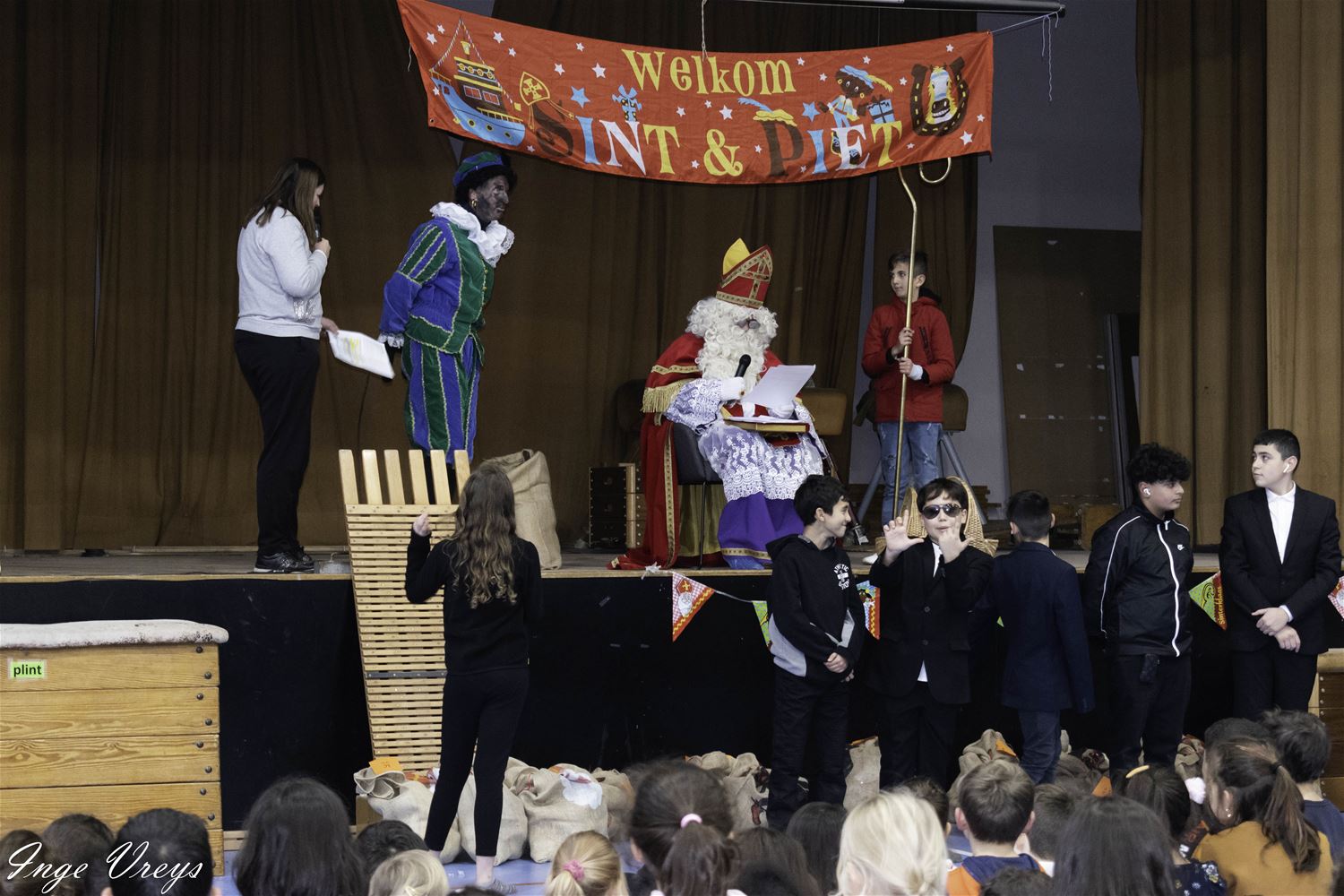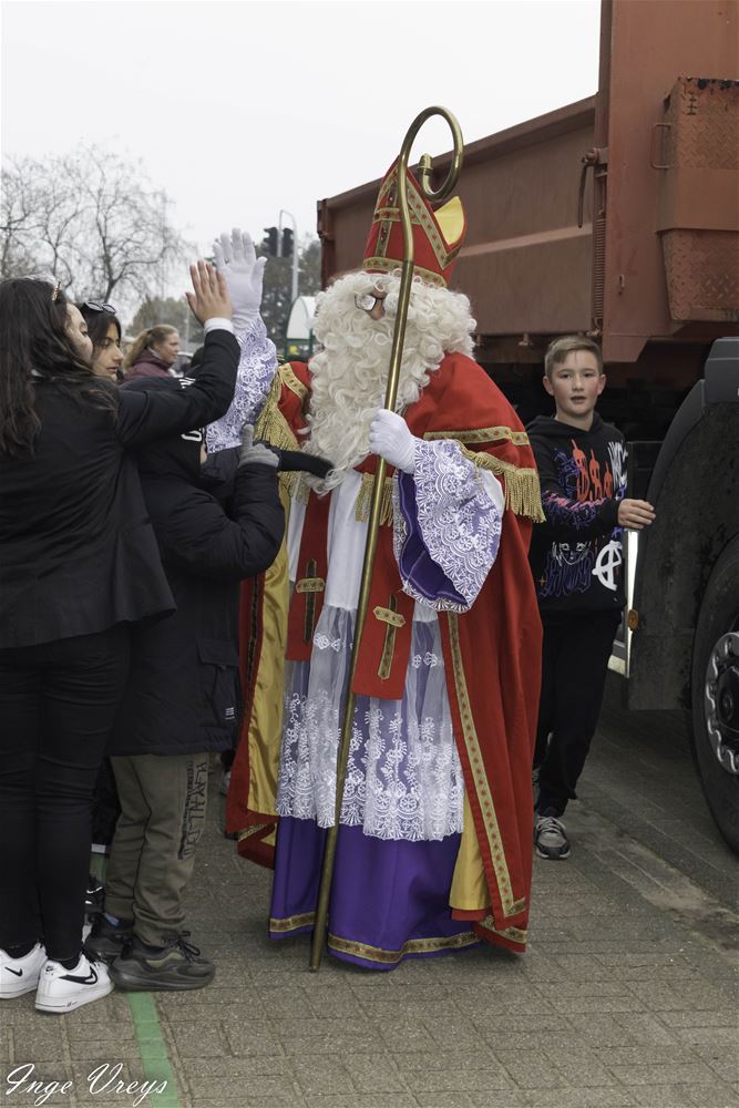 De Sint had het druk vandaag want hij bezocht ook VLS De Brug. Daar had de sportpiet 14 dagen gelogeerd om weer wat fitter te worden, want hij raakte niet meer door de schoorsteen. Maar sportpiet had ook van alles weggehaald uit de klassen, als cadeautje voor de Sint. De kinderen hebben dat dan maar gecompenseerd met een liedje en dansje voor de Sint. (foto's Inge Vreys)76022