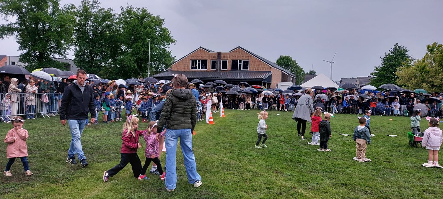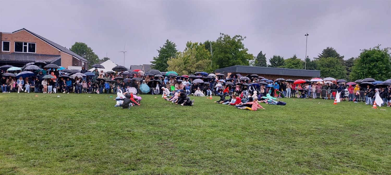 De Springplank zwaaide zaterdag de deuren open voor het jaarlijkse schoolfeest. De bezoekers kreeg een warm muzikaal welkom van de harmonie. Daarna was het de beurt aan de ‘Springers’ die lang geoefend hadden op hun dansjes en kleurrijk waren uitgedost, inclusief mooie kapsels. Ze lieten zich niet ontmoedigen door de regen en maakten er een mooie show van. Jammer dat het slechte weer het achteraf moeilijk maakte om nog wat gezellig na te keuvelen. (foto’s team Springplank)85379