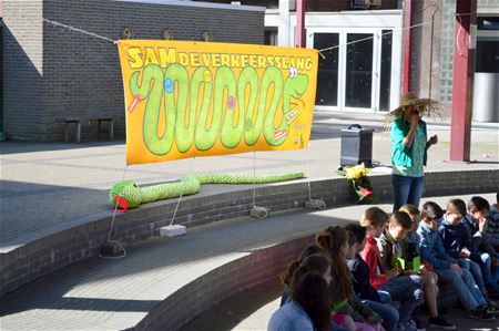De leerlingen van De Brug hadden deze week hun fietsweek. Ze kwamen - ondanks enkele dagen met slecht weer - met de fiets naar school. Als Sam De Slang werd volgeplakt met uitgevoerde opdrachten, stonden dan ook beloningen op het spel zoals een bal, een film bekijken, extra speeltijd, zonder boekentas naar huis en vanmiddag ... een ijsje. Er is ook hard gewerkt aan de fietsvaardigheden en de leerlingen van het zesde legden hun fietsexamen af. (foto's Inge Vreys)34335
