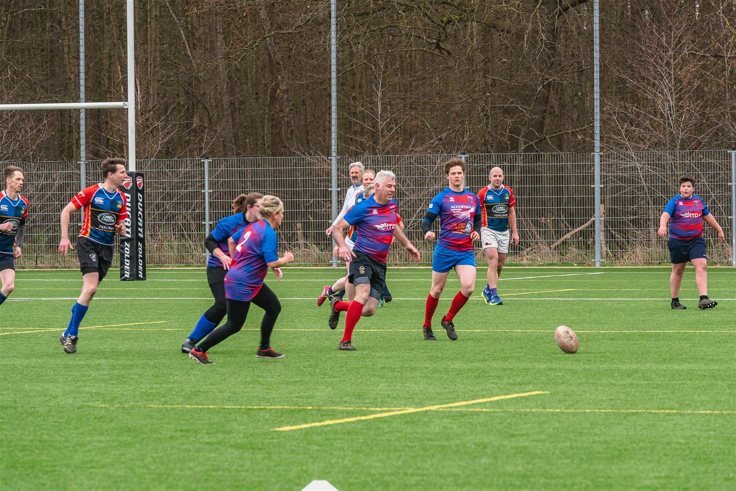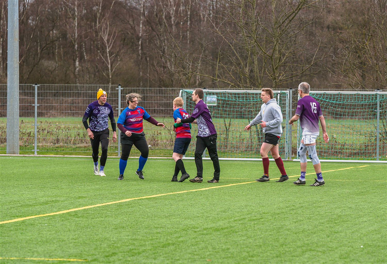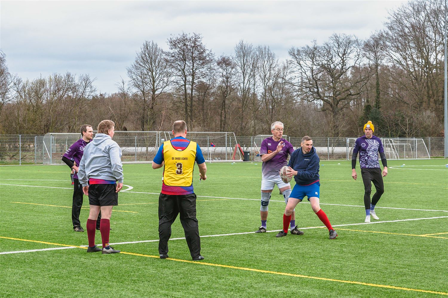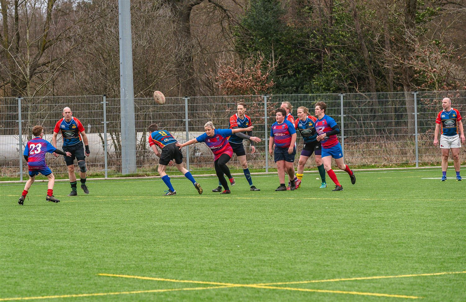 Zowel voor de spelers als de toeschouwers van rugbyclub RC9 was het even wennen vandaag, tijdens de allereerste partij T1-Rugby. Wageninge, de Nederlandse kampioen in deze softversie van het klassieke rugby kwam een demowedstrijd tegen een lokale selectie spelen. Daarbij wordt er niet meer geduwd en getrokken en al zeker niemand meer tegen de vlakte gewerkt. Spelers tikken elkaar aan om de bal te veroveren. Een ideaal spel voor spelers die het niet zo graag ruw hebben of die proberen blessures te vermijden. Of we hier een competitievariant moeten verwachten, weten we niet maar het was vandaag wel een ludiek gebeuren op de Vrijheidsite. (foto’s Ann Jordens)87908
