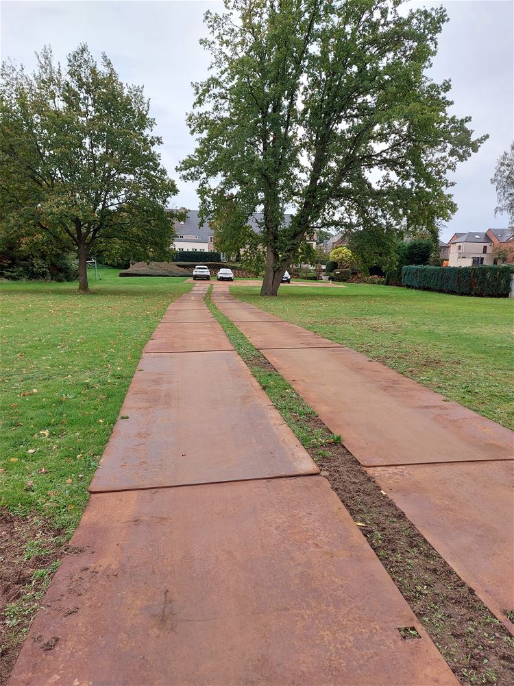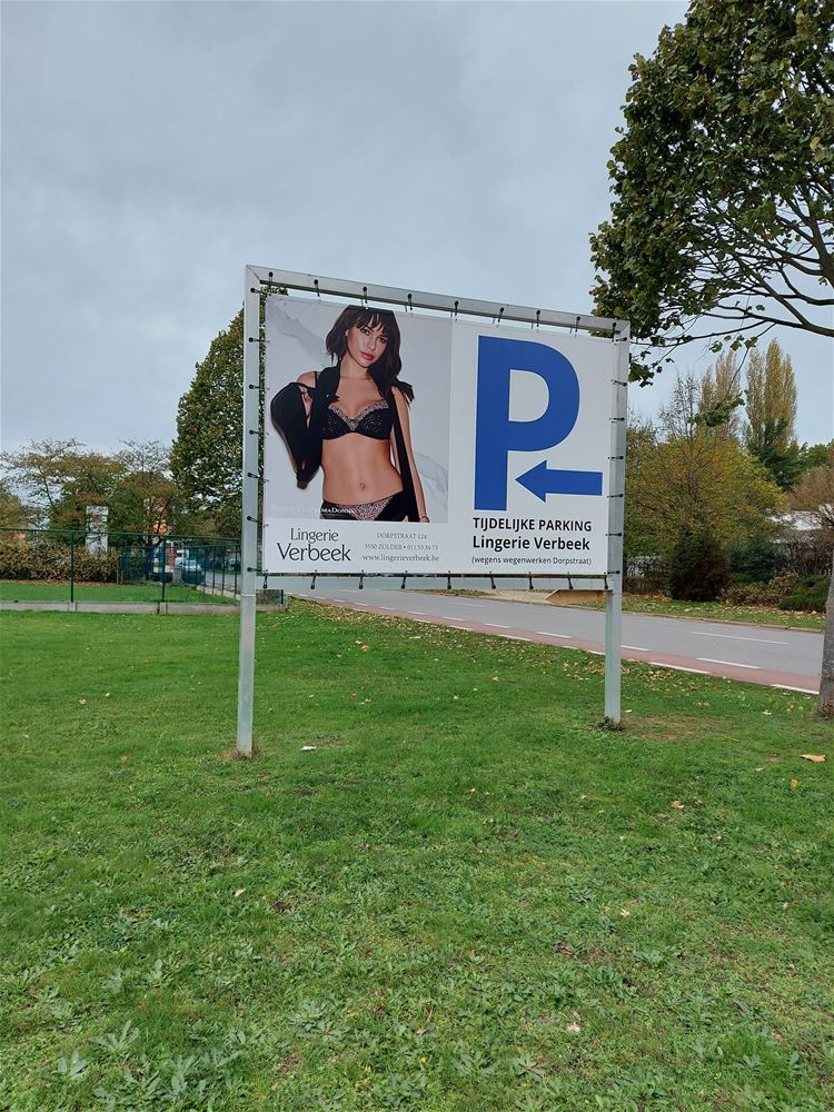 De wegenwerken in het centrum van Zolder hebben letterlijk en figuurlijk al heel wat stof doen opwaaien. Maar niet iedereen blijft bij de pakken zitten. Zo bedacht Lingerie Verbeek in de Dorpsstraat een creatieve oplossing om toch bereikbaar te blijven. Aan de achterzijde van de winkel, langs de Ringlaan, werd een tijdelijke parking aangelegd voor de klanten, aangegeven met een opvallende banner en wegwijzers en verhard met grondplaten.75999