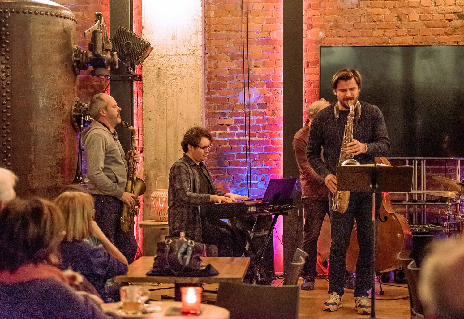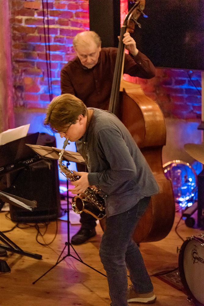 Zondagavond werd het MuzeCafé weer volgeblazen met jazzklanken tijdens 'MJO invites Tom Van Dyck'. Saxofonist Tom Van Dyck had vader en zoon Verbist (bas en piano) en drummer Wim Eggermont meegebracht om zich samen op nummers uit Andalusië en van Joe Henderson te storten. En nadien volgde de onvermijdelijke jamsessie. (foto's Ann Jordens)76626