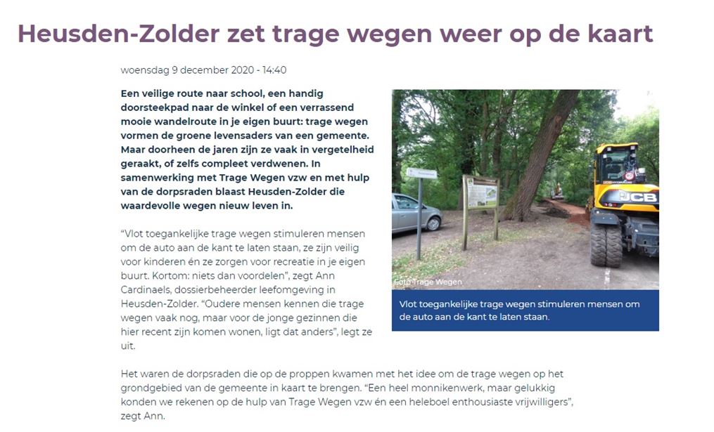In de nieuwste editie van het digitaal magazine 'Gemeente voor de Toekomst' wordt onder de rubriek 'inspiratie en voorbeelden' het trage wegenbeleid van de gemeente Heusden-Zolder in de kijker gezet. De gemeente steekt daarin trouwens alle pluimen niet op de eigen hoed en wijst naar de inspiratie gebracht door de dorpsraden en de ondersteuning van de vzw Trage Wegen. Er wordt gewezen naar de functionele rol die trage wegen kunnen vervullen voor het schoolverkeer, om te gaan winkelen of puur voor de recreatie. De lockdowns hebben de mensen terug naar de natuur en de zachte recreatie gelokt, dat past dus perfect in dat Trage Wegen plaatje. 66907