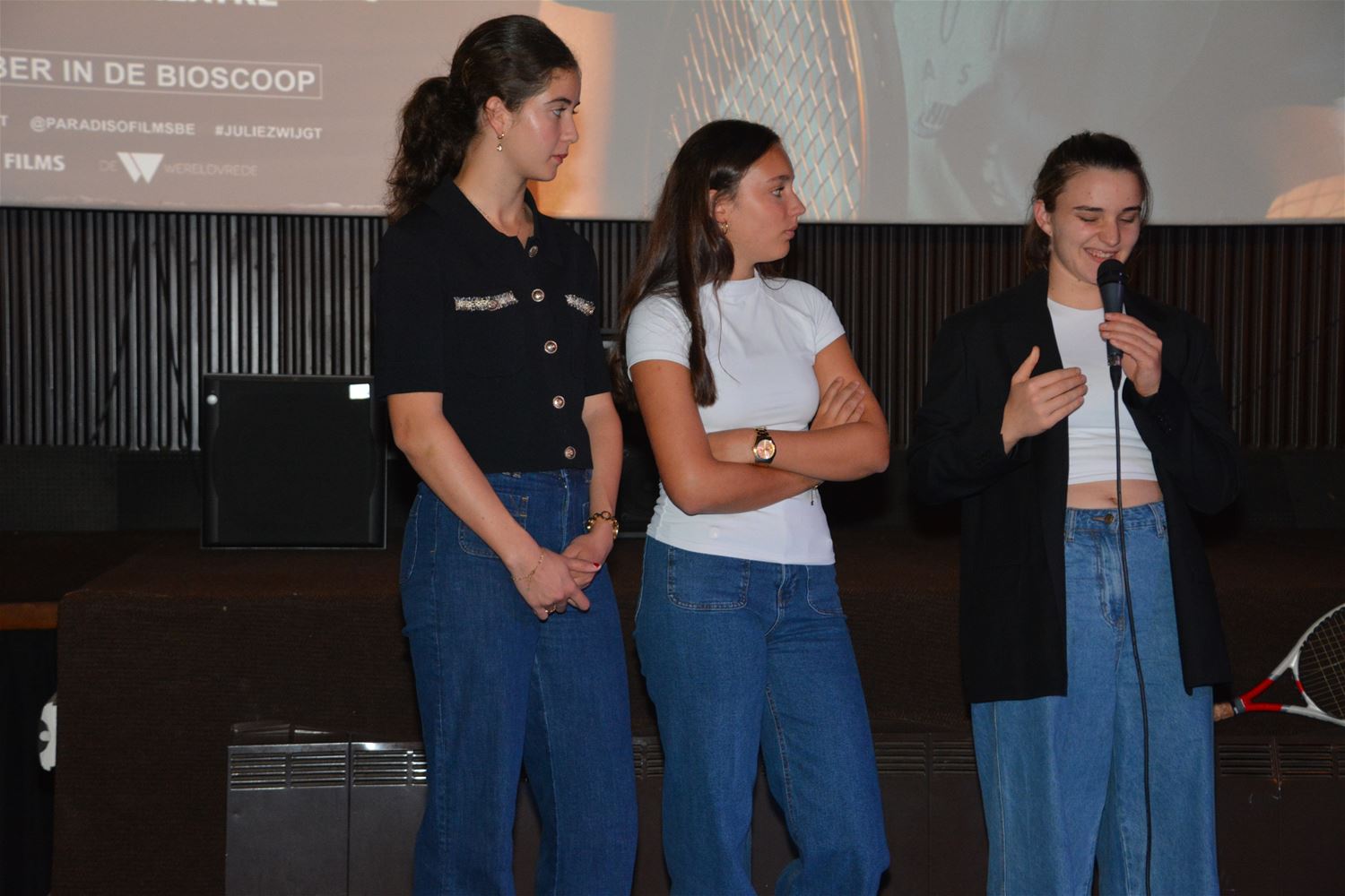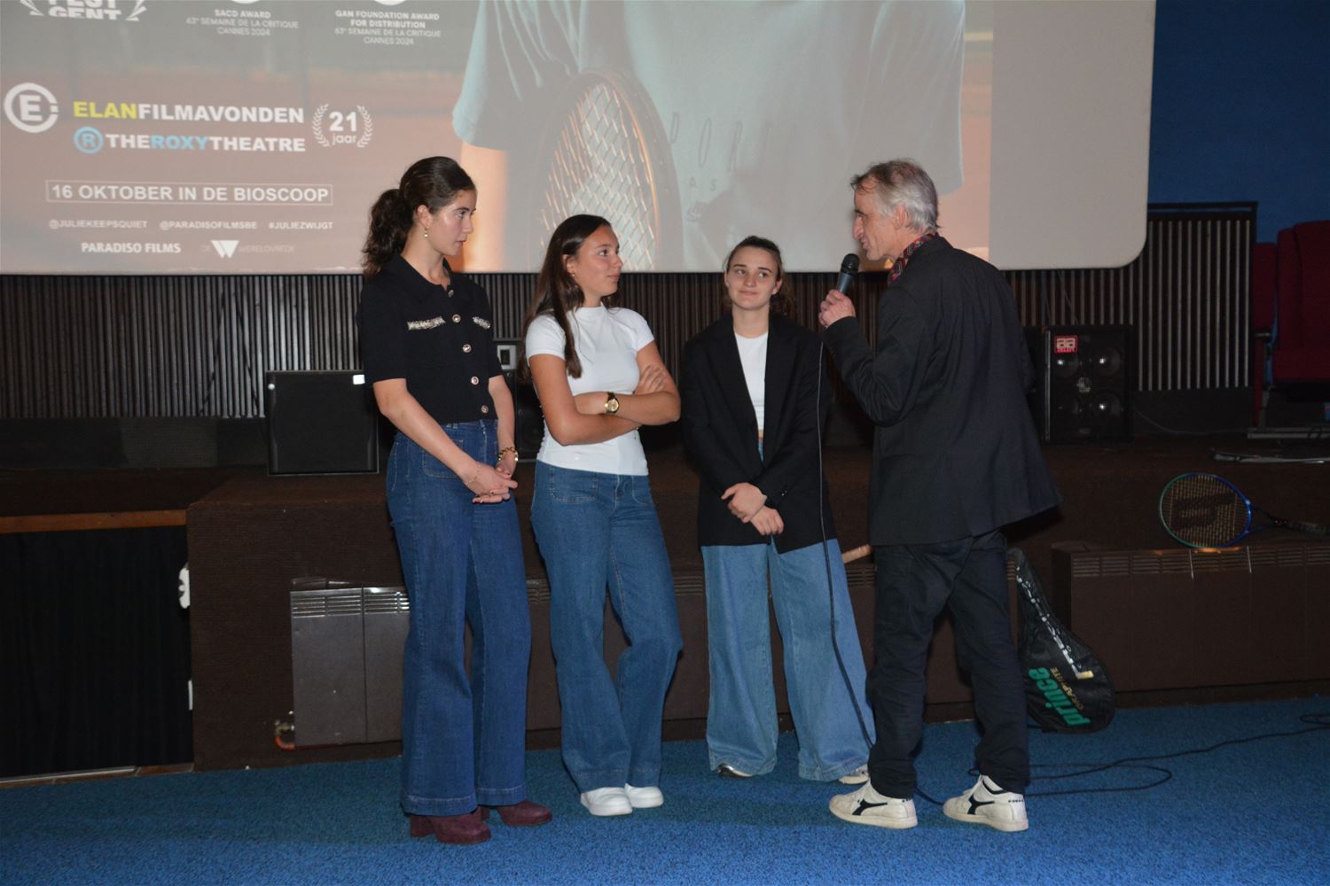 De ElaN Filmavonden mochten vanavond in The Roxy Theatre twee volle zalen filmliefhebbers verwelkomen voor de avant-première van 'Julie Zwijgt'. Voor de film had een gesprek plaats met hoofdactrice Tessa Van den Broeck en twee mede-actrices/vriendinnen. De film gaat het stilzwijgende lijden van een jonge tennisspeelster onder het misbruik van haar trainer. Tessa en co zijn trouwens echt tennissters zodat ze op dat vlak alleszins niet moesten gecoacht worden. Regisseur Leonardo Van Dijl vertelde dat hij dit verhaal moest brengen omdat het nog niet verteld was. De prent sleepte al twee prijzen in de wacht op het filmfestival van Cannes en is de Belgische inzending voor de Oscars 2025. Leonardo Van Dijl riep het publiek op om het verhaal door te vertellen, het zal voor hem een boost voor zijn zelfvertrouwen zijn om de boodschap ook in de States te verkondigen. De film is alvast aangeslagen bij toptennisster Naomi Osaka. Tijdens de US Open nodigde zij Tessa Van den Broeck uit voor een ontmoeting. Osaka, die zelf met mentale problemen kampte, vond in 'Julie Zwijgt' blijkbaar een herkenbare boodschap.83422