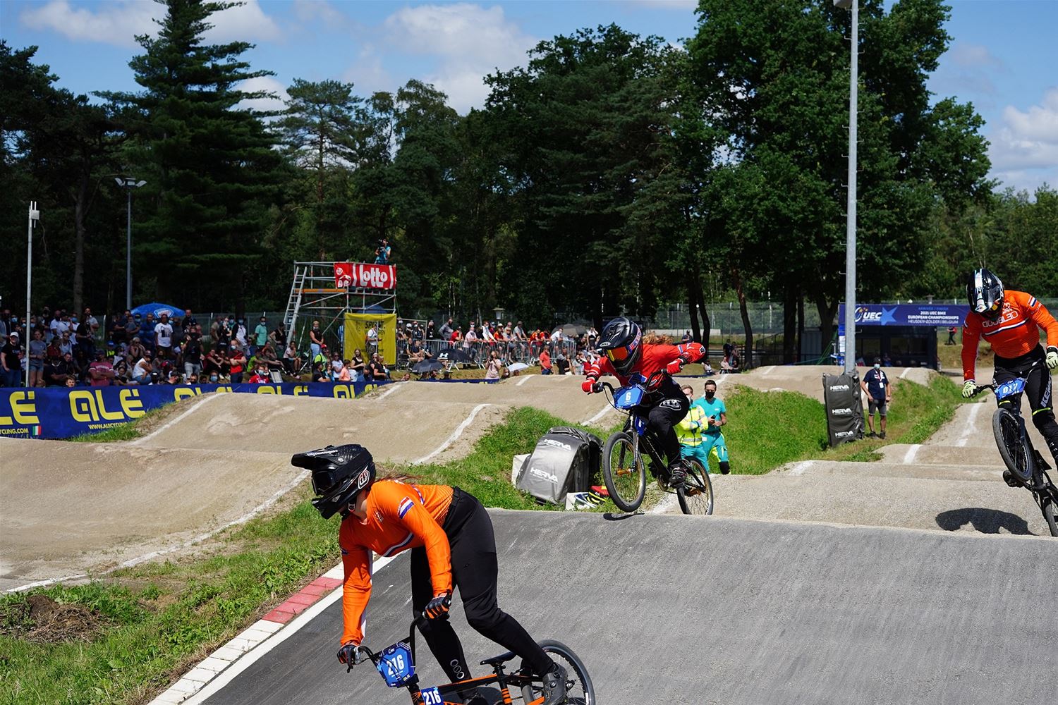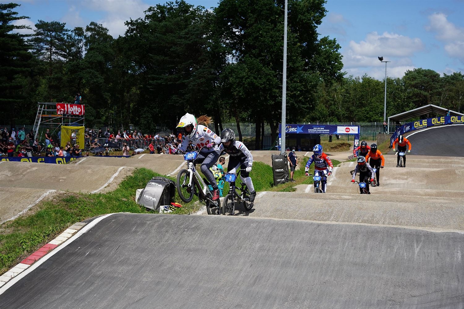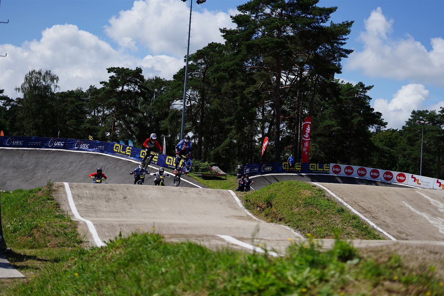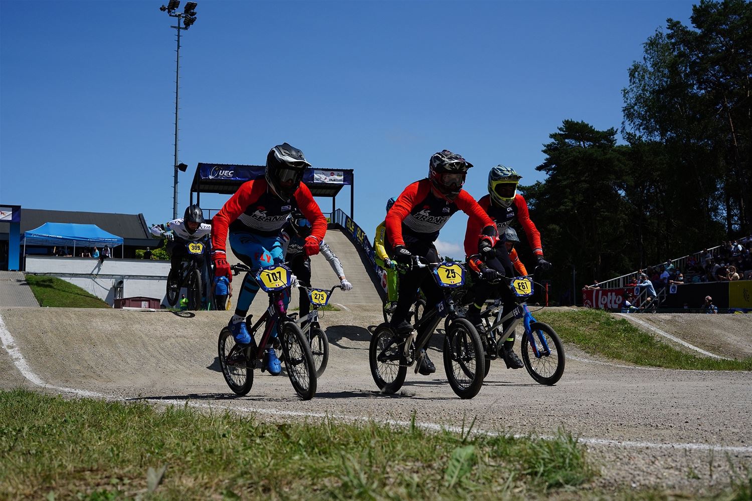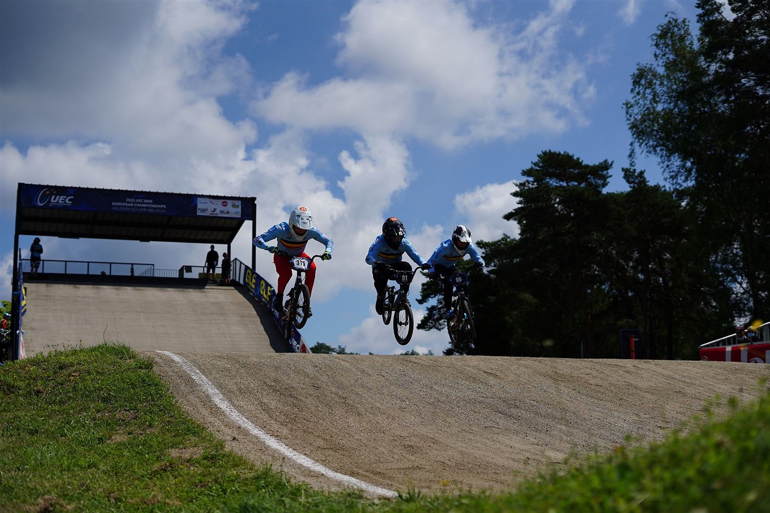 Het EK BMX kon vandaag heel de dag rekenen op stralend weer, er waren dan ook heel wat toeschouwers opgedaagd. En die kregen waar voor hun geld. Zo werd vandaag een jonge discipline opgevoerd: de ploegentijdrit. Daarin nemen telkens drie renners per land het tegen elkaar op. En Belgie mocht juichen, want zowxel de dames als de heren behaalden zilver. Bij de vrouwen verdedigden Elke Vanhoof, Aiko Gommers en Robyn Gommers de Belgische kleuren. Bij de mannen was gekozen voor een jong team, maar Thibaut Stoffels, Wannes Magdelijns en Jools Melis overtroffen de verwachtingen en werden dus tweede. De titel ging twee keer naar Frankrijk, dat dus erg tevreden mag terugblikken op de Europese kampioenschappen. (foto's Stephan Volders)70067