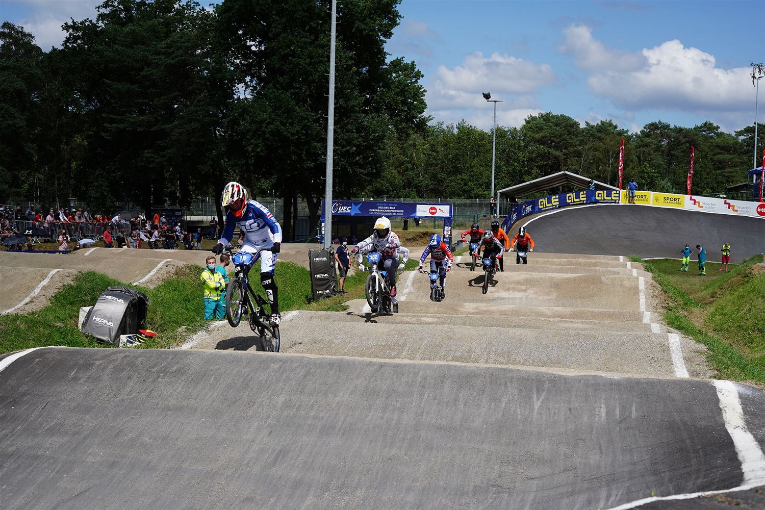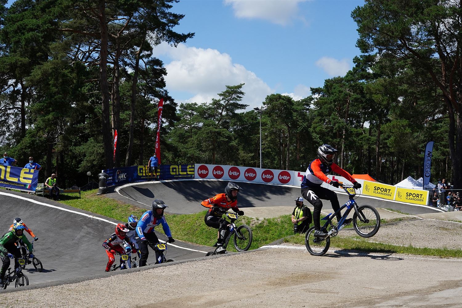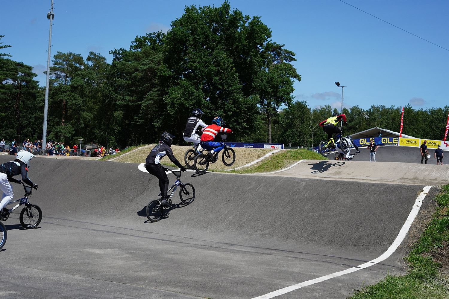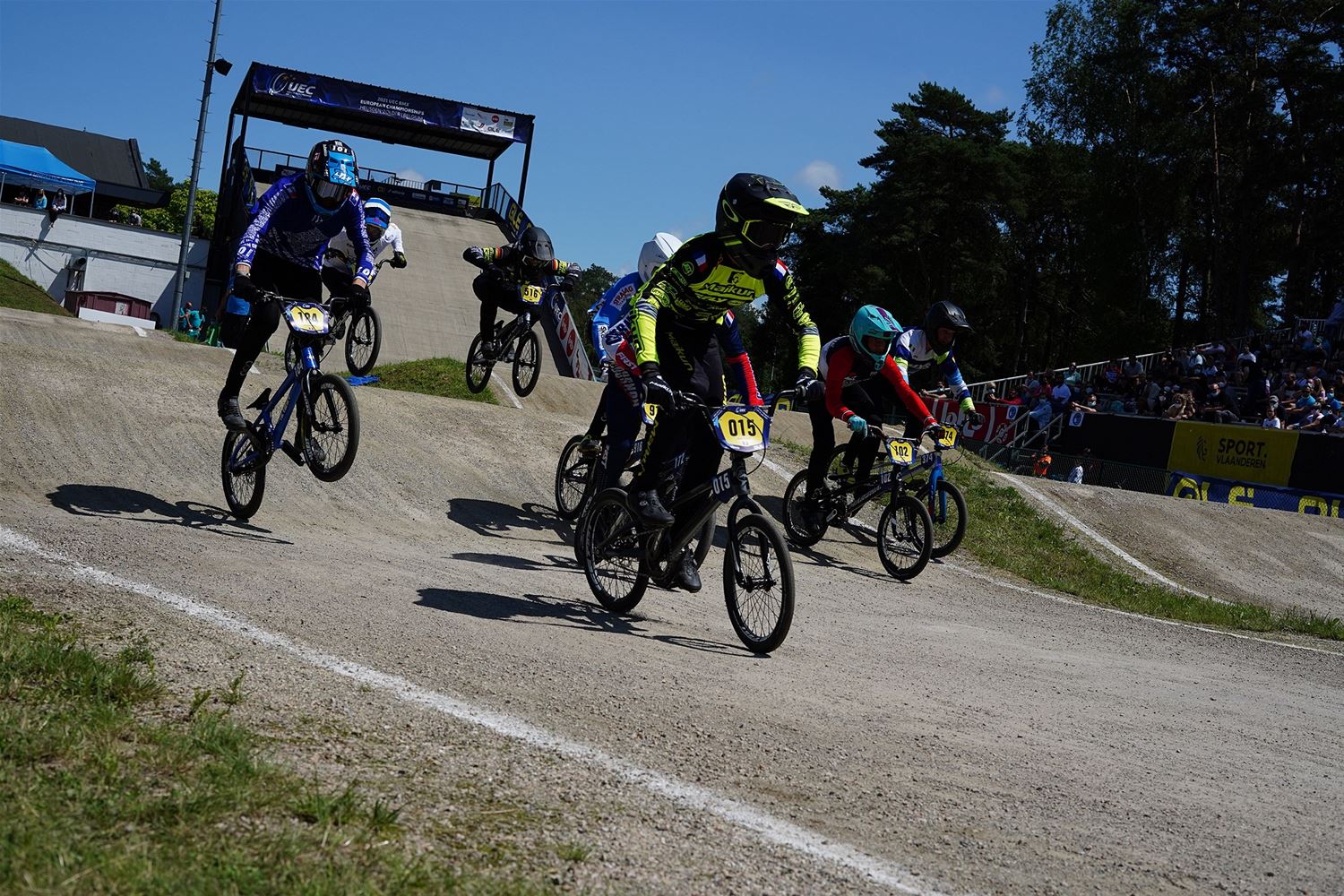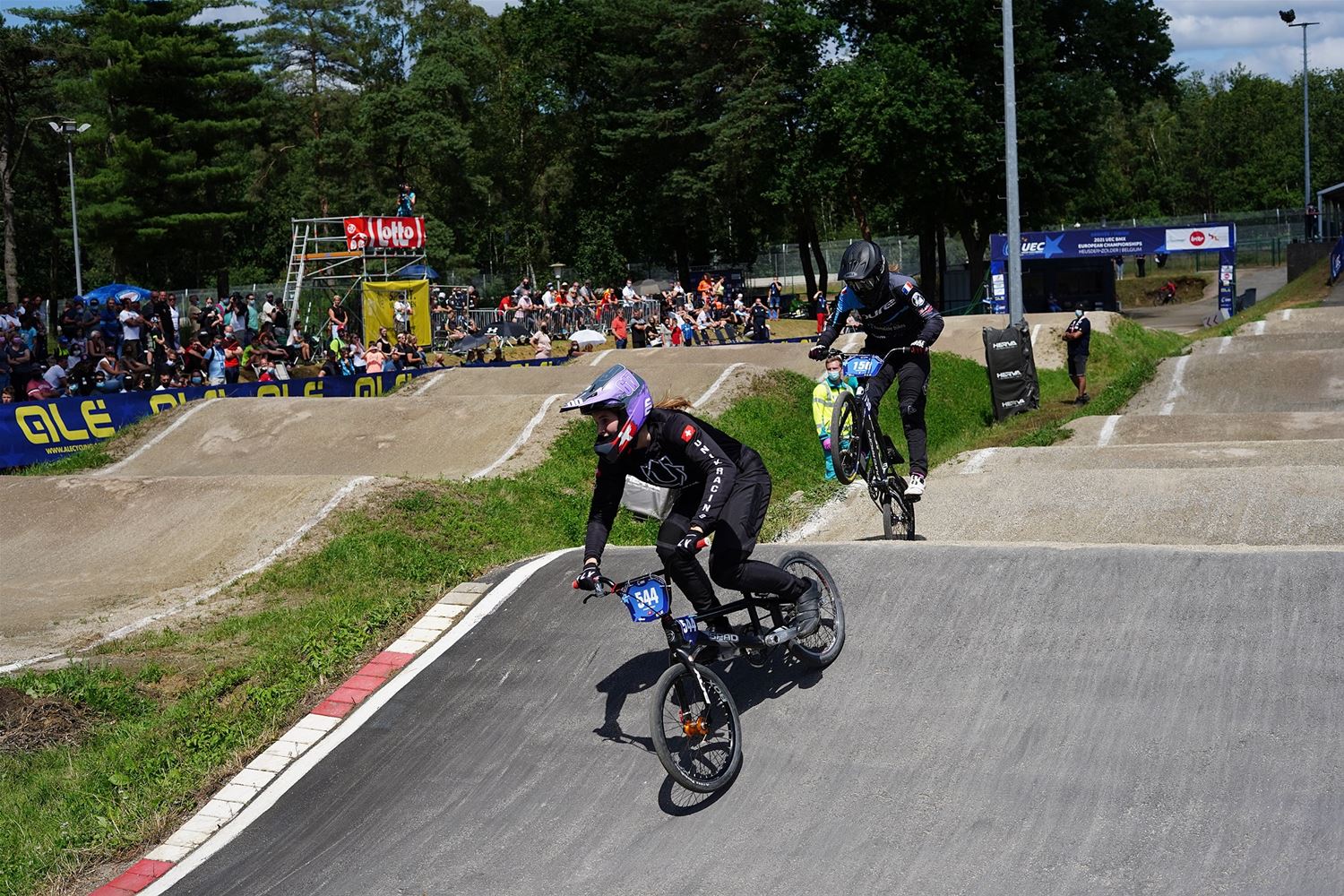 Het EK BMX kon vandaag heel de dag rekenen op stralend weer, er waren dan ook heel wat toeschouwers opgedaagd. En die kregen waar voor hun geld. Zo werd vandaag een jonge discipline opgevoerd: de ploegentijdrit. Daarin nemen telkens drie renners per land het tegen elkaar op. En Belgie mocht juichen, want zowxel de dames als de heren behaalden zilver. Bij de vrouwen verdedigden Elke Vanhoof, Aiko Gommers en Robyn Gommers de Belgische kleuren. Bij de mannen was gekozen voor een jong team, maar Thibaut Stoffels, Wannes Magdelijns en Jools Melis overtroffen de verwachtingen en werden dus tweede. De titel ging twee keer naar Frankrijk, dat dus erg tevreden mag terugblikken op de Europese kampioenschappen. (foto's Stephan Volders)70067