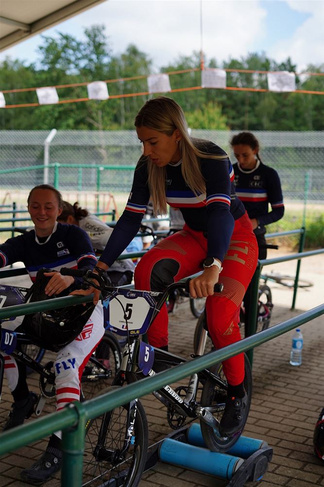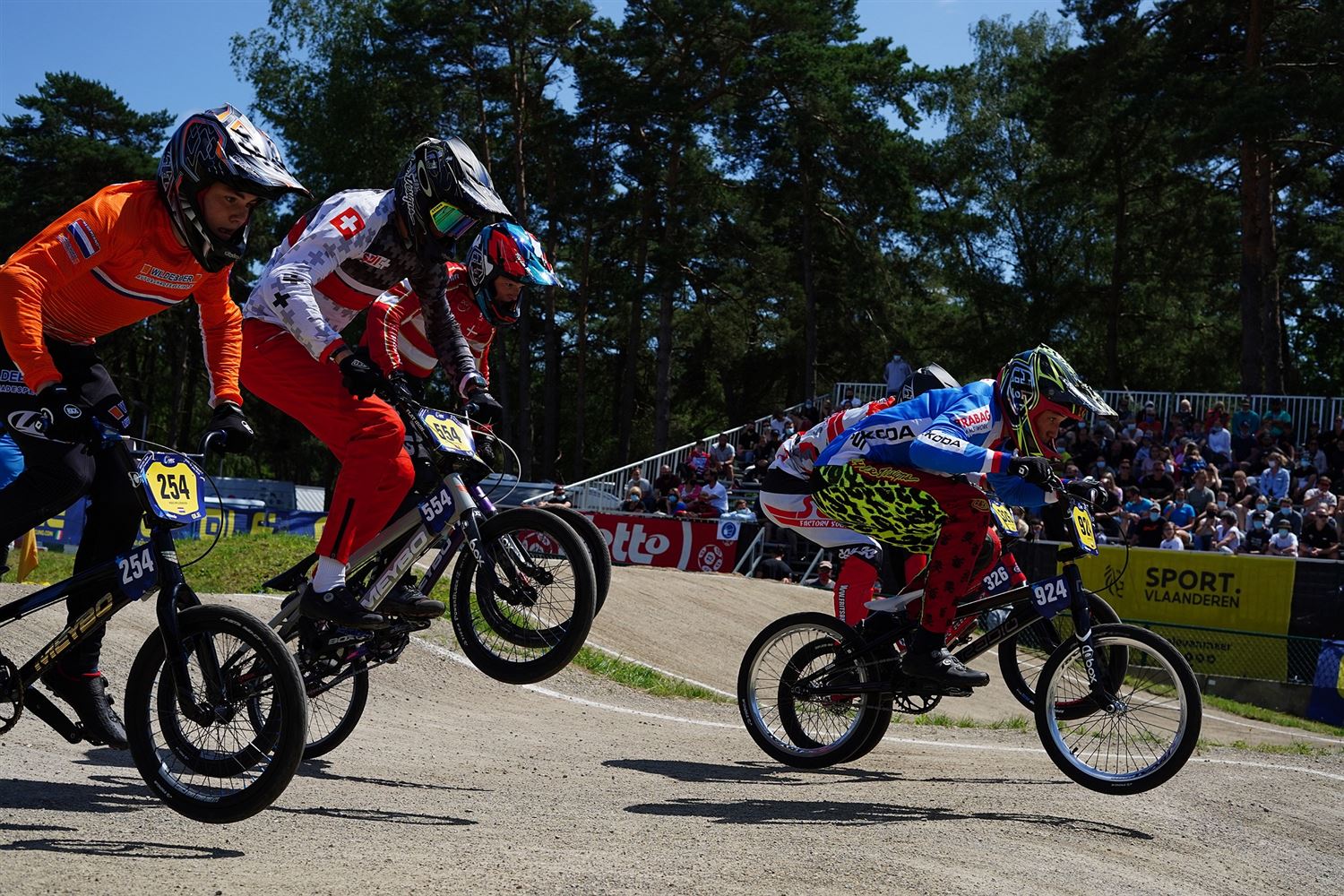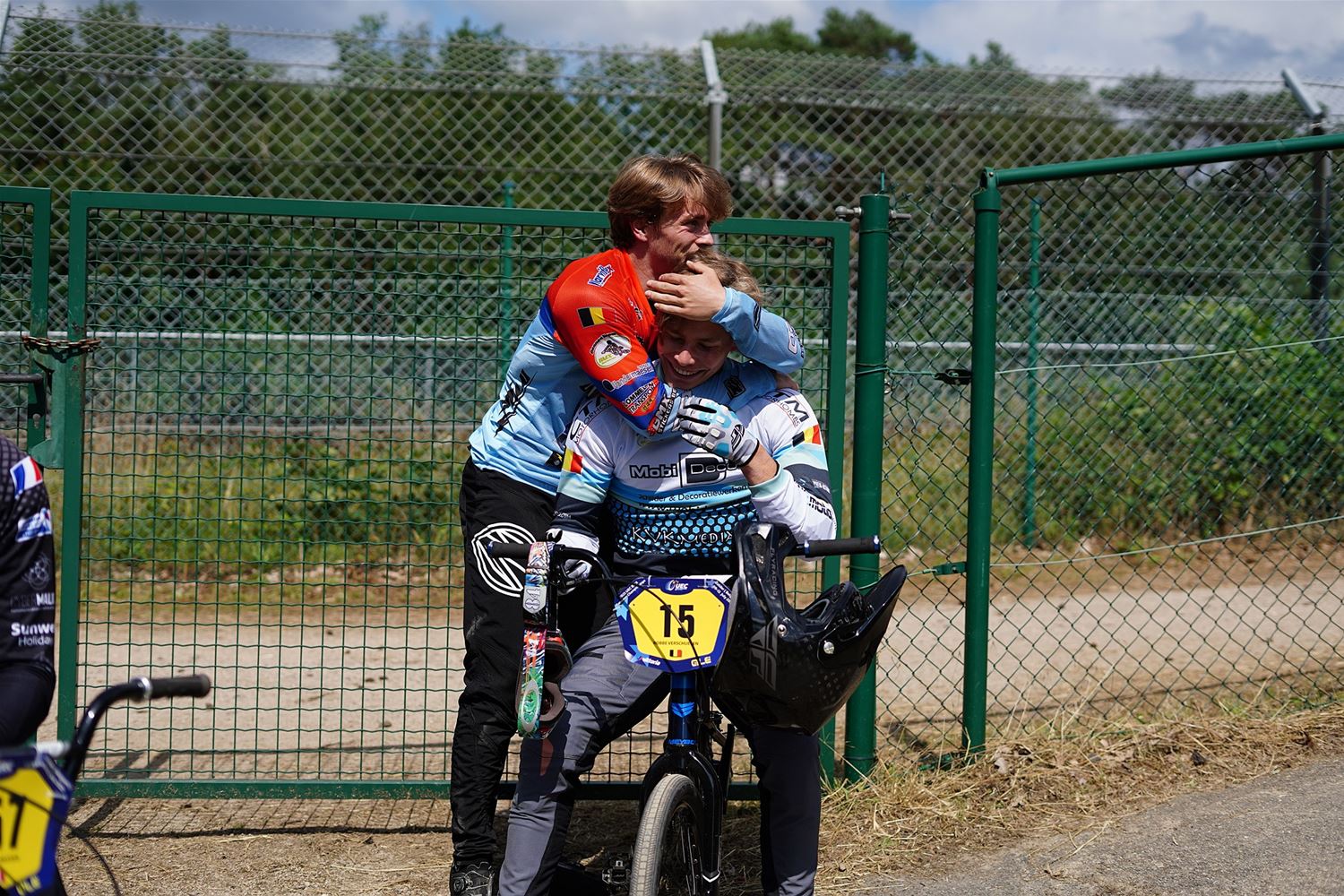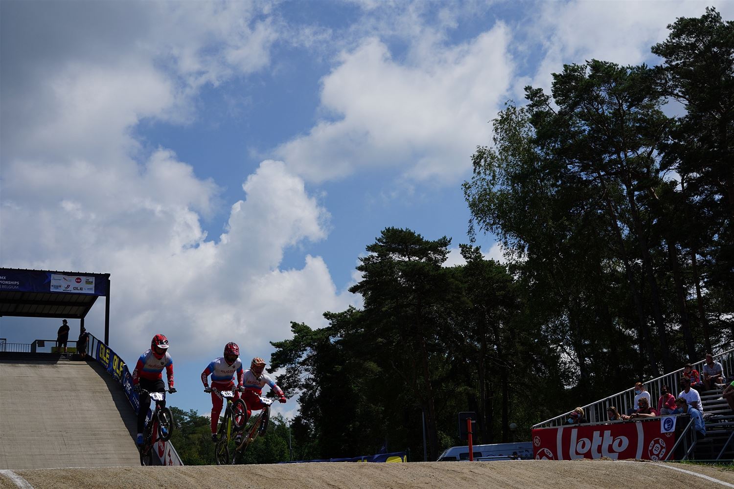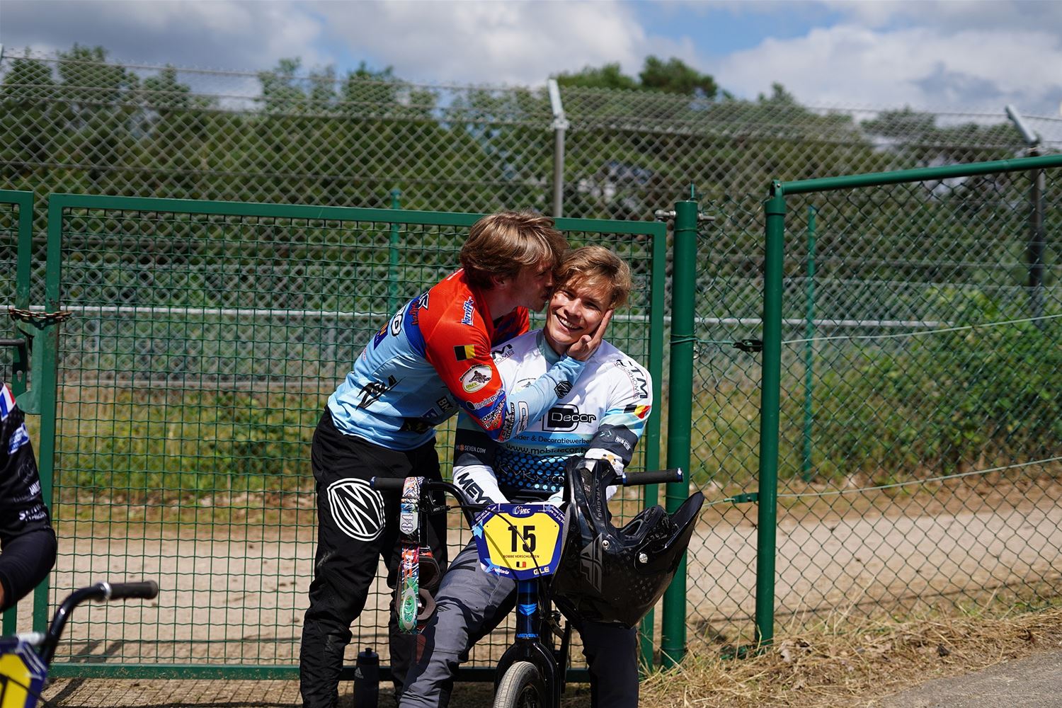 Het EK BMX kon vandaag heel de dag rekenen op stralend weer, er waren dan ook heel wat toeschouwers opgedaagd. En die kregen waar voor hun geld. Zo werd vandaag een jonge discipline opgevoerd: de ploegentijdrit. Daarin nemen telkens drie renners per land het tegen elkaar op. En Belgie mocht juichen, want zowxel de dames als de heren behaalden zilver. Bij de vrouwen verdedigden Elke Vanhoof, Aiko Gommers en Robyn Gommers de Belgische kleuren. Bij de mannen was gekozen voor een jong team, maar Thibaut Stoffels, Wannes Magdelijns en Jools Melis overtroffen de verwachtingen en werden dus tweede. De titel ging twee keer naar Frankrijk, dat dus erg tevreden mag terugblikken op de Europese kampioenschappen. (foto's Stephan Volders)70067