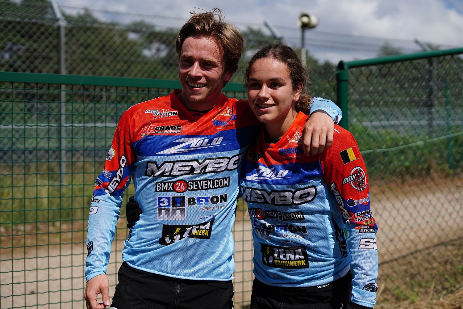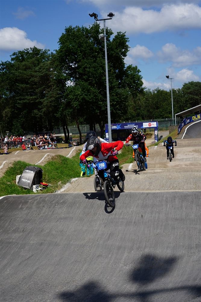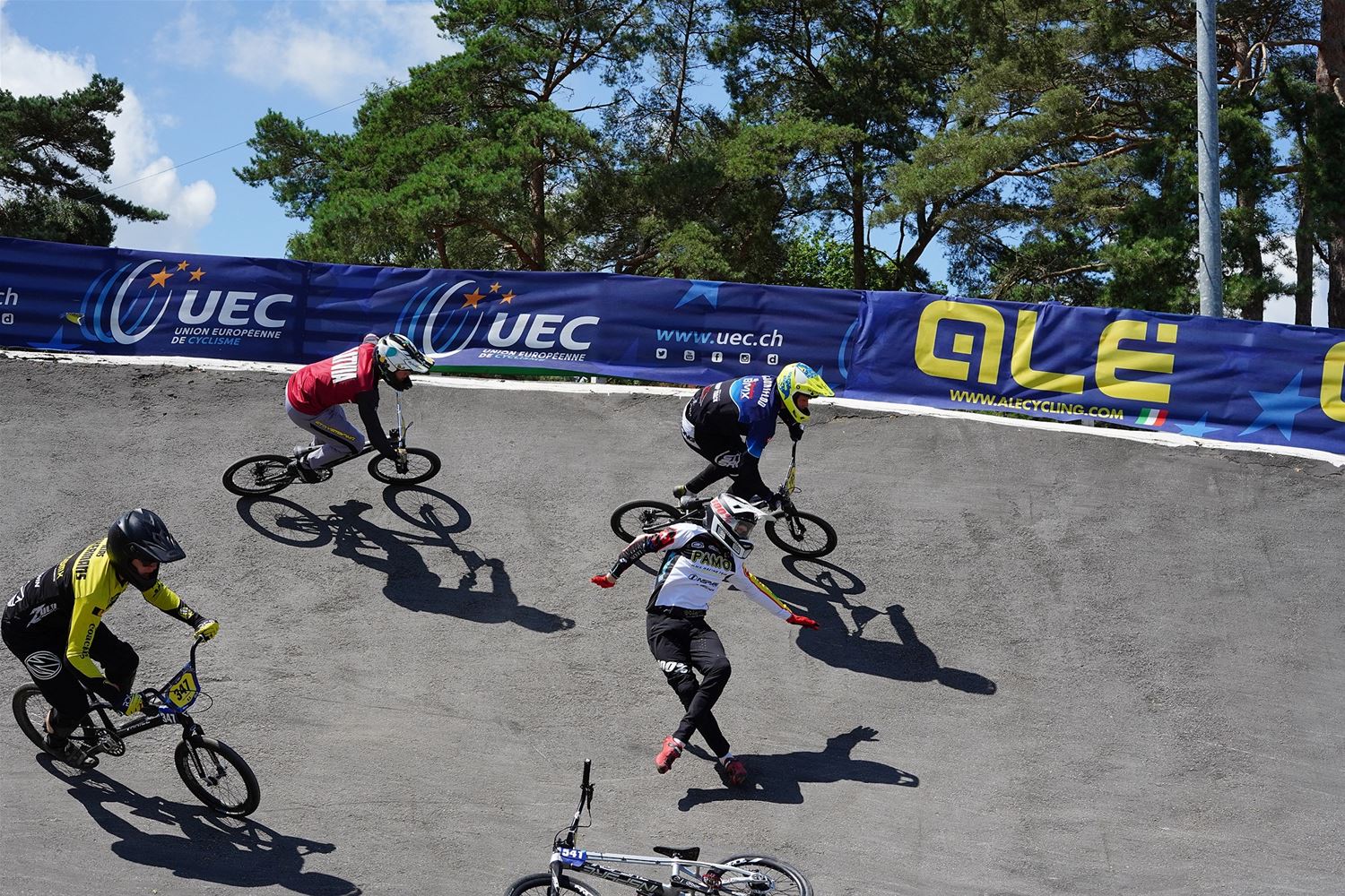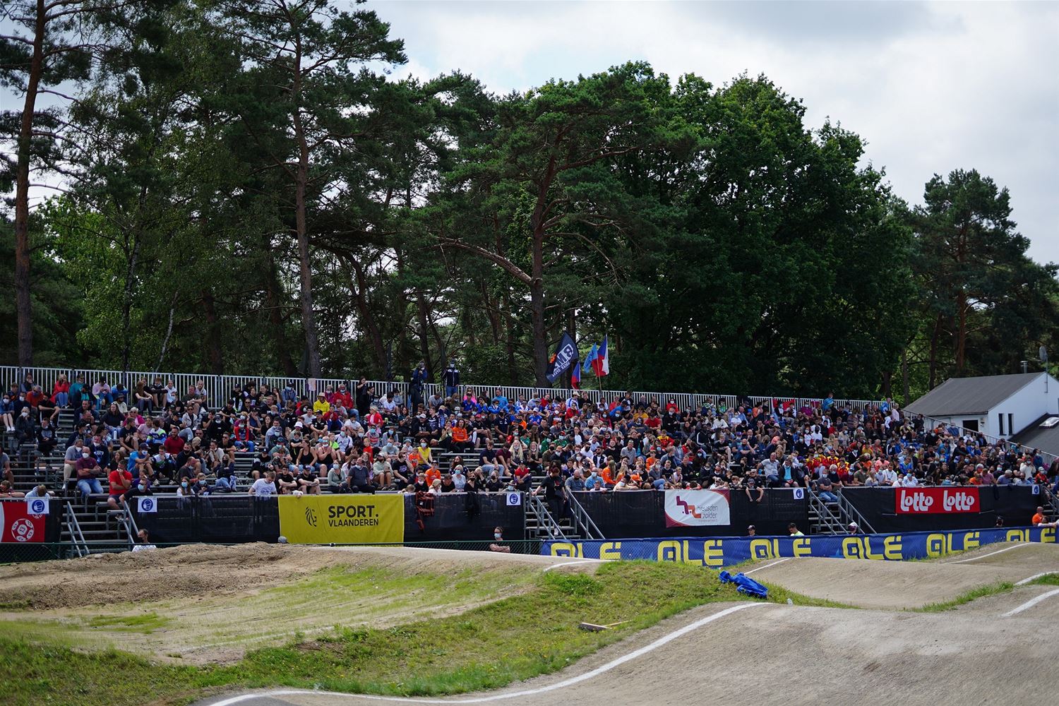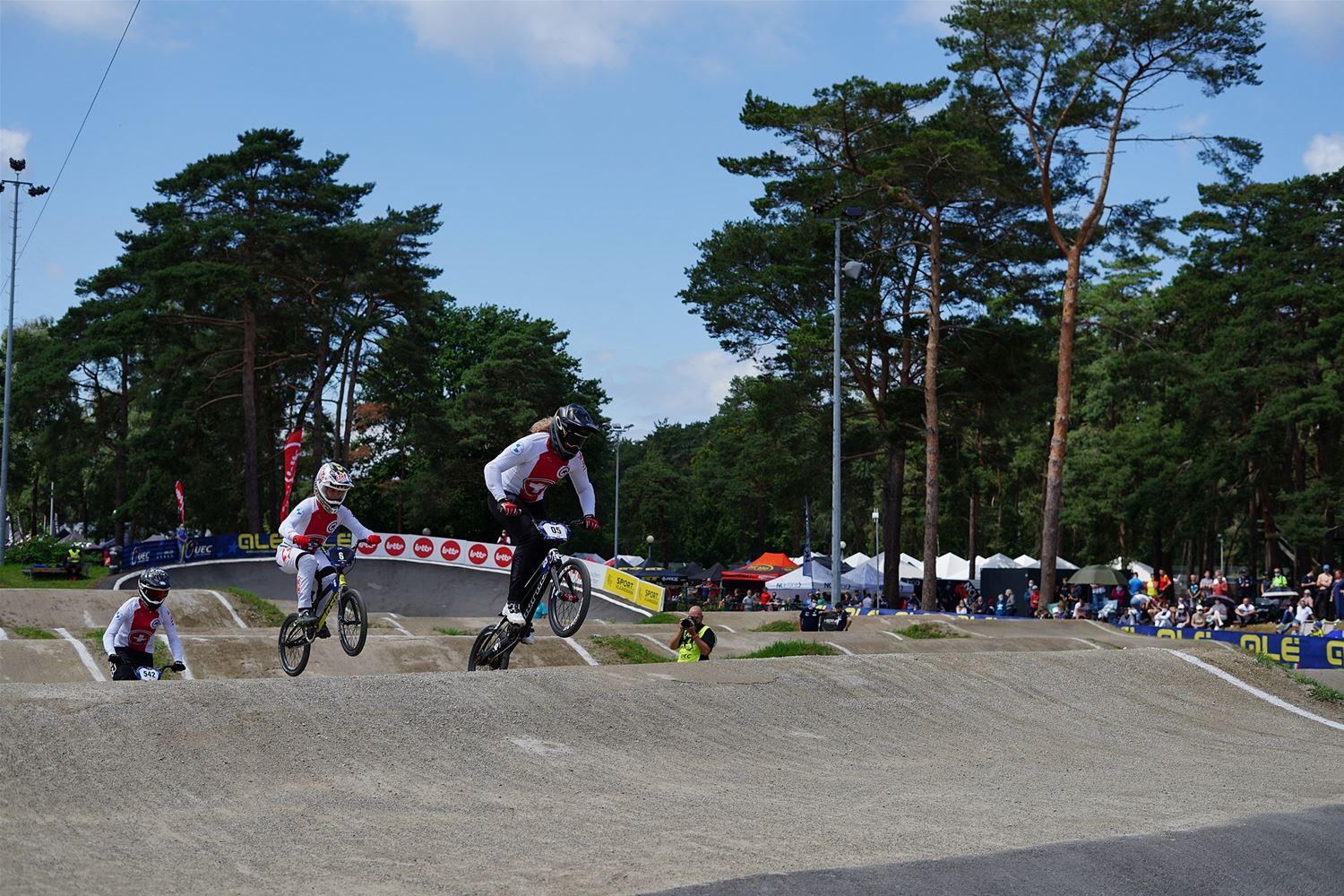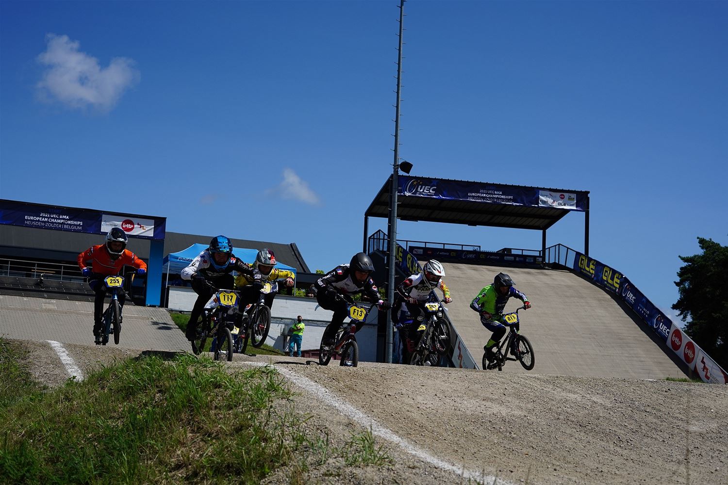 Het EK BMX kon vandaag heel de dag rekenen op stralend weer, er waren dan ook heel wat toeschouwers opgedaagd. En die kregen waar voor hun geld. Zo werd vandaag een jonge discipline opgevoerd: de ploegentijdrit. Daarin nemen telkens drie renners per land het tegen elkaar op. En Belgie mocht juichen, want zowxel de dames als de heren behaalden zilver. Bij de vrouwen verdedigden Elke Vanhoof, Aiko Gommers en Robyn Gommers de Belgische kleuren. Bij de mannen was gekozen voor een jong team, maar Thibaut Stoffels, Wannes Magdelijns en Jools Melis overtroffen de verwachtingen en werden dus tweede. De titel ging twee keer naar Frankrijk, dat dus erg tevreden mag terugblikken op de Europese kampioenschappen. (foto's Stephan Volders)70067