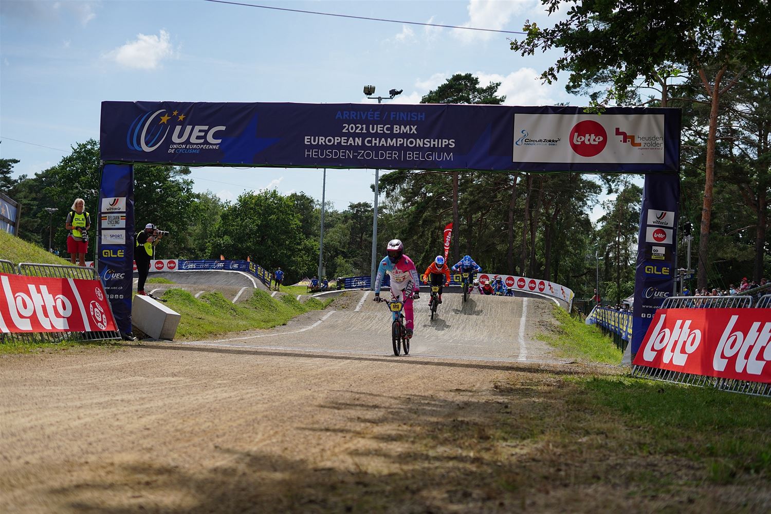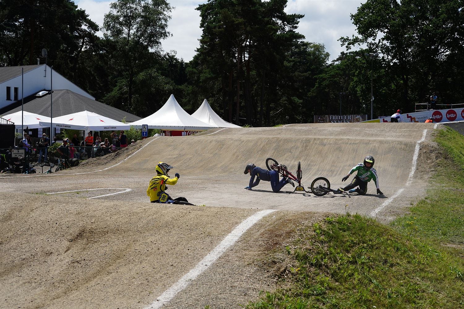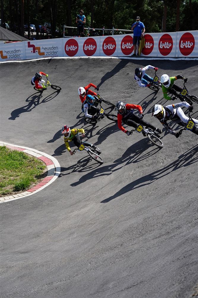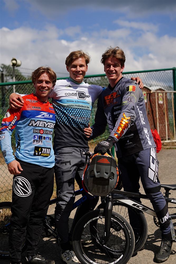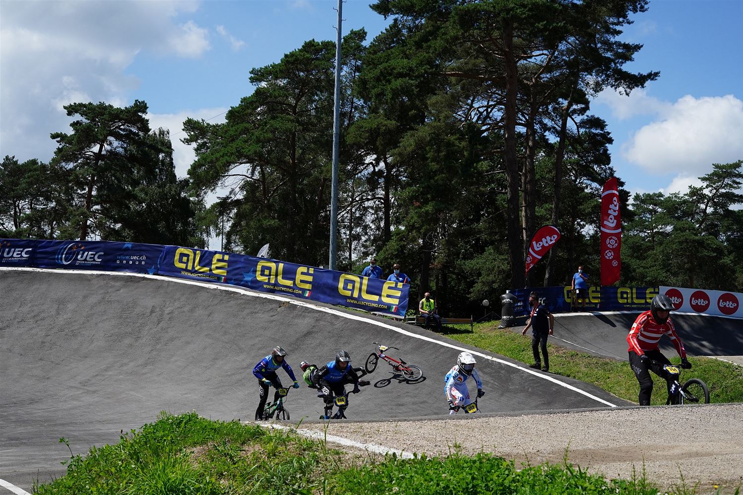 Het EK BMX kon vandaag heel de dag rekenen op stralend weer, er waren dan ook heel wat toeschouwers opgedaagd. En die kregen waar voor hun geld. Zo werd vandaag een jonge discipline opgevoerd: de ploegentijdrit. Daarin nemen telkens drie renners per land het tegen elkaar op. En Belgie mocht juichen, want zowxel de dames als de heren behaalden zilver. Bij de vrouwen verdedigden Elke Vanhoof, Aiko Gommers en Robyn Gommers de Belgische kleuren. Bij de mannen was gekozen voor een jong team, maar Thibaut Stoffels, Wannes Magdelijns en Jools Melis overtroffen de verwachtingen en werden dus tweede. De titel ging twee keer naar Frankrijk, dat dus erg tevreden mag terugblikken op de Europese kampioenschappen. (foto's Stephan Volders)70067