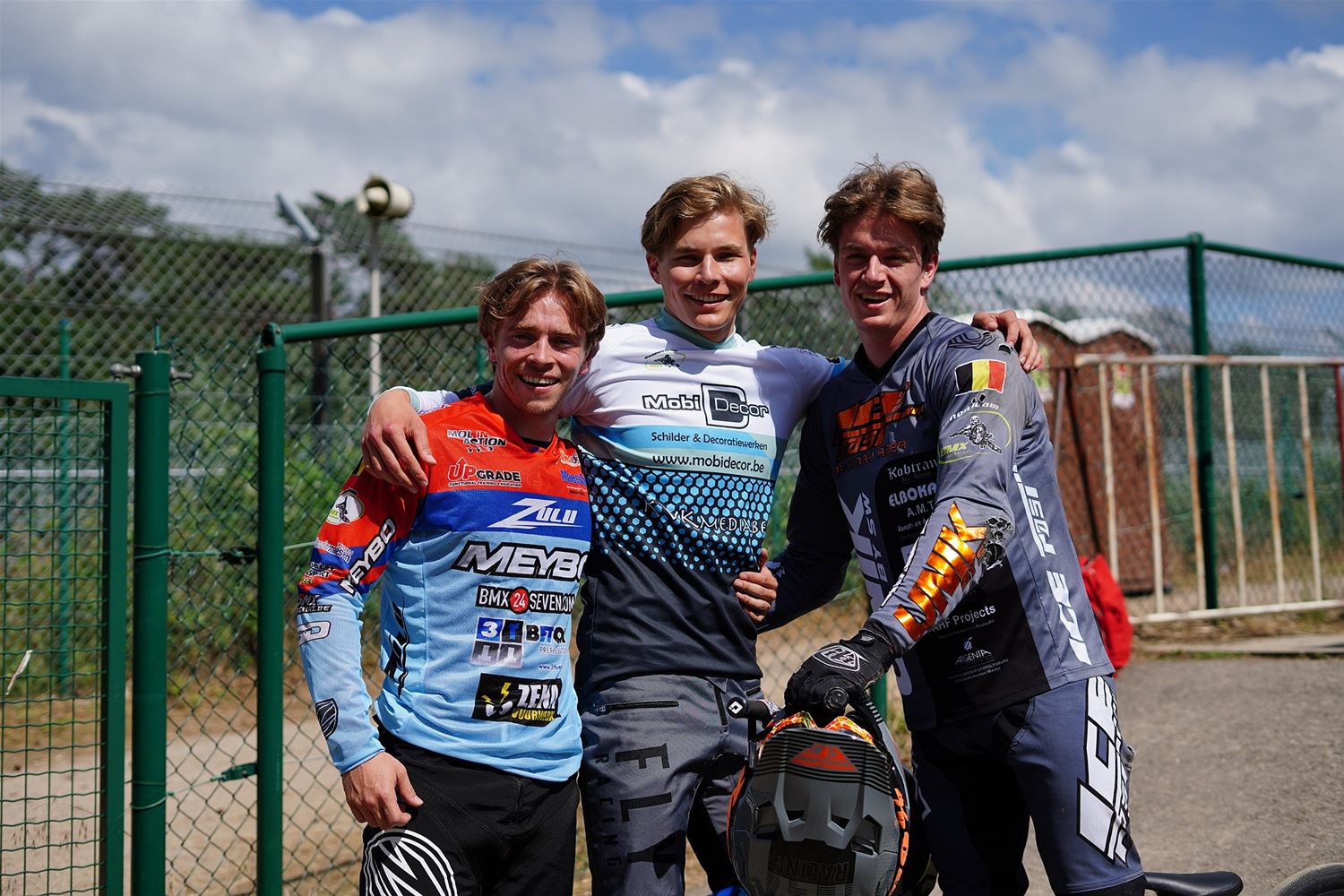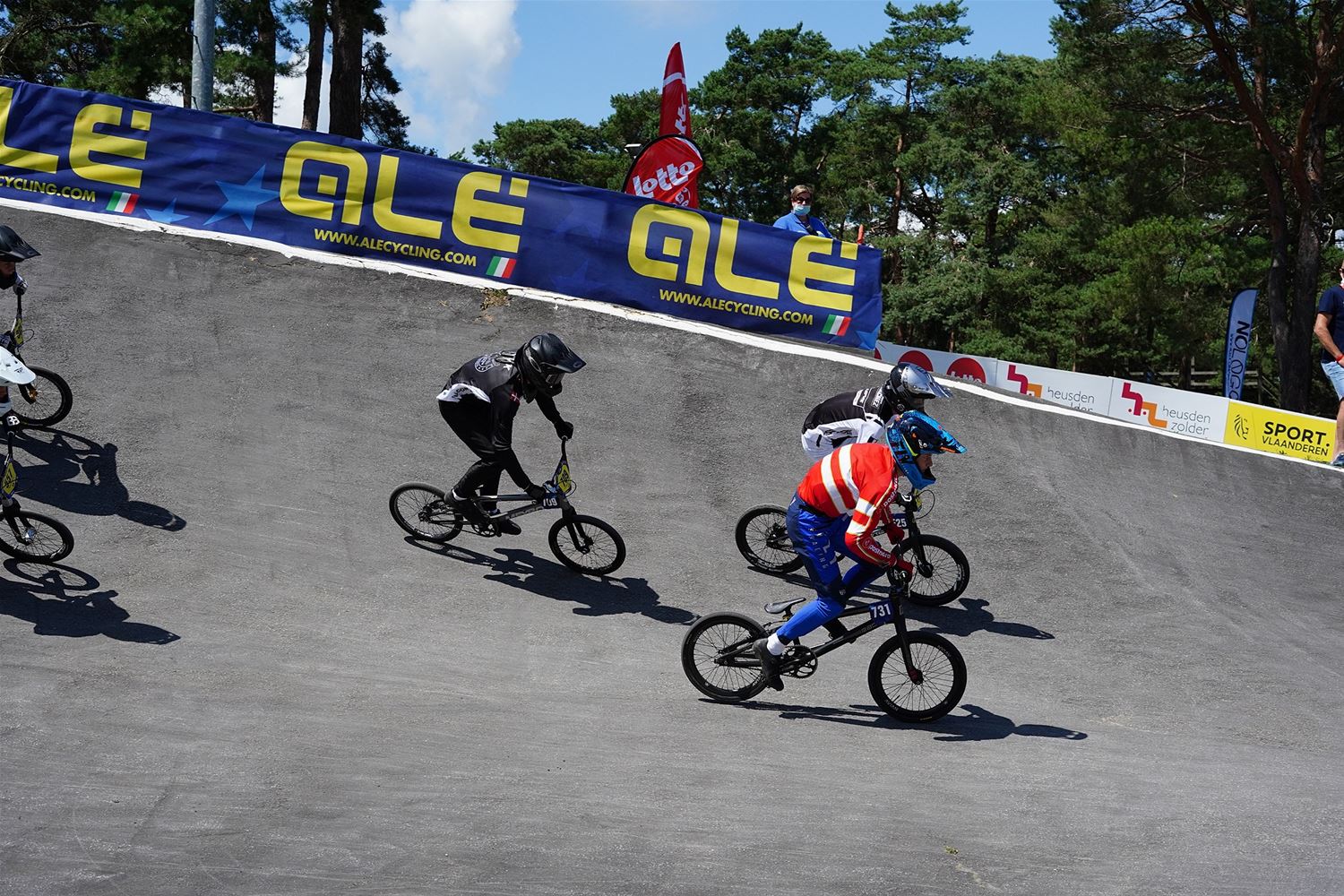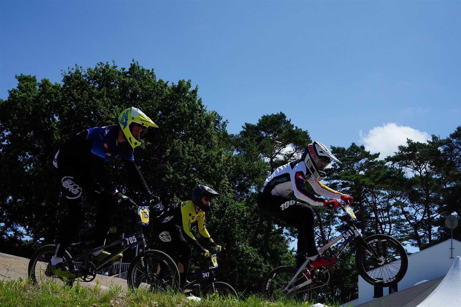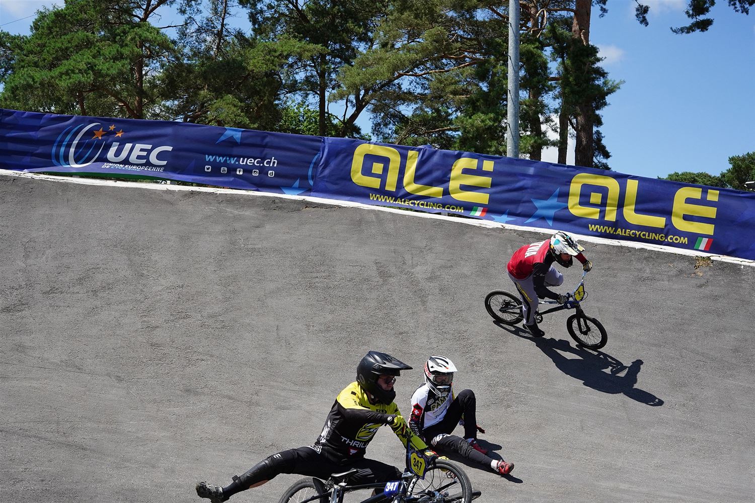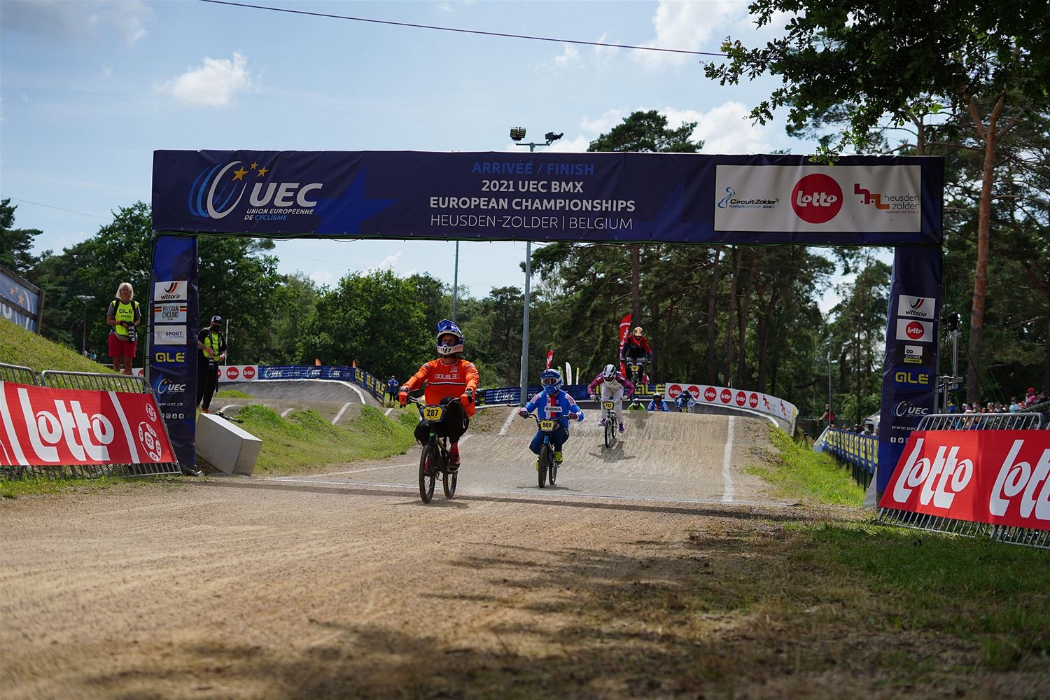 Het EK BMX kon vandaag heel de dag rekenen op stralend weer, er waren dan ook heel wat toeschouwers opgedaagd. En die kregen waar voor hun geld. Zo werd vandaag een jonge discipline opgevoerd: de ploegentijdrit. Daarin nemen telkens drie renners per land het tegen elkaar op. En Belgie mocht juichen, want zowxel de dames als de heren behaalden zilver. Bij de vrouwen verdedigden Elke Vanhoof, Aiko Gommers en Robyn Gommers de Belgische kleuren. Bij de mannen was gekozen voor een jong team, maar Thibaut Stoffels, Wannes Magdelijns en Jools Melis overtroffen de verwachtingen en werden dus tweede. De titel ging twee keer naar Frankrijk, dat dus erg tevreden mag terugblikken op de Europese kampioenschappen. (foto's Stephan Volders)70067