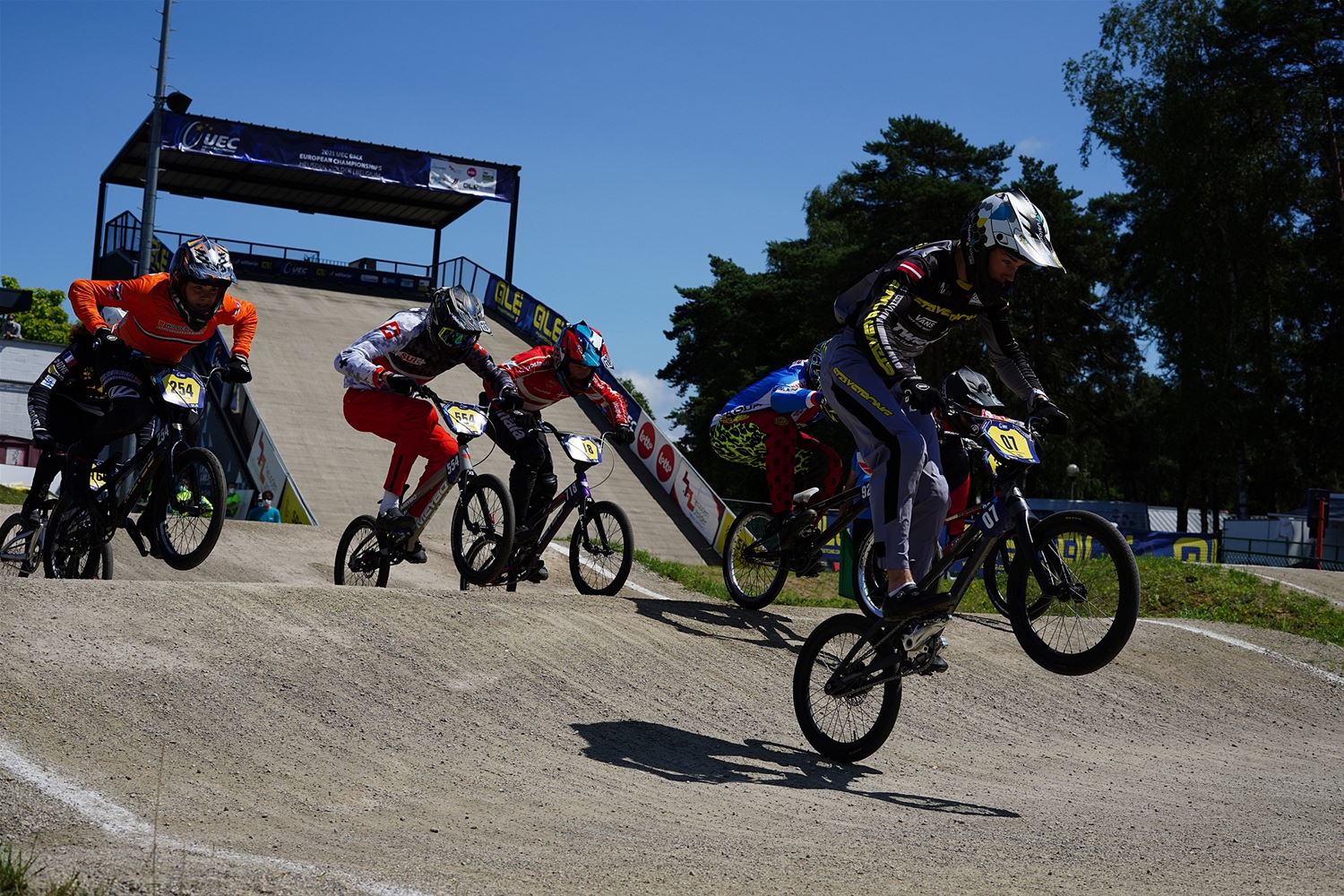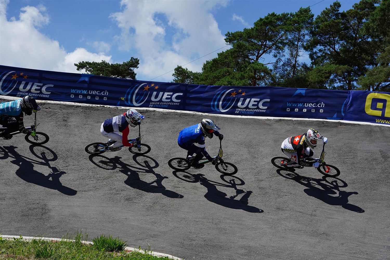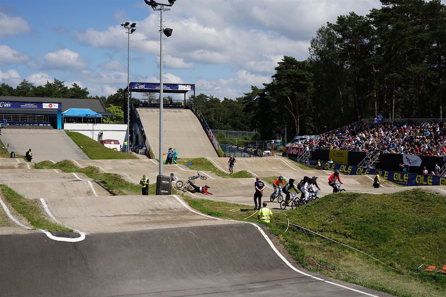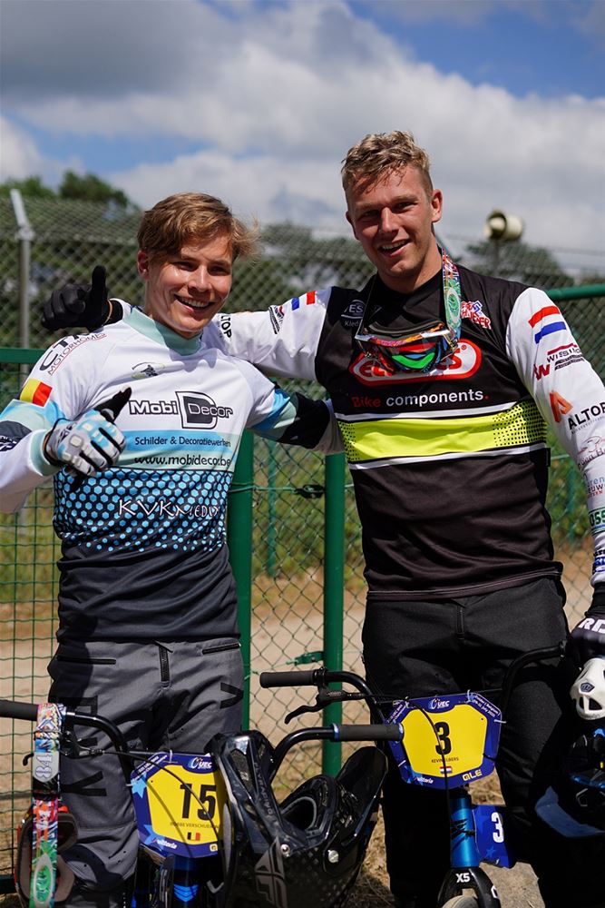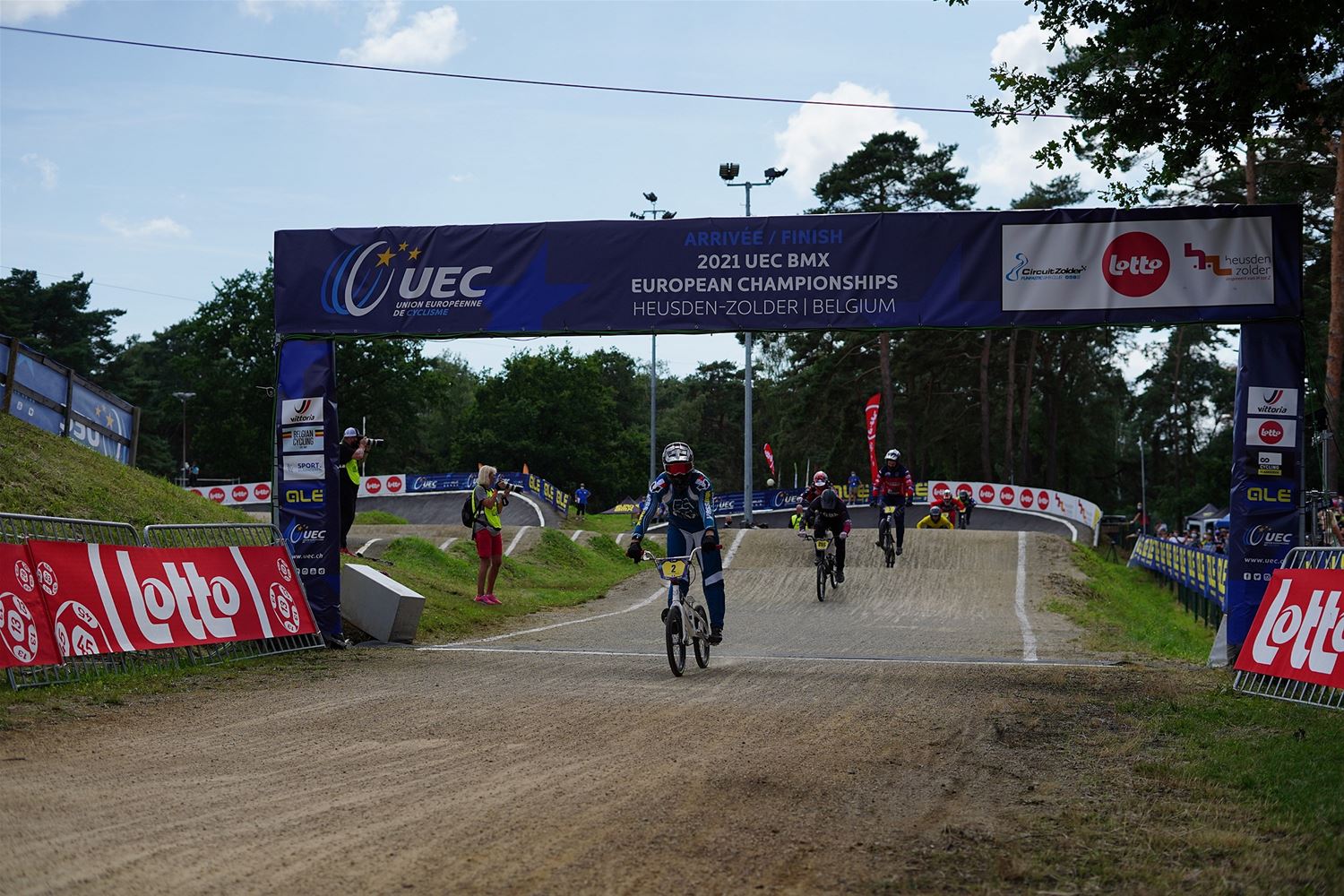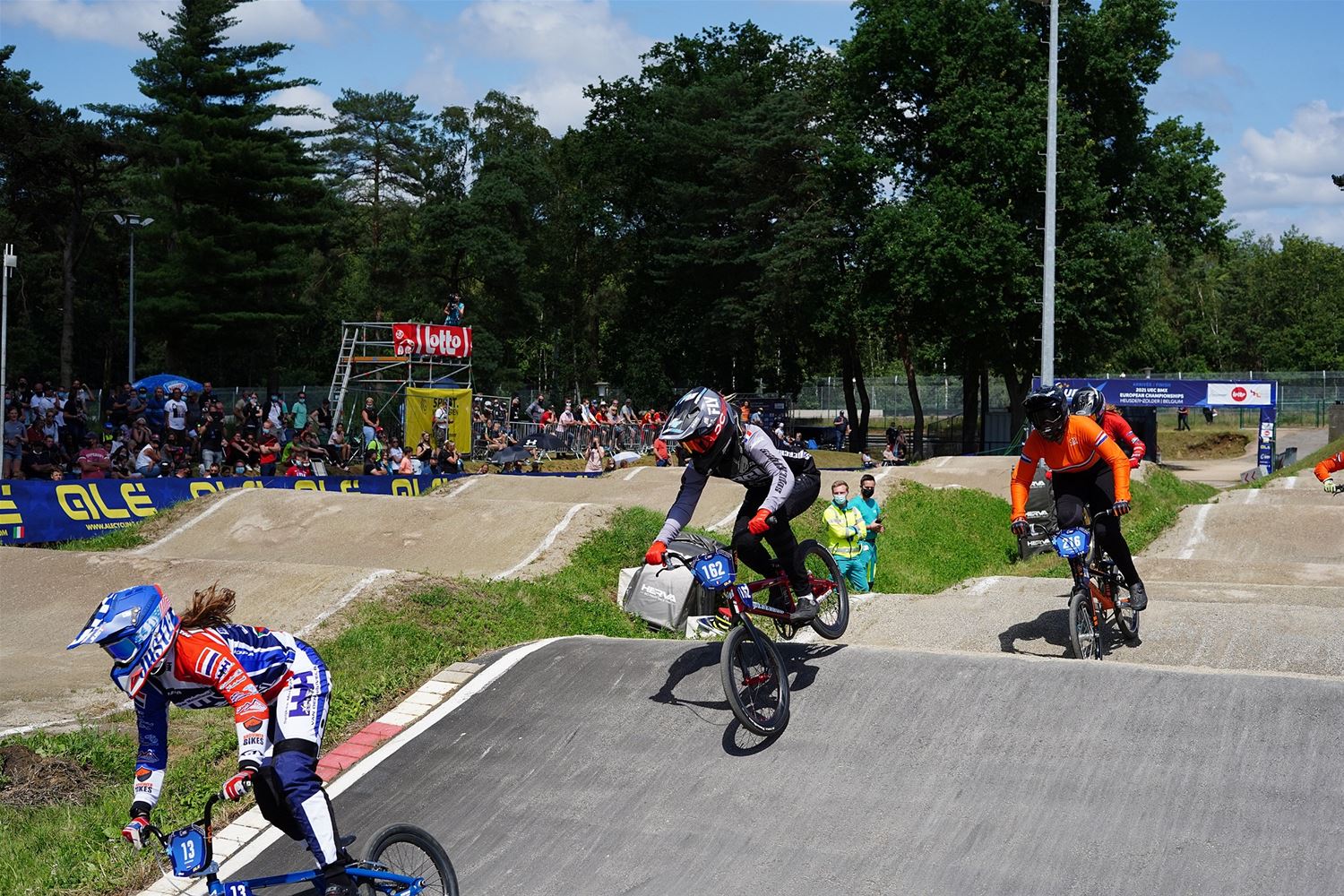 Het EK BMX kon vandaag heel de dag rekenen op stralend weer, er waren dan ook heel wat toeschouwers opgedaagd. En die kregen waar voor hun geld. Zo werd vandaag een jonge discipline opgevoerd: de ploegentijdrit. Daarin nemen telkens drie renners per land het tegen elkaar op. En Belgie mocht juichen, want zowxel de dames als de heren behaalden zilver. Bij de vrouwen verdedigden Elke Vanhoof, Aiko Gommers en Robyn Gommers de Belgische kleuren. Bij de mannen was gekozen voor een jong team, maar Thibaut Stoffels, Wannes Magdelijns en Jools Melis overtroffen de verwachtingen en werden dus tweede. De titel ging twee keer naar Frankrijk, dat dus erg tevreden mag terugblikken op de Europese kampioenschappen. (foto's Stephan Volders)70067