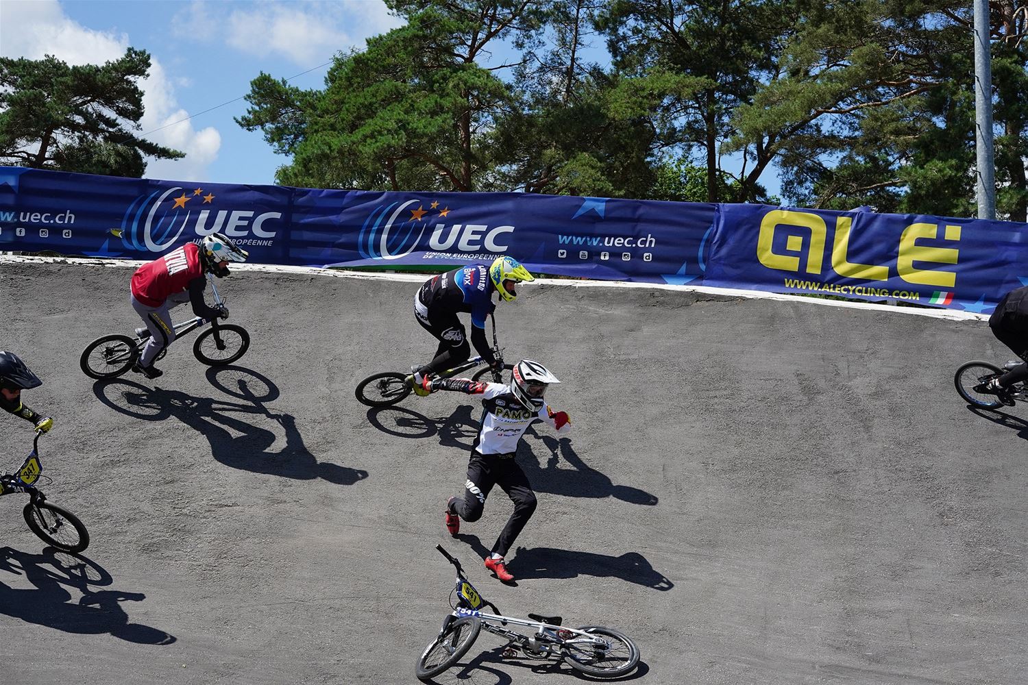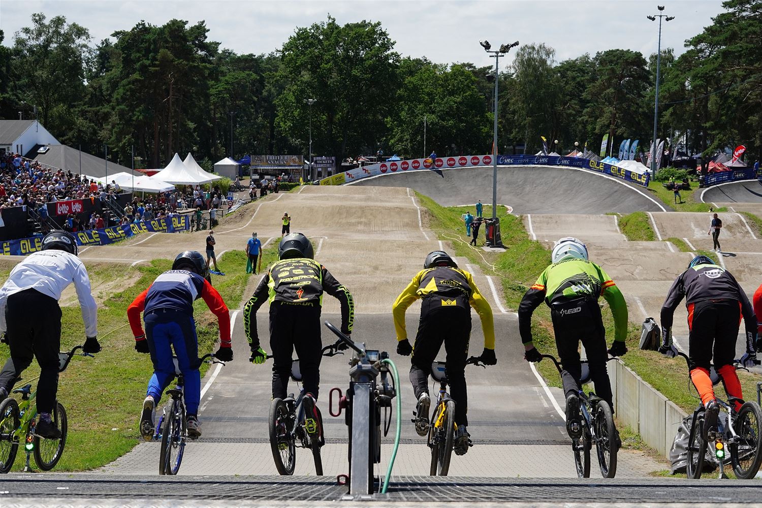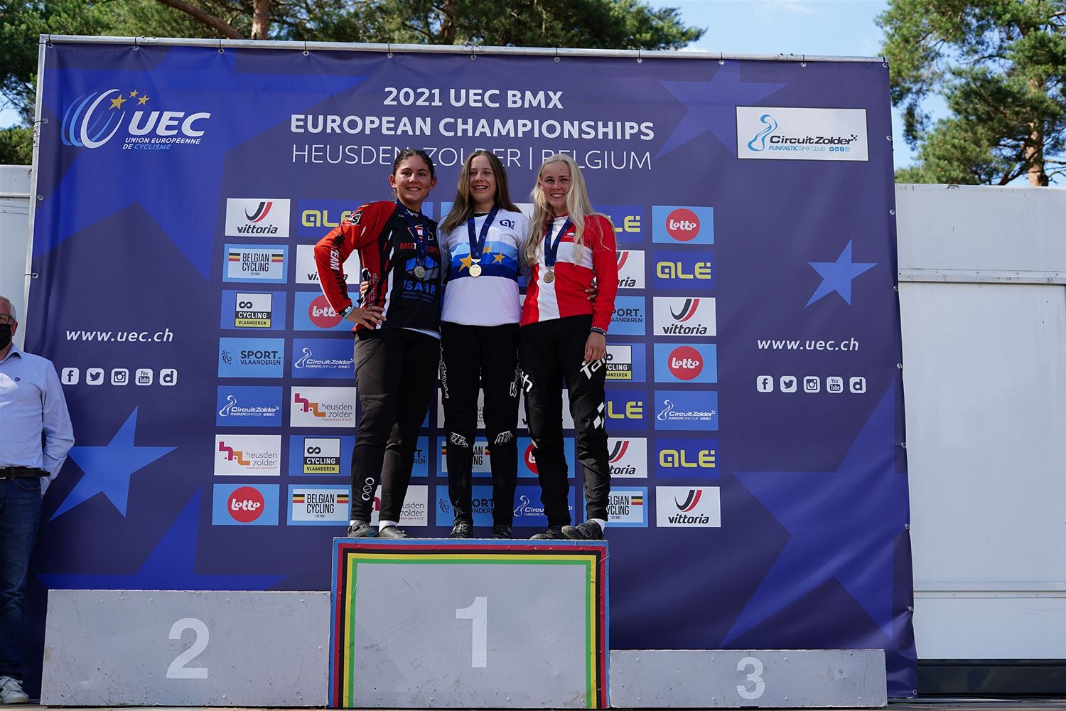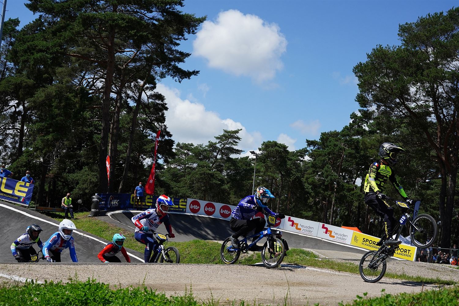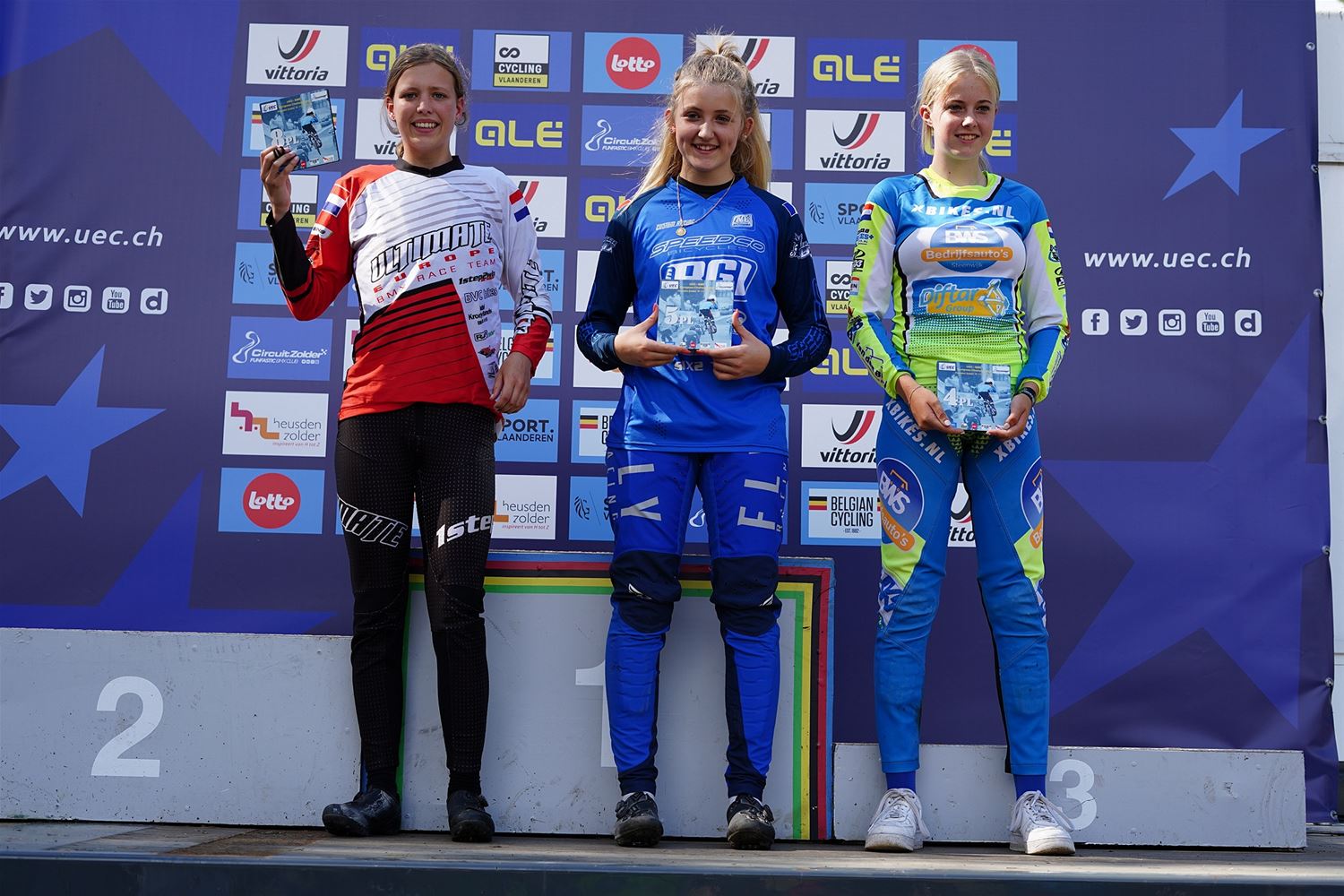 Het EK BMX kon vandaag heel de dag rekenen op stralend weer, er waren dan ook heel wat toeschouwers opgedaagd. En die kregen waar voor hun geld. Zo werd vandaag een jonge discipline opgevoerd: de ploegentijdrit. Daarin nemen telkens drie renners per land het tegen elkaar op. En Belgie mocht juichen, want zowxel de dames als de heren behaalden zilver. Bij de vrouwen verdedigden Elke Vanhoof, Aiko Gommers en Robyn Gommers de Belgische kleuren. Bij de mannen was gekozen voor een jong team, maar Thibaut Stoffels, Wannes Magdelijns en Jools Melis overtroffen de verwachtingen en werden dus tweede. De titel ging twee keer naar Frankrijk, dat dus erg tevreden mag terugblikken op de Europese kampioenschappen. (foto's Stephan Volders)70067