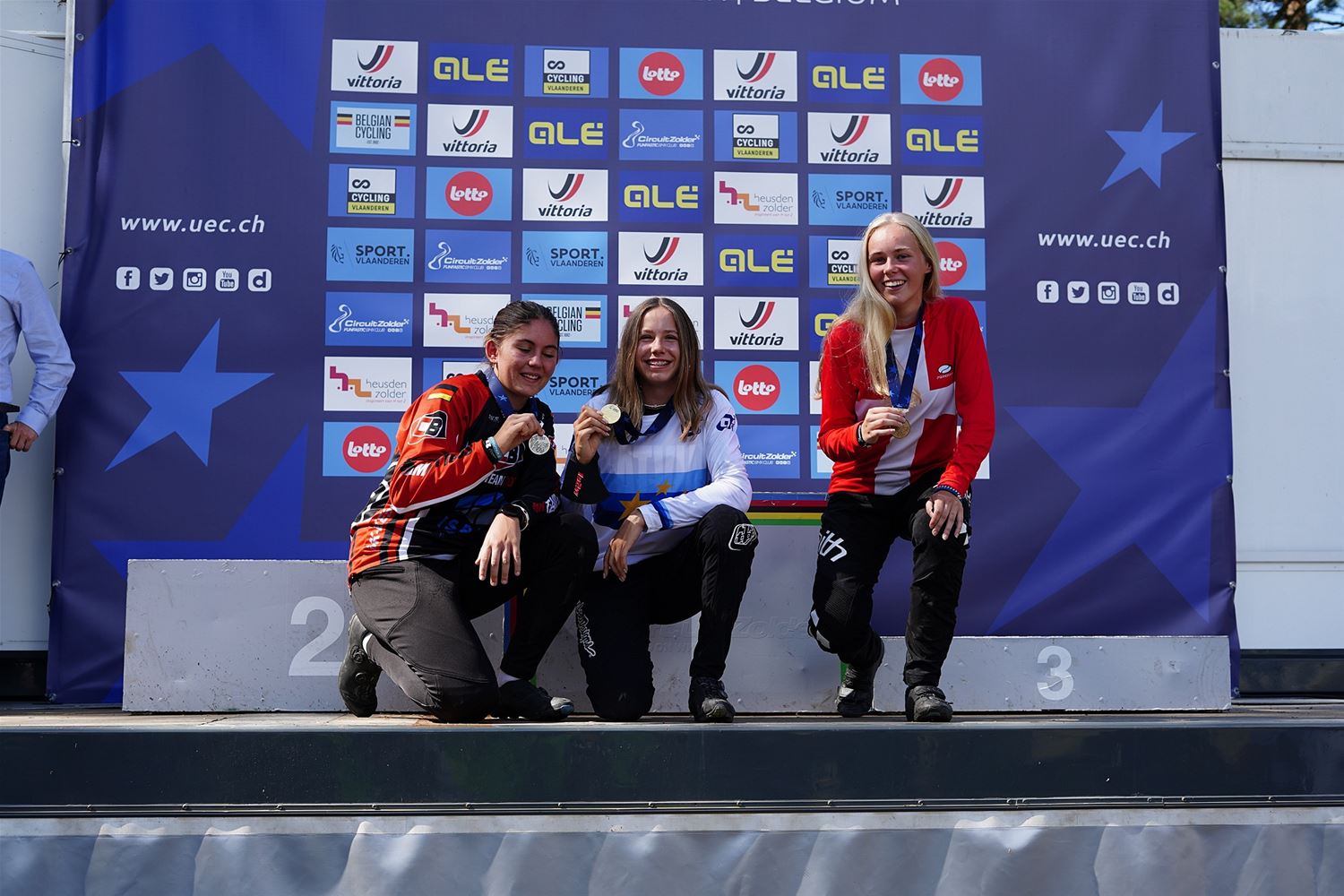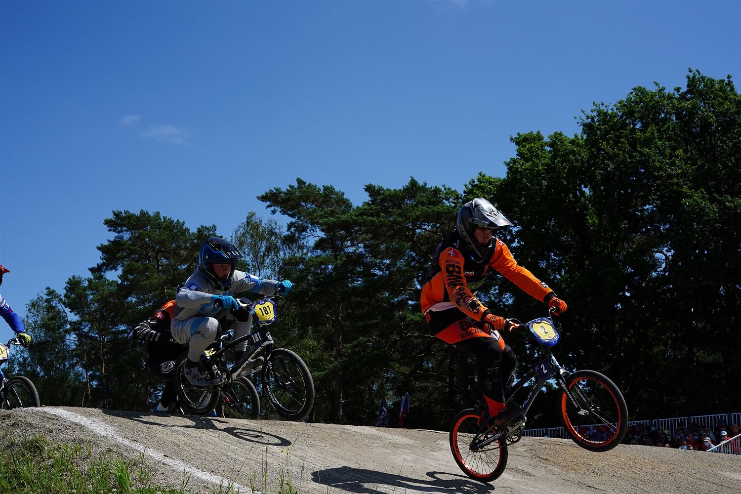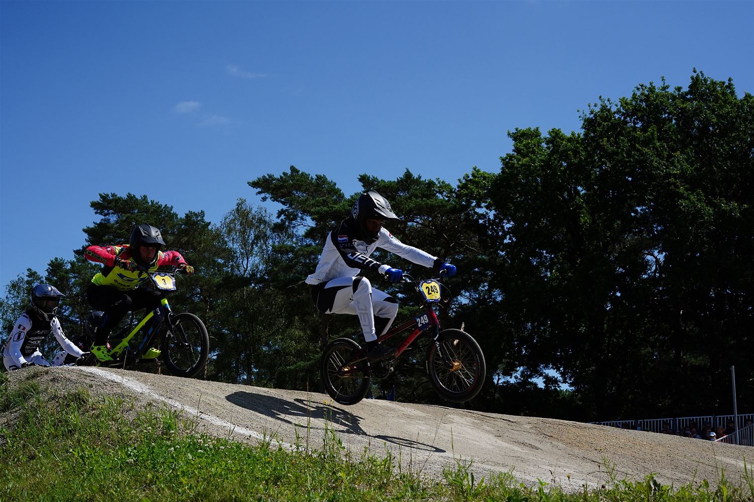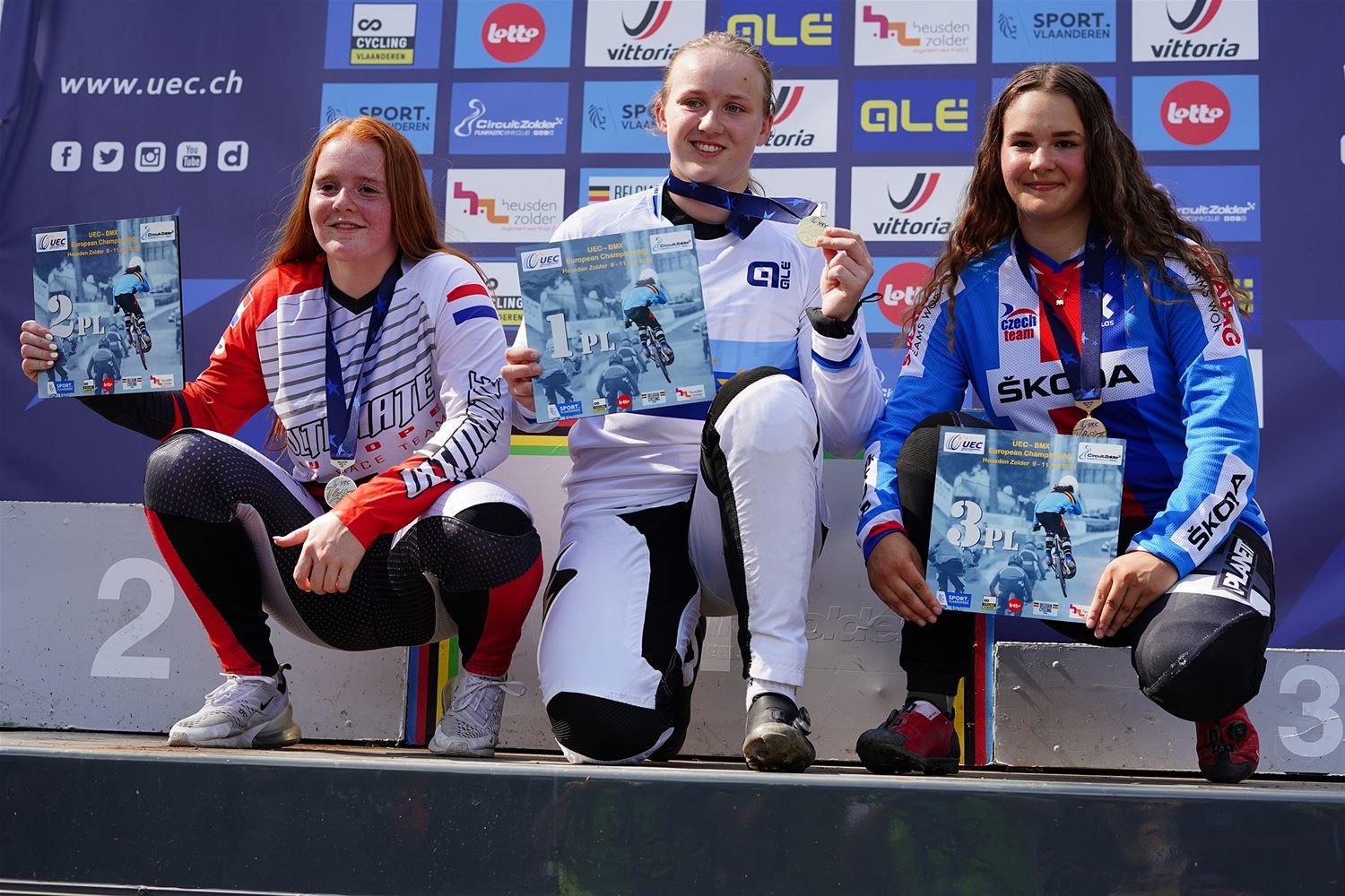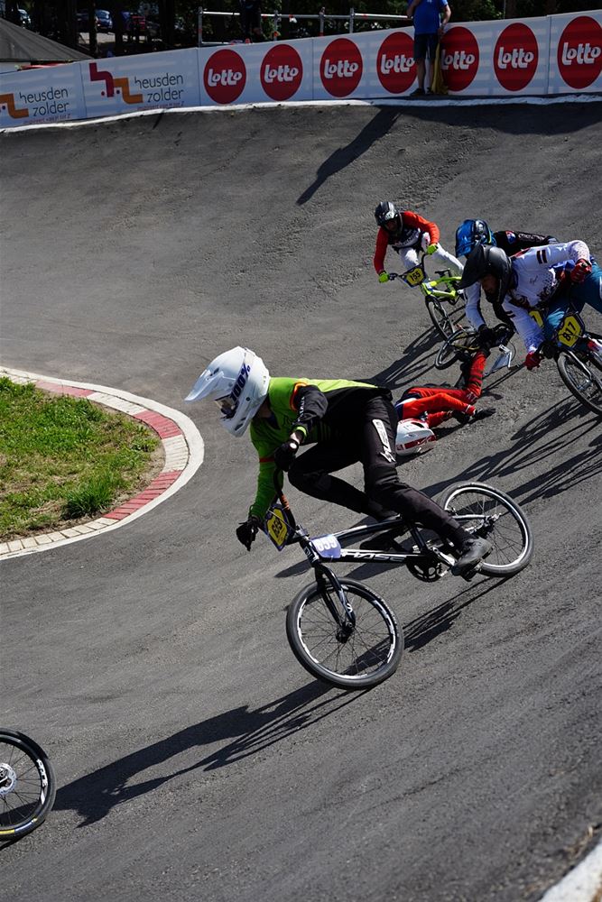 Het EK BMX kon vandaag heel de dag rekenen op stralend weer, er waren dan ook heel wat toeschouwers opgedaagd. En die kregen waar voor hun geld. Zo werd vandaag een jonge discipline opgevoerd: de ploegentijdrit. Daarin nemen telkens drie renners per land het tegen elkaar op. En Belgie mocht juichen, want zowxel de dames als de heren behaalden zilver. Bij de vrouwen verdedigden Elke Vanhoof, Aiko Gommers en Robyn Gommers de Belgische kleuren. Bij de mannen was gekozen voor een jong team, maar Thibaut Stoffels, Wannes Magdelijns en Jools Melis overtroffen de verwachtingen en werden dus tweede. De titel ging twee keer naar Frankrijk, dat dus erg tevreden mag terugblikken op de Europese kampioenschappen. (foto's Stephan Volders)70067