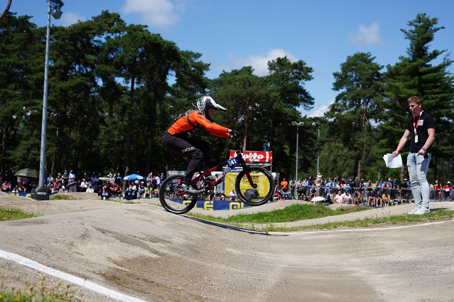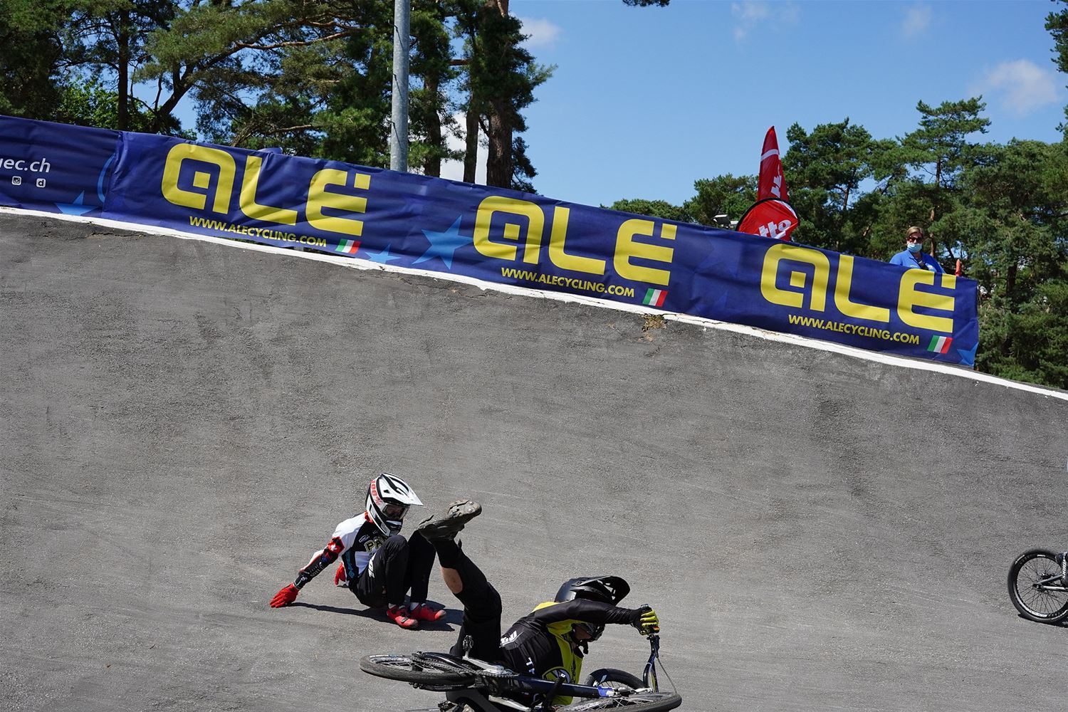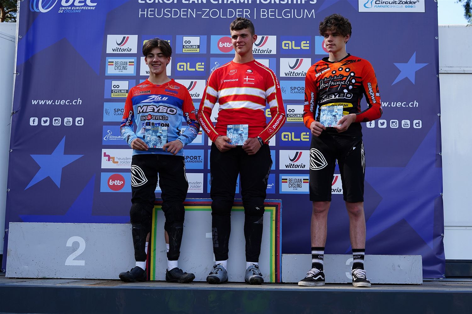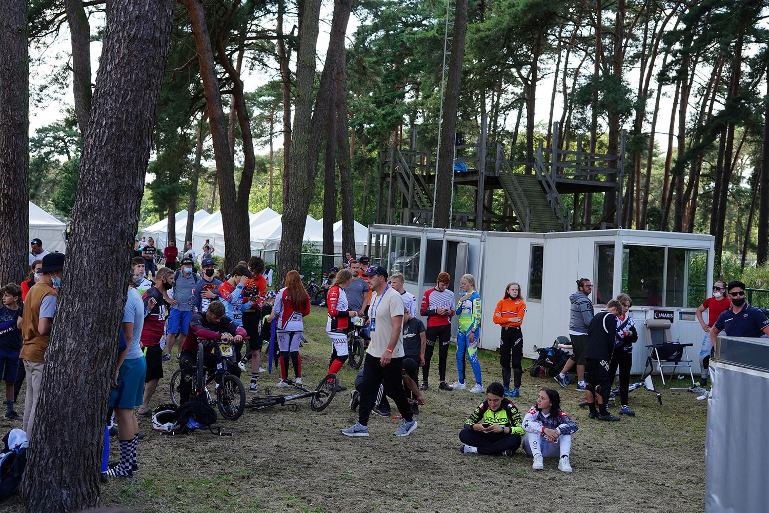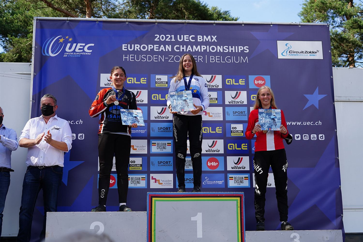 Het EK BMX kon vandaag heel de dag rekenen op stralend weer, er waren dan ook heel wat toeschouwers opgedaagd. En die kregen waar voor hun geld. Zo werd vandaag een jonge discipline opgevoerd: de ploegentijdrit. Daarin nemen telkens drie renners per land het tegen elkaar op. En Belgie mocht juichen, want zowxel de dames als de heren behaalden zilver. Bij de vrouwen verdedigden Elke Vanhoof, Aiko Gommers en Robyn Gommers de Belgische kleuren. Bij de mannen was gekozen voor een jong team, maar Thibaut Stoffels, Wannes Magdelijns en Jools Melis overtroffen de verwachtingen en werden dus tweede. De titel ging twee keer naar Frankrijk, dat dus erg tevreden mag terugblikken op de Europese kampioenschappen. (foto's Stephan Volders)70067