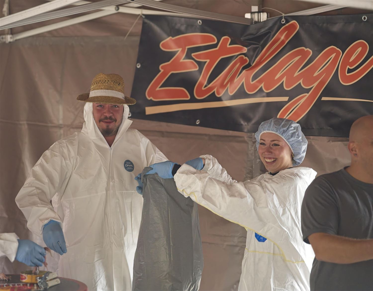 Er liepen mensen in witte pakken rond in café Etalage vandaag. Was er een misdaad gepleegd? Een gevaarlijke situatie ontstaan? Niet echt, maar wel een niet alledaagse uitdaging: de Surströmming Challenge. Surströmming is een Zweeds gerecht van gegiste oostzeeharing. Tijdens het gisten ontstaan organische zwavelverbindingen die een geur verspreiden zoals die van rotte eieren, of een stinkbom. De blikken werden dan ook niet binnen geopend, want dan zou de geur dagenlang blijven hangen. En ja, enkele dapperen waagden het om de haring door te slikken. Of ze die ook binnen hebben gehouden en hoeveel pinten nodig waren om na te spoelen heeft onze fotograaf tijdens zijn vlucht naar buiten niet meer kunnen opvangen. (foto’s Johan Put)86801