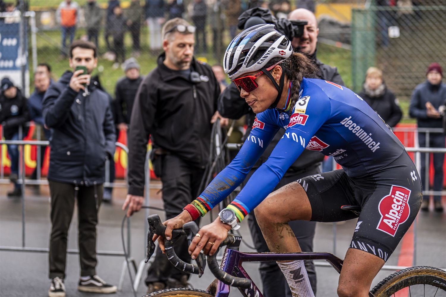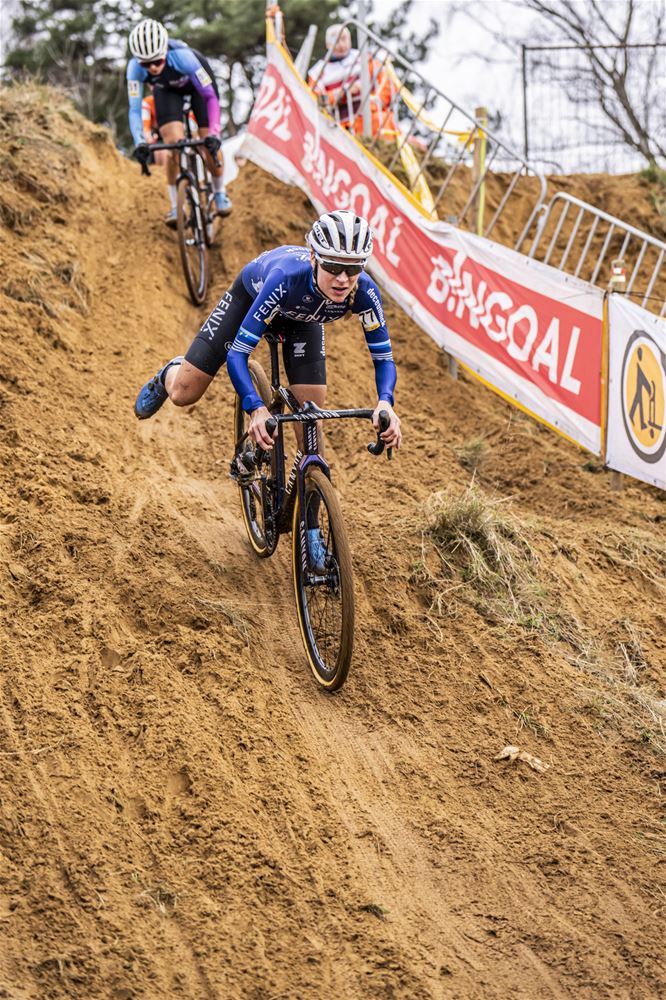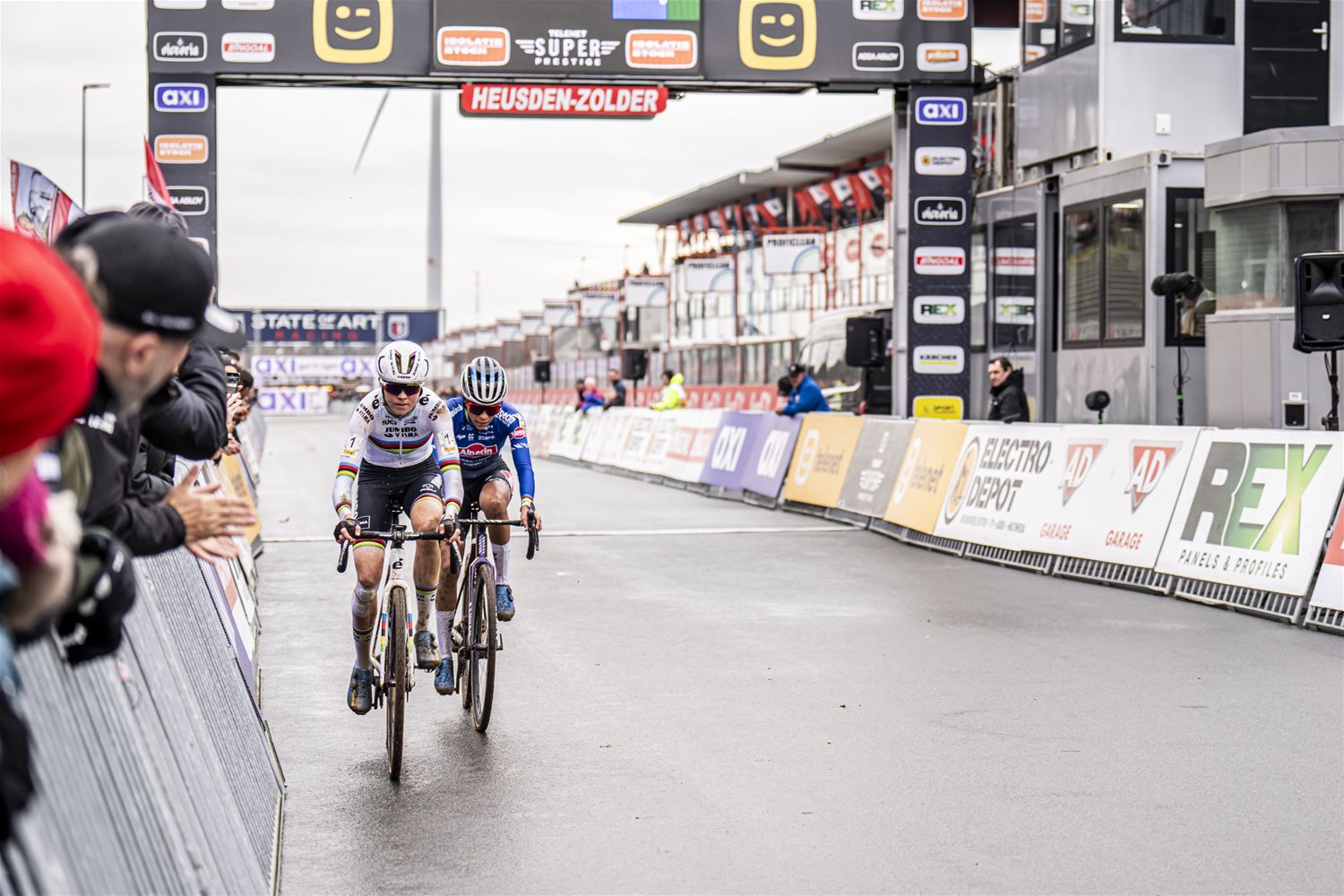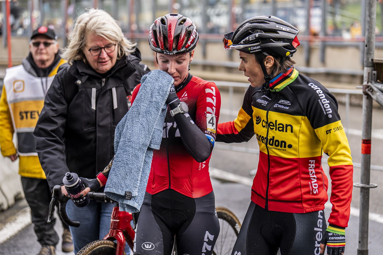 De vrouwen serveerden het publiek een prachtige manche van de Superprestige, met dank aan de Nederlandse toppers wereldkampioene Fem van Empel en Ceylin Alvarado. Even leek de tweestrijd in het water te vallen, toen Van Empel vroeg in de koers in een afdaling viel en terechtkwam op haar knie, die haar eerder al parten speelde. Ze zette evenwel een sterke achtervolging in, kwam terug bij Alvarado, beiden wilden elkaar geen duimbreed toegeven. Dat getouwtrek leidde in de slotronde zelfs tot twee kleine incidentjes, waarbij ze elkaar hinderden. Het kwam tot een spurt en daarin was de wereldkampioene andermaal de snelste. Inge van der Heijden maakte 16 seconden later het Nederlandse podium compleet. Belgisch kampioene Sanne Cant - luid toegejuicht langs het parcours - reed één van haar beste crossen van het seizoen en werd vierde op 40 seconden. Annemarie Worst - vandaag zesde - blijft aan de leiding in de Superprestige, maar houdt maar één punt meer over op eerste achtervolger Del Carmen Alvarado. (foto's Dirk Dekens)79603