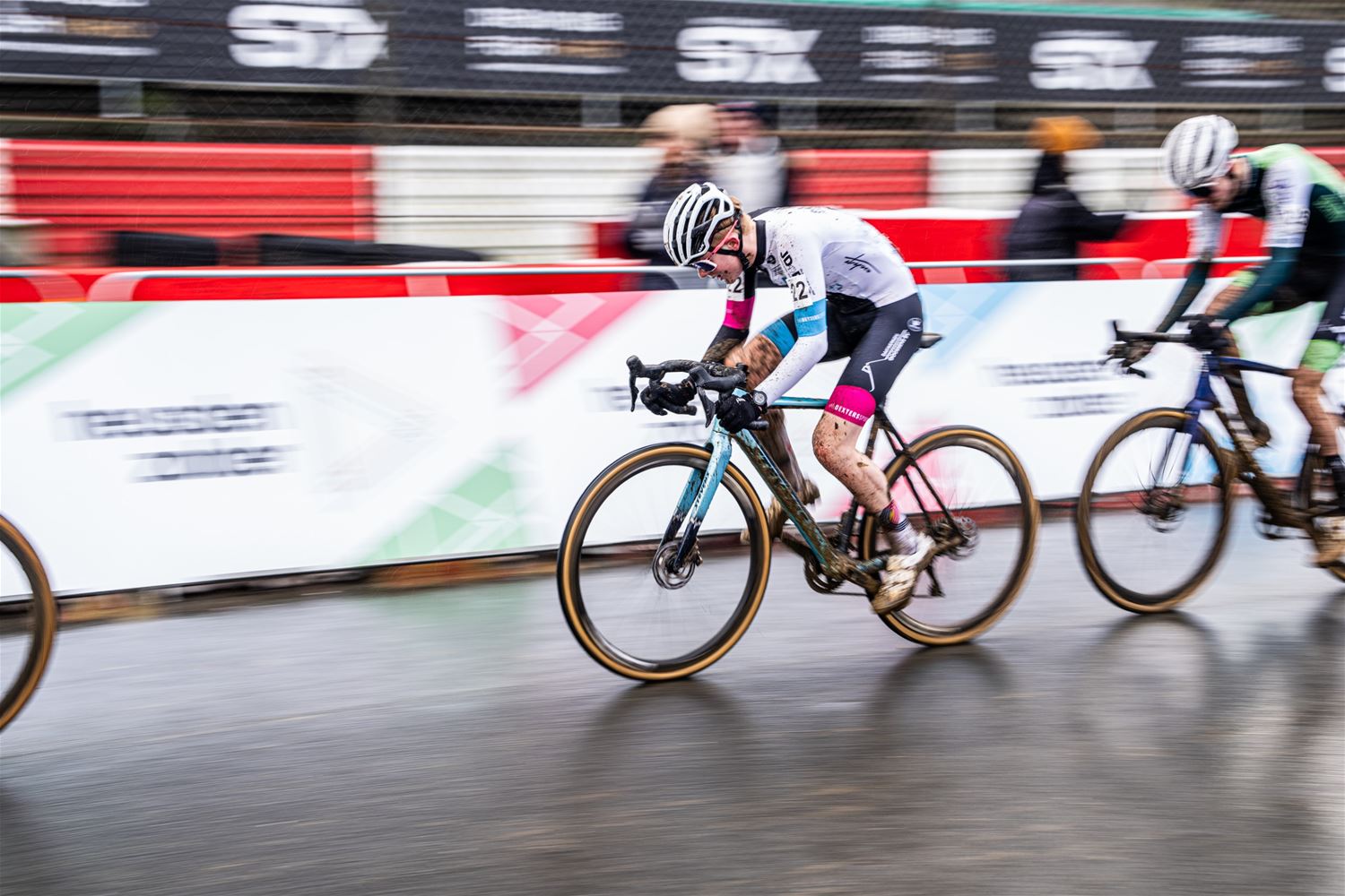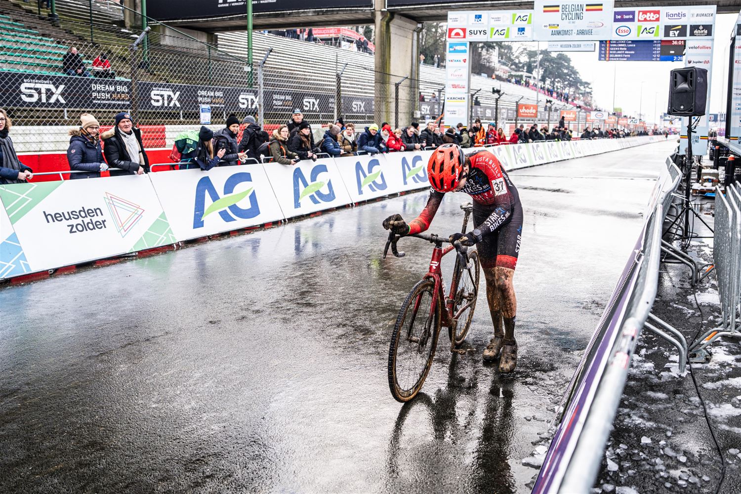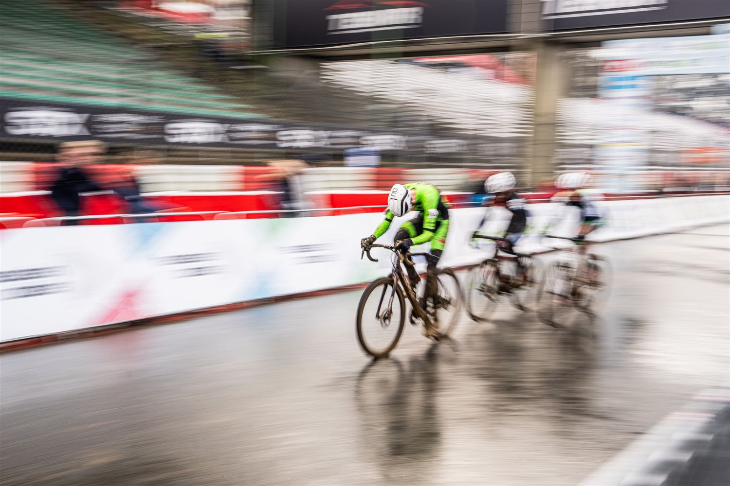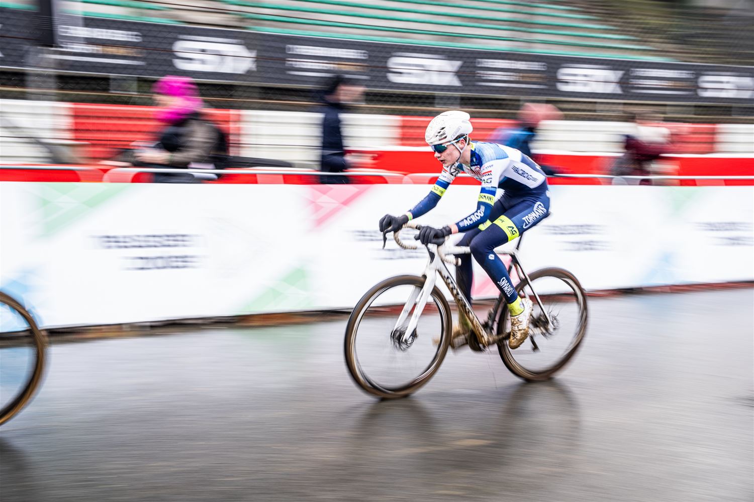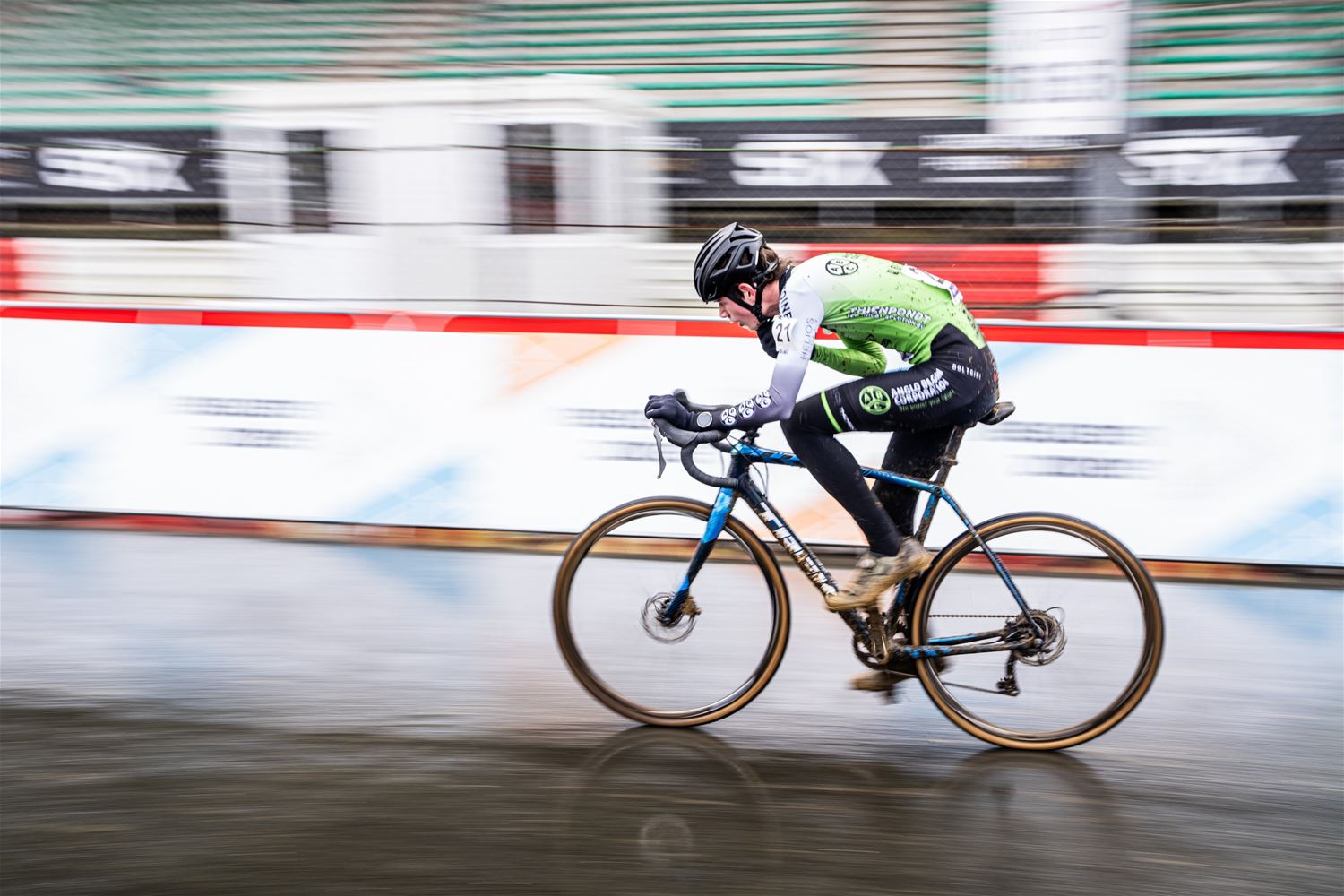 Bij de tweedejaarsnieuwelingen werd Cas Van Looke voor het tweede jaar op rij Belgisch kampioen. Hij koos in het voetspoor van Emiel Osaer kort na de start het hazenpad, terwijl het achter hen valpartijen regende. Ze diepten de kloof verder uit en ging samen de laatste ronde in. Het leek op een sprint uit te draaien tot kettingproblemen Osaer in de slotfase letterlijk aan de grond zetten. Hij kon niet meer fietsen en zou uiteindelijk 16de finishen. Geen problemen dus voor kampioen Cas Van Looke die op het podium Lars Stockman en Bas Vanden Eynde naast zich kreeg. (foto's DD)84198
