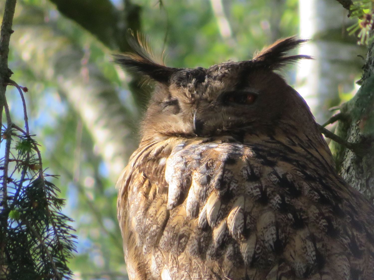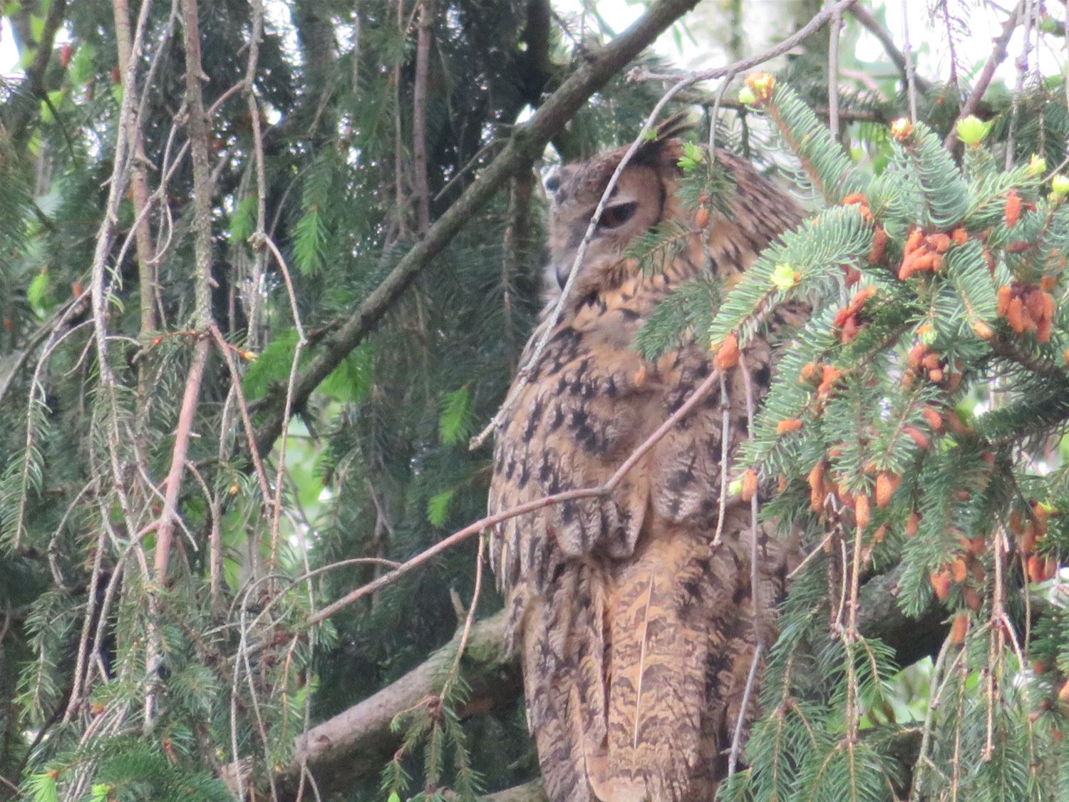 Sinds vanmorgen zit er een uil in een spar in de Schootstraat. Jos Willems vraagt zich af welke uilensoort het is. internetgazet