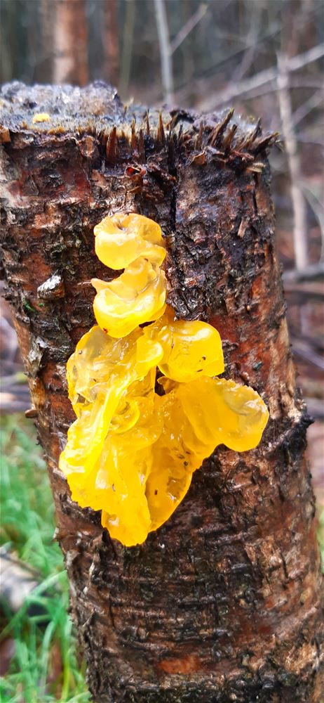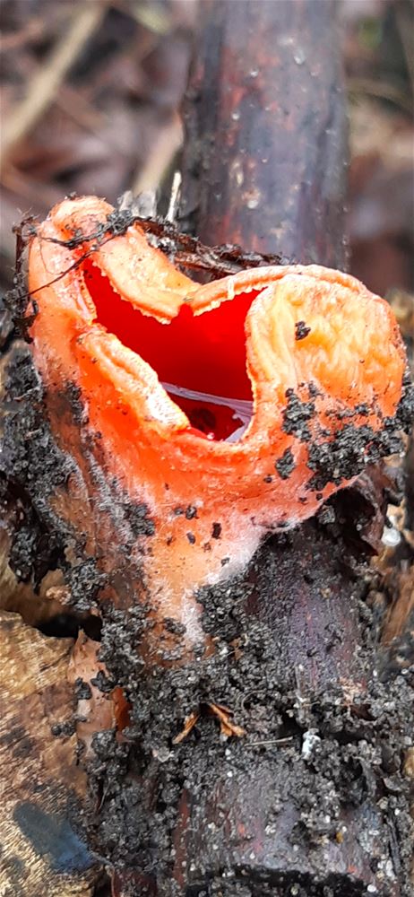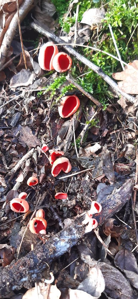 Op zijn wandeltochten over de trage wegen komt Stefan Was merkwaardige zwammen tegen. Zo vond hij een gele trilzwam, die is nu overal te spotten en leeft op takken van bomen en struiken. Maar ook de zeldzame rode kelkzwam is nu te vinden op begraven en bemoste takken van verterend hout. Deze exemplaren staan langs de trage weg aan de brug over de Graaf de Theuxlaan. Soms lijkt het alof ze op de grond staan, maar dat is schijn. Onder de aarde ligt zeker een dode tak verborgen, waar de paddenstoel op vastzit. Ze vallen goed op in het nog kale landschap en kunnen 1 tot 5 cm groot worden.84372