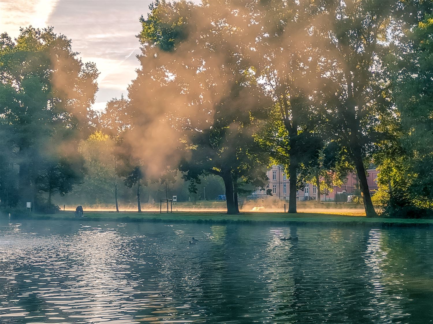 Een zomerse zondagochtend langs de vijver van Meylandt, de eendjes zijn al volop in actie en ook de hengelaars hebben hun lijntjes al gegooid. 74946
