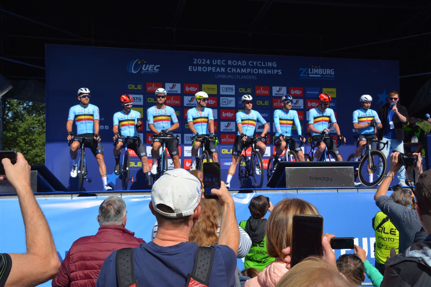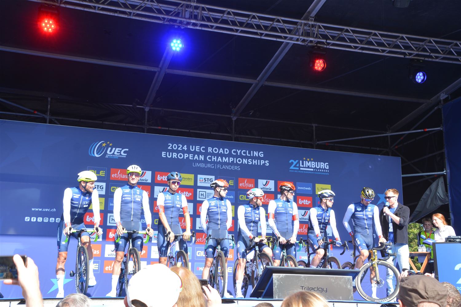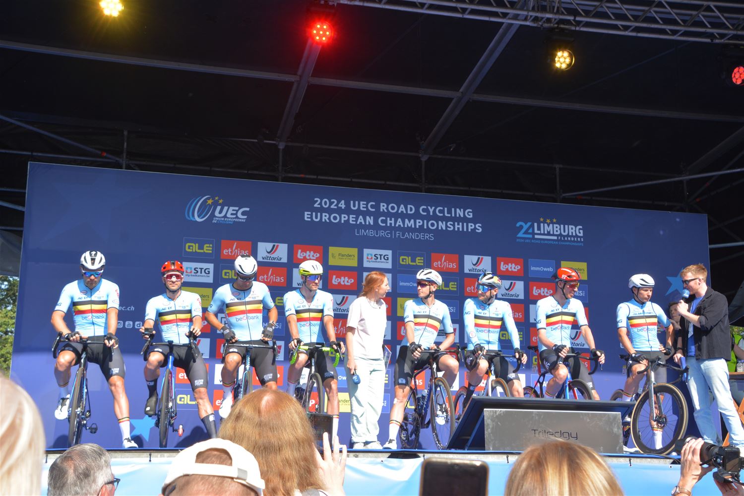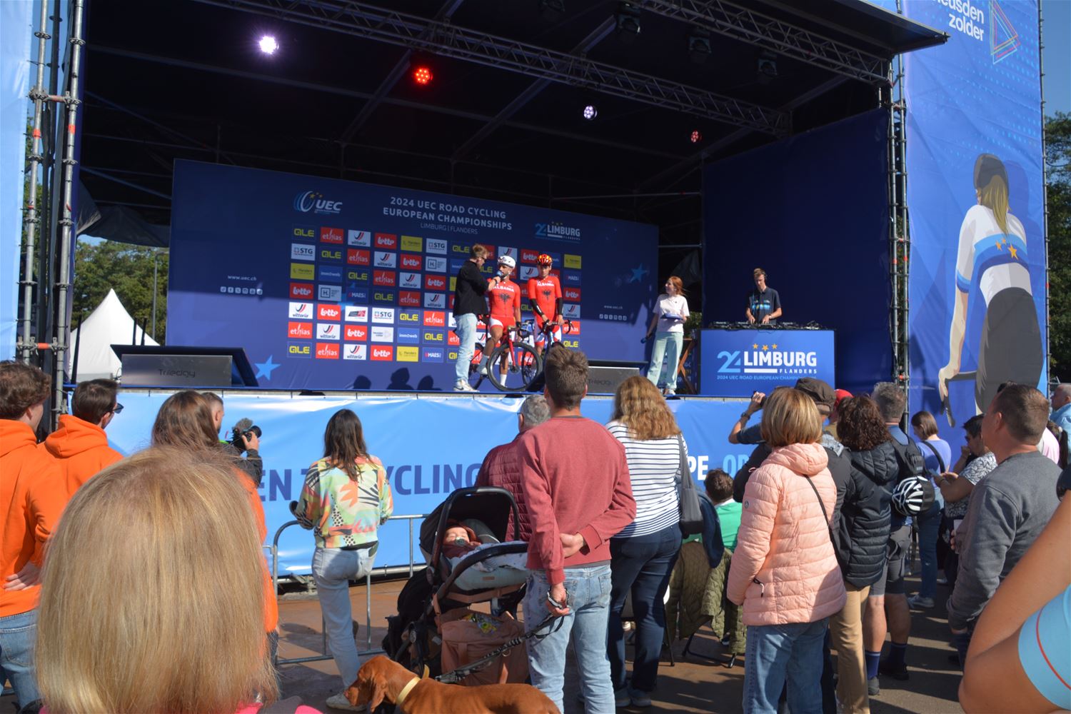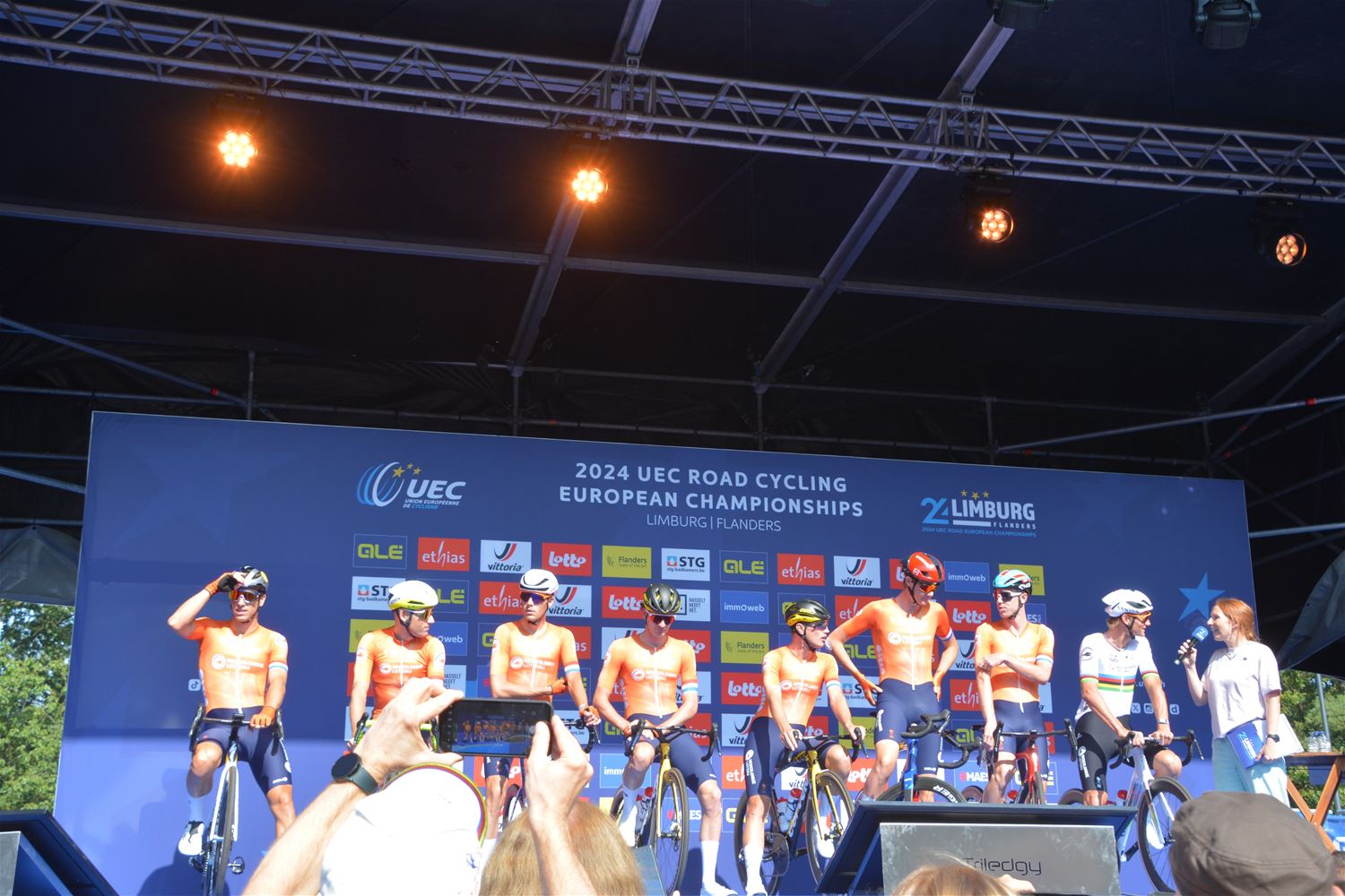 Er was vandaag veel volk opgedaagd voor de voorstelling van de eliterenners voor de wegrit. De fanzone was goed volgelopen toen op het podium de verschillende landenploegen werden voorgesteld, met ook een aantal interviews. De meeste renners oogden nog ontspannen en er konden nog wat grapjes af. Er vielen wat verrassingen te beleven onder meer een Litouwer en de renner van Vaticaanstad die beiden Nederlands bleken te spreken. Andere landenploegen mankeerden enkele renners wegens ziekte. En het Spaanse team kreeg zelfs exclusief een Limburgse vlaai cadeau. Voor Christophe Laporte en de andere Fransen klonk spontaan een Marseillaise uit het publiek. Een fel toegejuichte Mathieu van der Poel zag het helemaal zitten om voor de Europese trui te gaan die hij nog niet bezit, maar wil evenzeer de spurt aantrekken voor zijn landnoot Kooij. De Belgische spurtbommen Jasper Philipsen en Tim Merlier grapten dan weer dat ze elk een kant van de weg zouden kiezen. Ze konden in ieder geval rekenen op heel wat aanmoedigingen. (foto's Marina Poelmans)83043