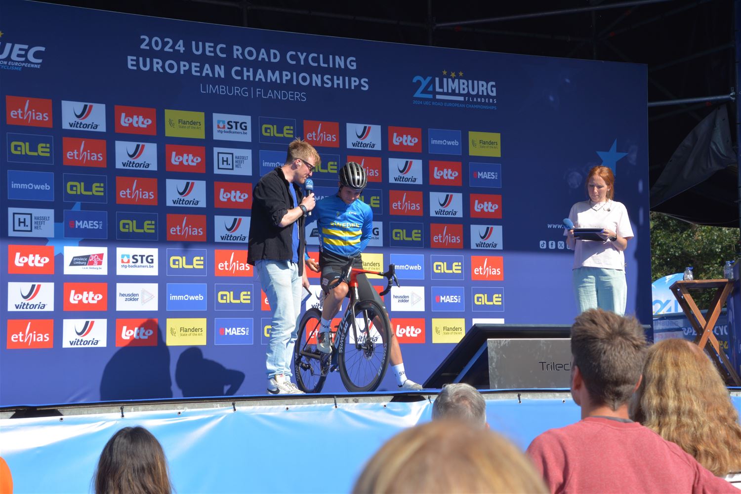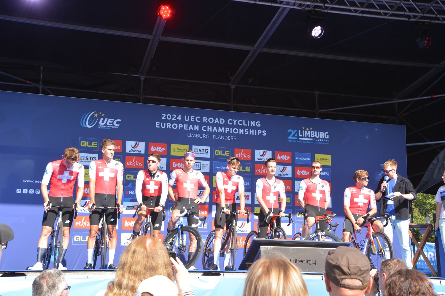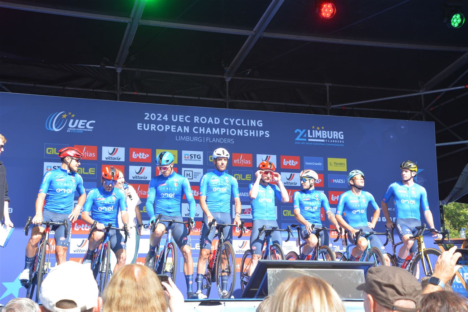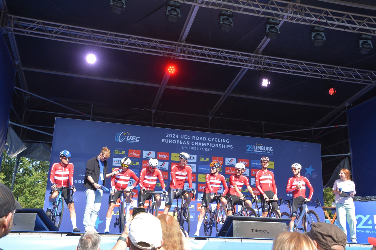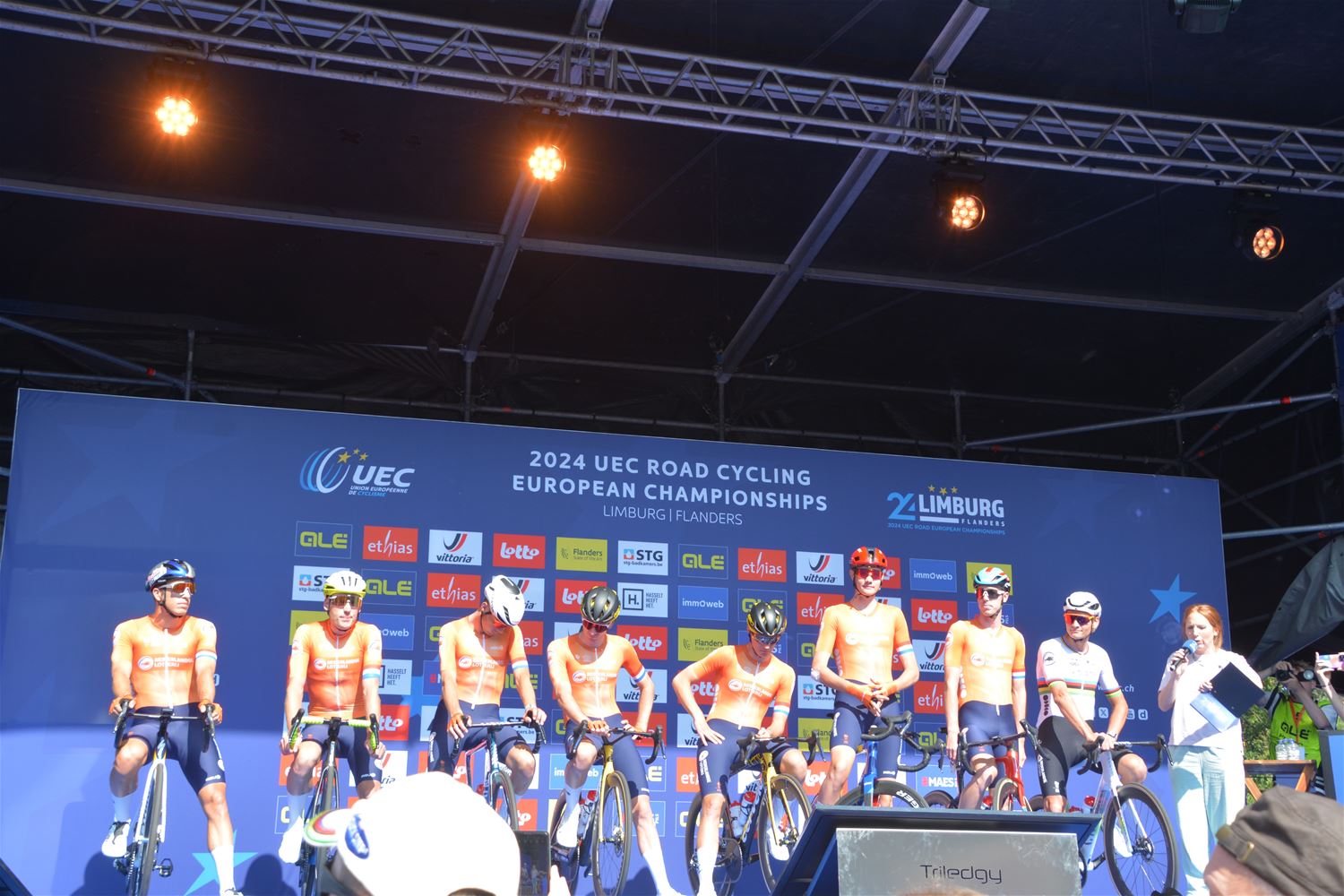 Er was vandaag veel volk opgedaagd voor de voorstelling van de eliterenners voor de wegrit. De fanzone was goed volgelopen toen op het podium de verschillende landenploegen werden voorgesteld, met ook een aantal interviews. De meeste renners oogden nog ontspannen en er konden nog wat grapjes af. Er vielen wat verrassingen te beleven onder meer een Litouwer en de renner van Vaticaanstad die beiden Nederlands bleken te spreken. Andere landenploegen mankeerden enkele renners wegens ziekte. En het Spaanse team kreeg zelfs exclusief een Limburgse vlaai cadeau. Voor Christophe Laporte en de andere Fransen klonk spontaan een Marseillaise uit het publiek. Een fel toegejuichte Mathieu van der Poel zag het helemaal zitten om voor de Europese trui te gaan die hij nog niet bezit, maar wil evenzeer de spurt aantrekken voor zijn landnoot Kooij. De Belgische spurtbommen Jasper Philipsen en Tim Merlier grapten dan weer dat ze elk een kant van de weg zouden kiezen. Ze konden in ieder geval rekenen op heel wat aanmoedigingen. (foto's Marina Poelmans)83043