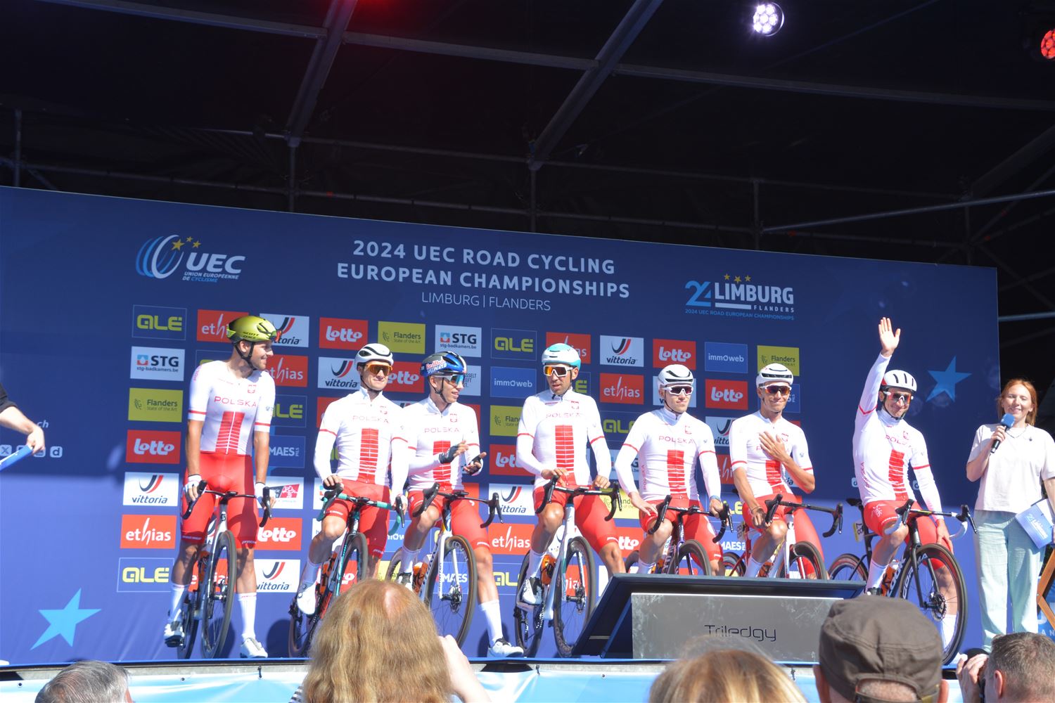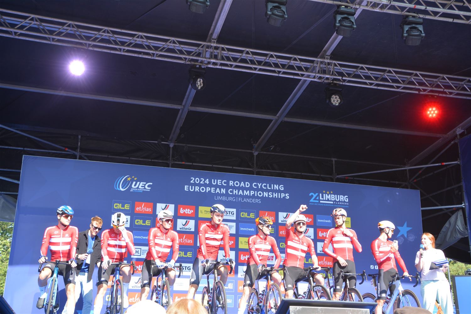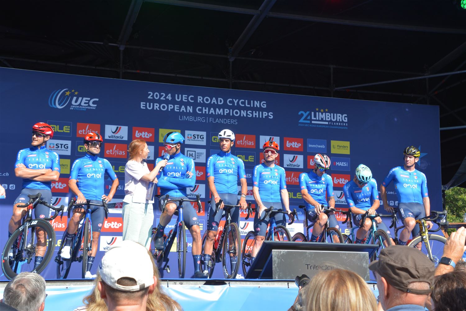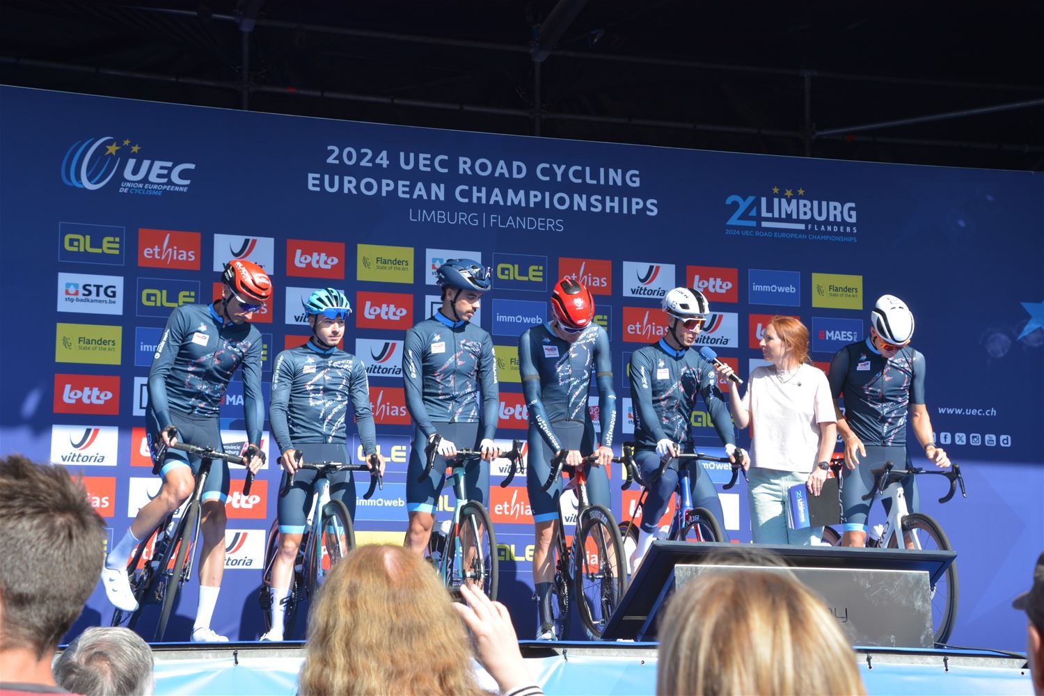 Er was vandaag veel volk opgedaagd voor de voorstelling van de eliterenners voor de wegrit. De fanzone was goed volgelopen toen op het podium de verschillende landenploegen werden voorgesteld, met ook een aantal interviews. De meeste renners oogden nog ontspannen en er konden nog wat grapjes af. Er vielen wat verrassingen te beleven onder meer een Litouwer en de renner van Vaticaanstad die beiden Nederlands bleken te spreken. Andere landenploegen mankeerden enkele renners wegens ziekte. En het Spaanse team kreeg zelfs exclusief een Limburgse vlaai cadeau. Voor Christophe Laporte en de andere Fransen klonk spontaan een Marseillaise uit het publiek. Een fel toegejuichte Mathieu van der Poel zag het helemaal zitten om voor de Europese trui te gaan die hij nog niet bezit, maar wil evenzeer de spurt aantrekken voor zijn landnoot Kooij. De Belgische spurtbommen Jasper Philipsen en Tim Merlier grapten dan weer dat ze elk een kant van de weg zouden kiezen. Ze konden in ieder geval rekenen op heel wat aanmoedigingen. (foto's Marina Poelmans)83043