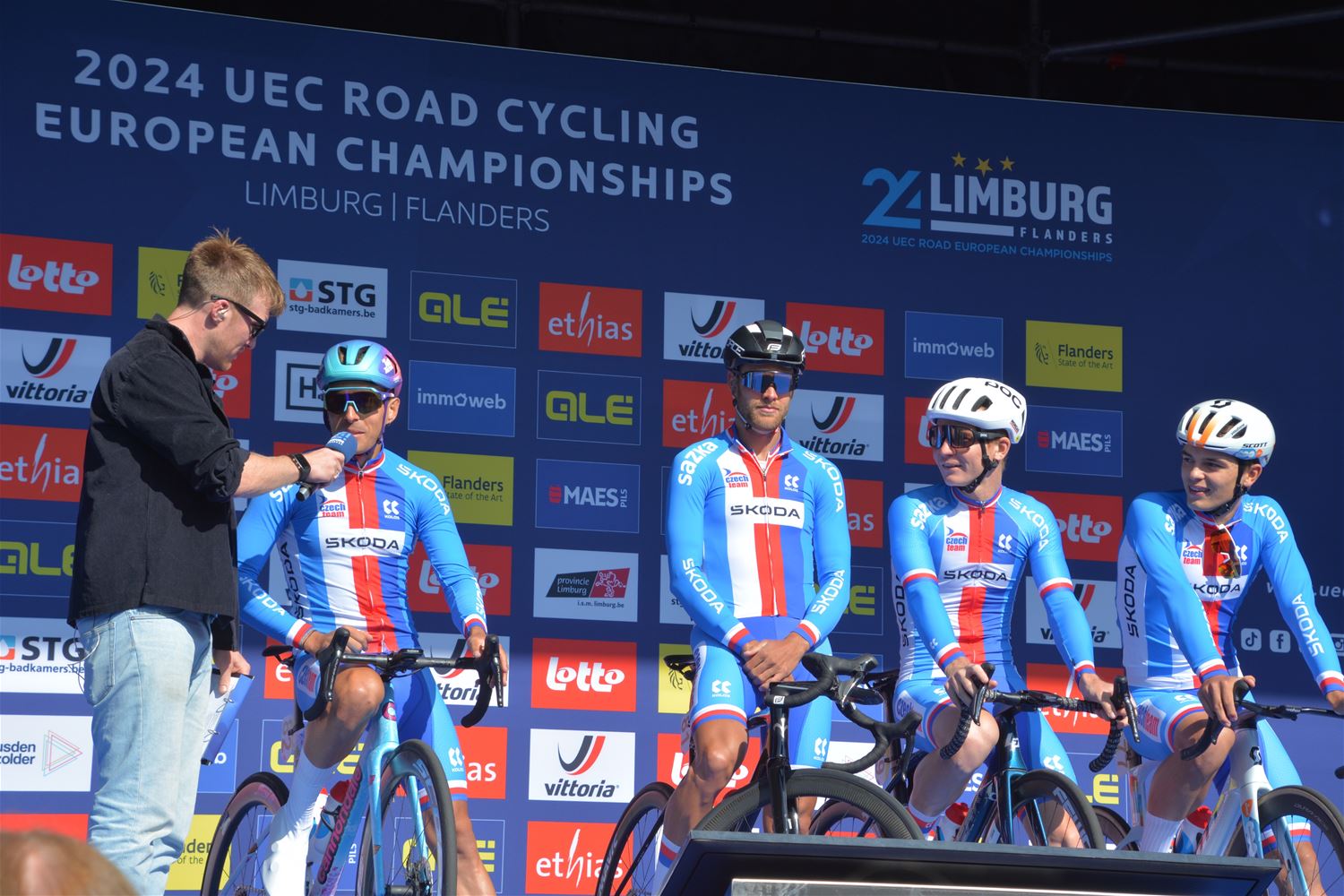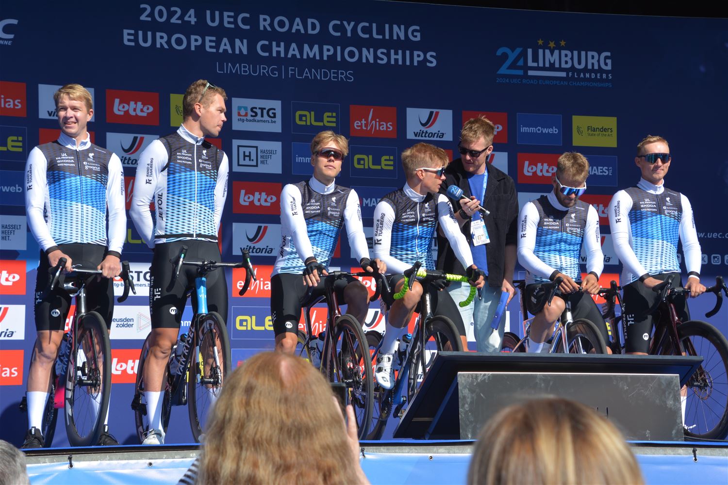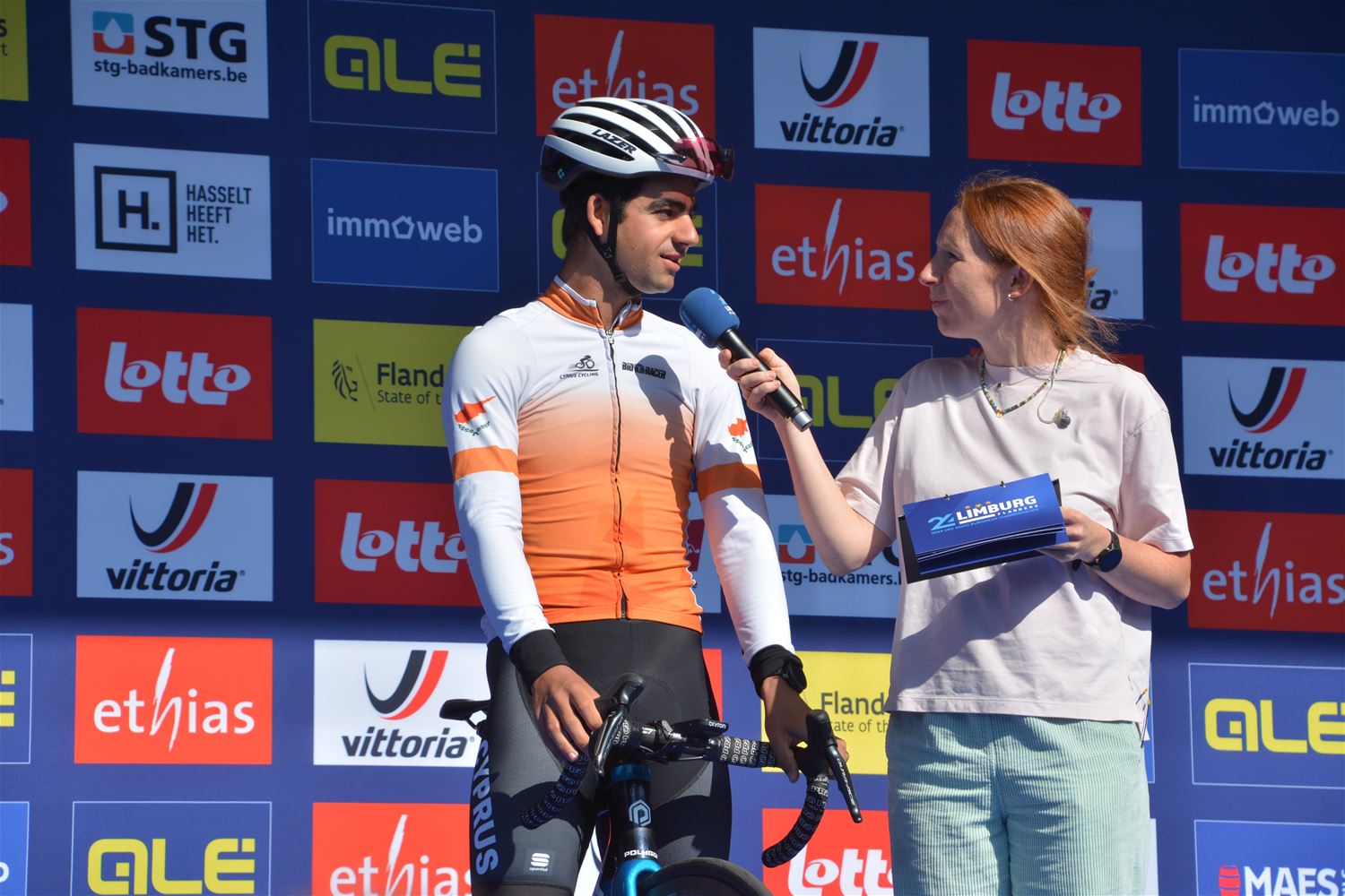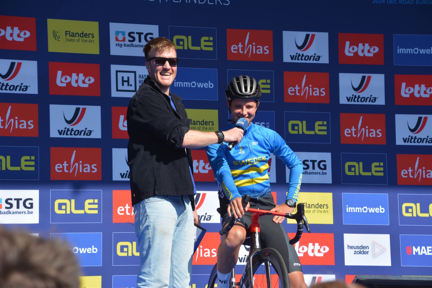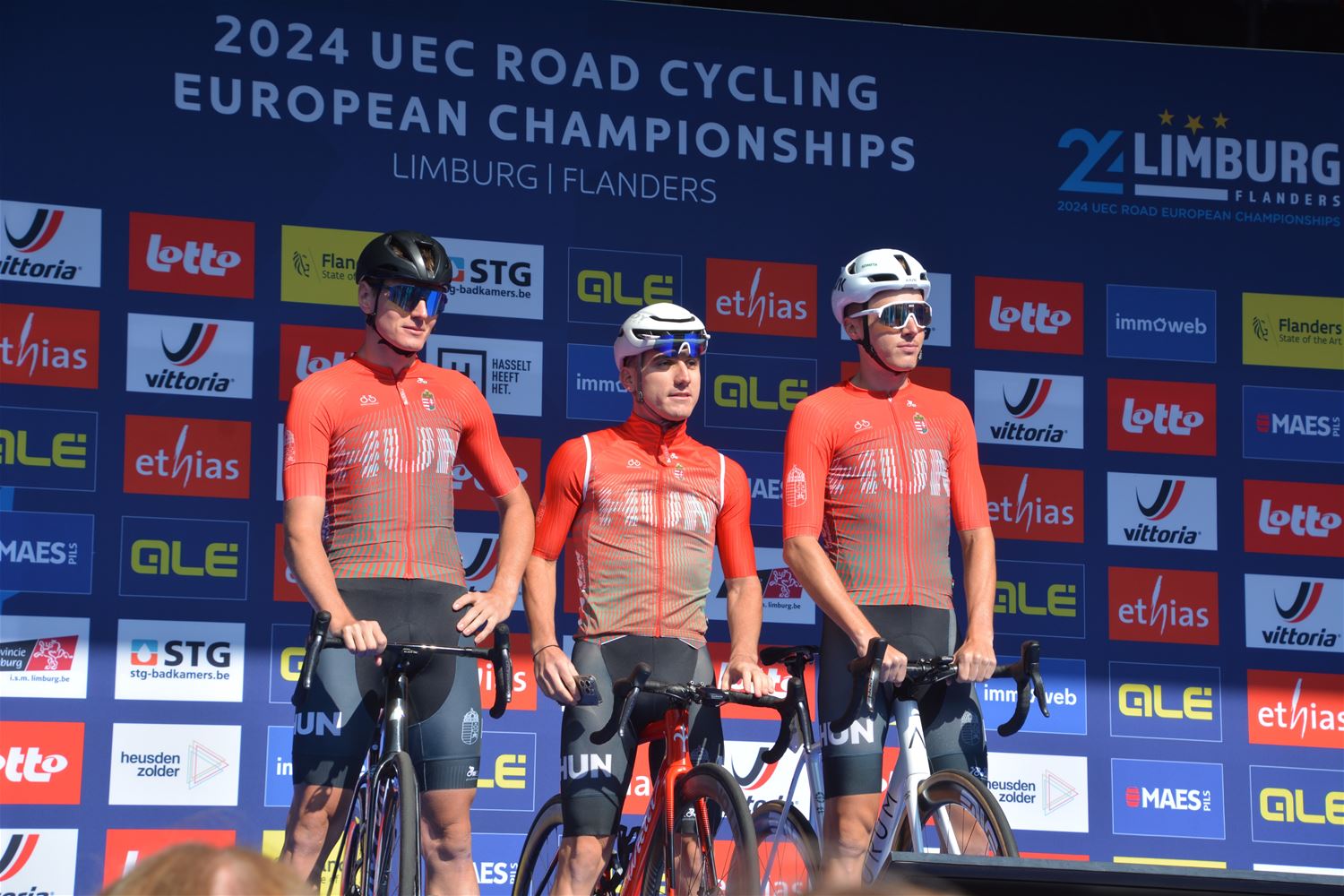 Er was vandaag veel volk opgedaagd voor de voorstelling van de eliterenners voor de wegrit. De fanzone was goed volgelopen toen op het podium de verschillende landenploegen werden voorgesteld, met ook een aantal interviews. De meeste renners oogden nog ontspannen en er konden nog wat grapjes af. Er vielen wat verrassingen te beleven onder meer een Litouwer en de renner van Vaticaanstad die beiden Nederlands bleken te spreken. Andere landenploegen mankeerden enkele renners wegens ziekte. En het Spaanse team kreeg zelfs exclusief een Limburgse vlaai cadeau. Voor Christophe Laporte en de andere Fransen klonk spontaan een Marseillaise uit het publiek. Een fel toegejuichte Mathieu van der Poel zag het helemaal zitten om voor de Europese trui te gaan die hij nog niet bezit, maar wil evenzeer de spurt aantrekken voor zijn landnoot Kooij. De Belgische spurtbommen Jasper Philipsen en Tim Merlier grapten dan weer dat ze elk een kant van de weg zouden kiezen. Ze konden in ieder geval rekenen op heel wat aanmoedigingen. (foto's Marina Poelmans)83043