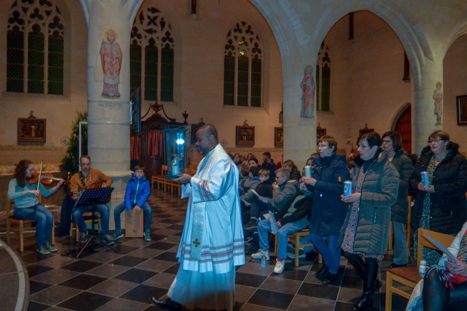 Het Vredeslicht uit Bethlehem in Palestina is vanavond aangekomen in de Sint-Vincentiuskerk in Zolder. Het is een traditie dat het vlammetje in de eindejaarsperiode vanuit Bethlehem wordt overgebracht naar Wenen in Oostenrijk en van daaruit verder verspreid over Europa. Vanuit Tongeren werd het naar de Limburgse dekenaten gebracht. Twee vormselkathechisten zijn het gaan ophalen in Tongeren en gaven het vanavond door aan de vormelingen van de federatie Zolder. Ook pastoor Ghislain nam het in ontvangst en het zal in de Sint-Vincentiuskerk blijven branden tot Kerstmis. Rond het geheel werd een stemmingsvolle viering gebouwd, waarbij jongeren ook voor de muzikale opluistering zorgden. Tegen de achtergrond van de gebeurtenissen in Palestina en Israël krijgt het vredeslicht wel een heel aparte betekenis. (foto's David Amgad)79470