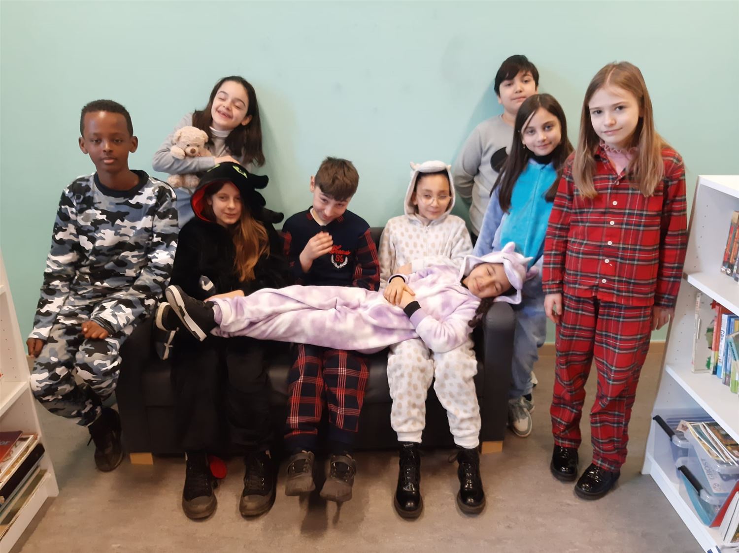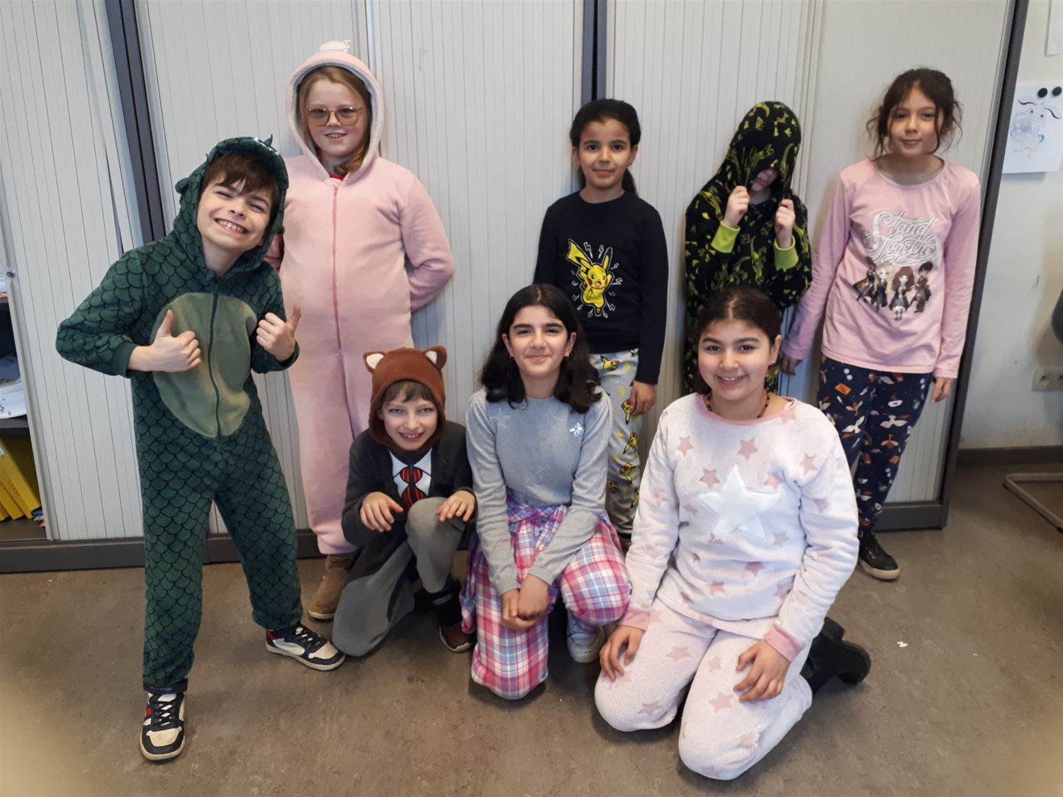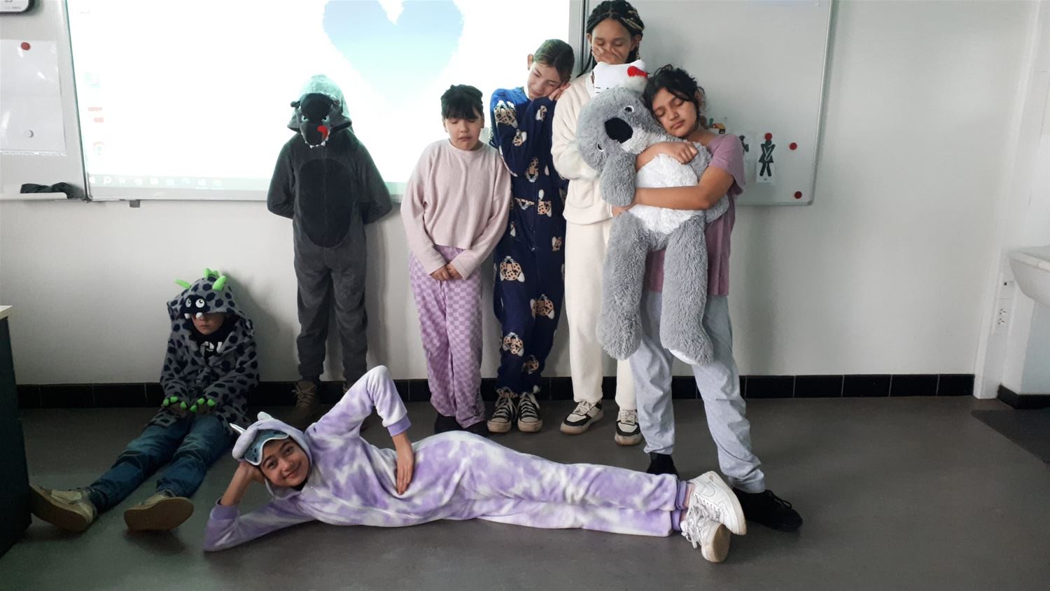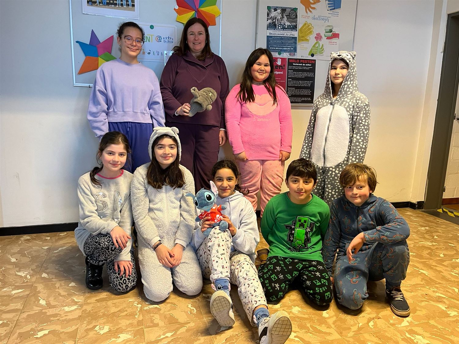 Neen, ze hebben niet heel de dag geslapen in VLS De Brug, ondanks de pyjama's is er wel degelijk les gegeven. Maar de leerlingen hebben zich solidair getoond met allen die niet in de klas kunnen zijn en via Bednet van thuis uit of vanuit het ziekenhuis de lessen moeten volgen. (foto's Inge Vreys)76929