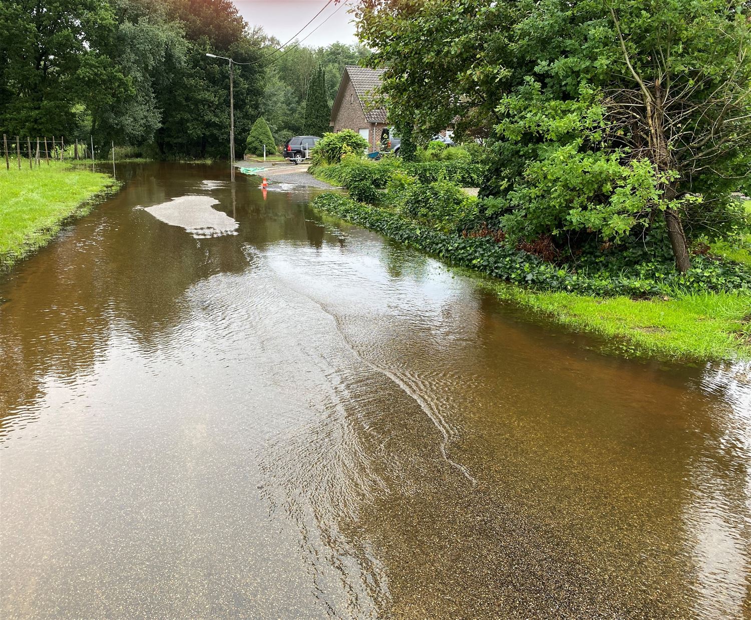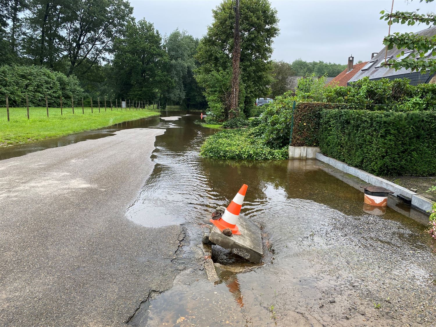 In 't Wiek is het water vanochtend langzaam aan het wegtrekken, het stroomt nu ook volop in de riolering. Gisteravond laat stond het water hoog in de straat nadat de beek was overgelopen. Het water is ook binnengestroomd in enkele huizen waar kelders onder water liepen. 70111