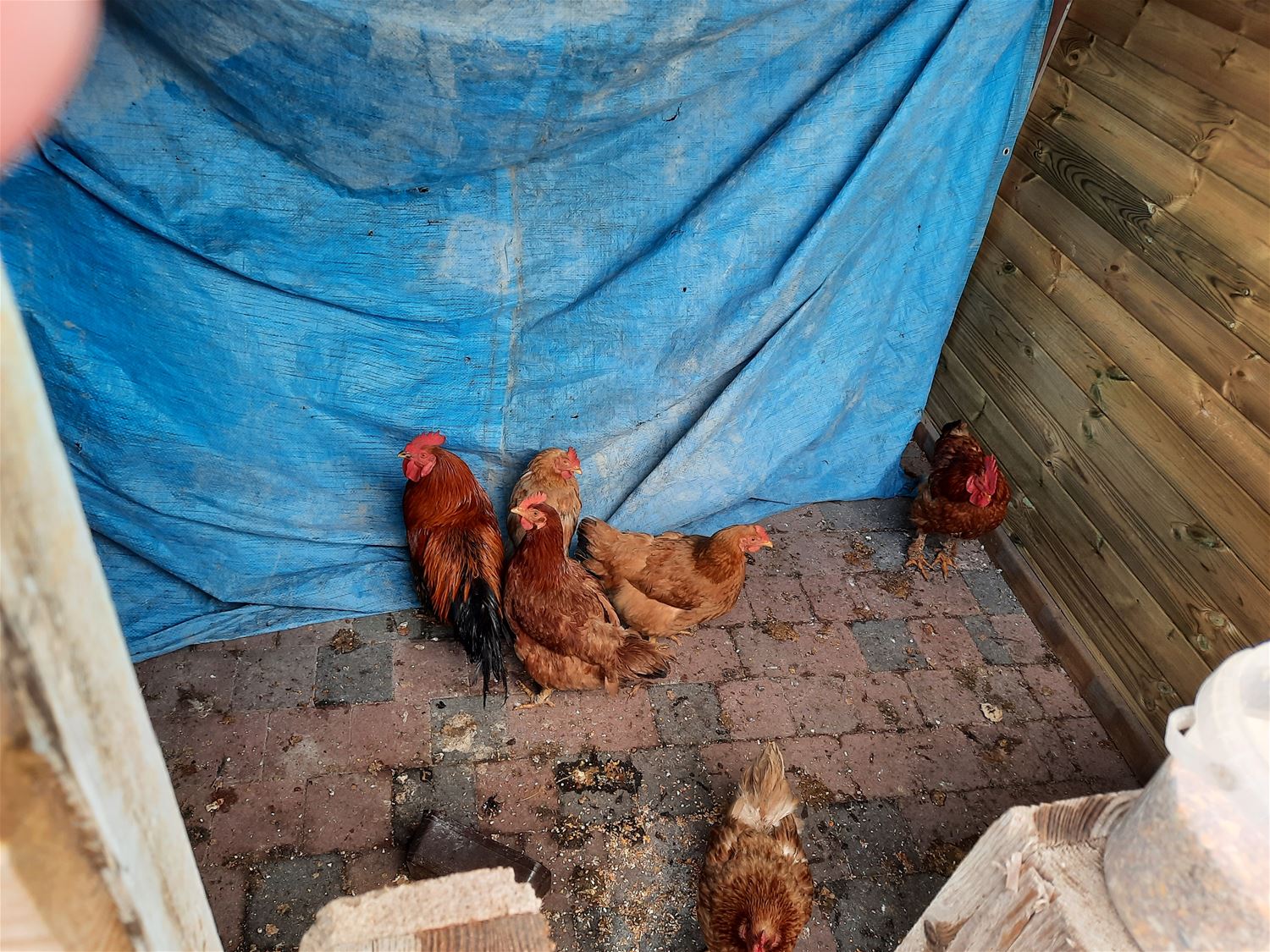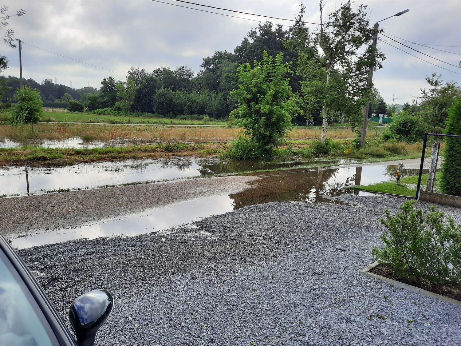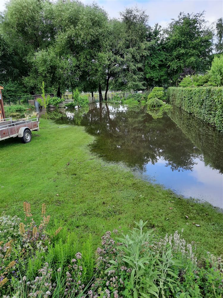 In de Beemdenstraat is het waterpeil wat gedaald, maar de bodem is volledig verzadigd waardoor tuinen nog onder water staan en de kippen voorlopig in hun geïmproviseerd hok blijven. Bewoners zijn er nu ook gestart met het leegpompen van (kruip)kelders. (foto's Lieve Gybels)70125