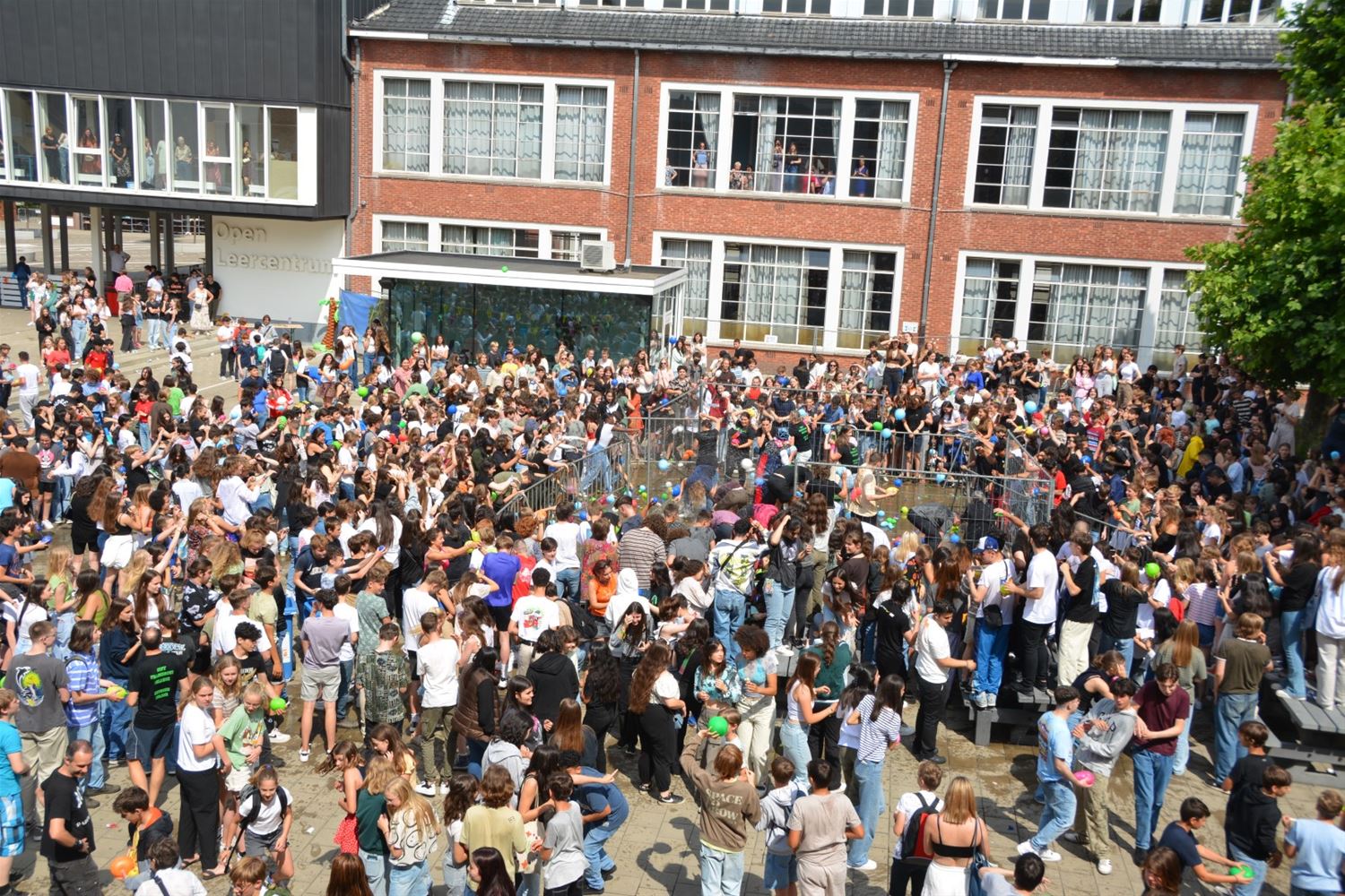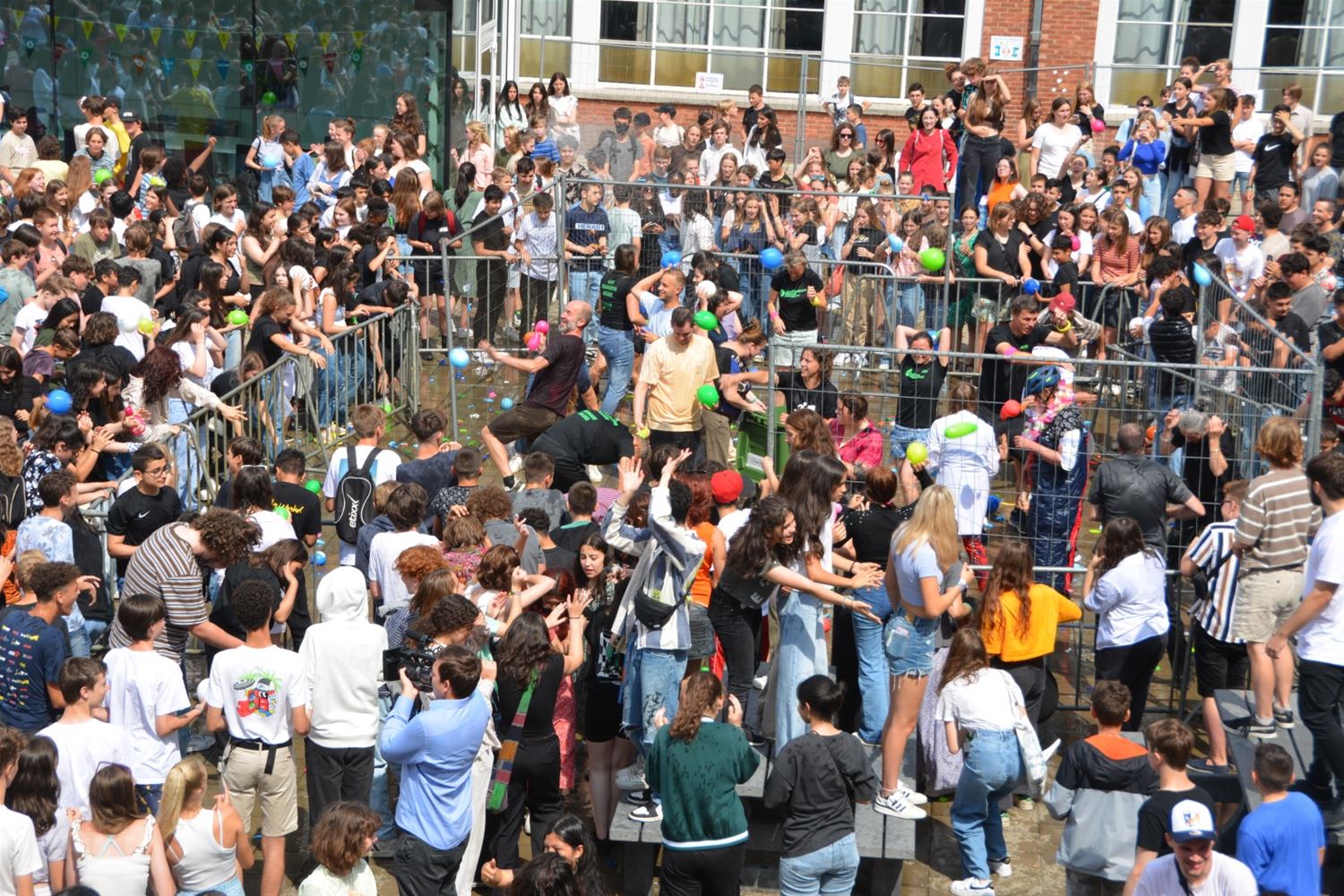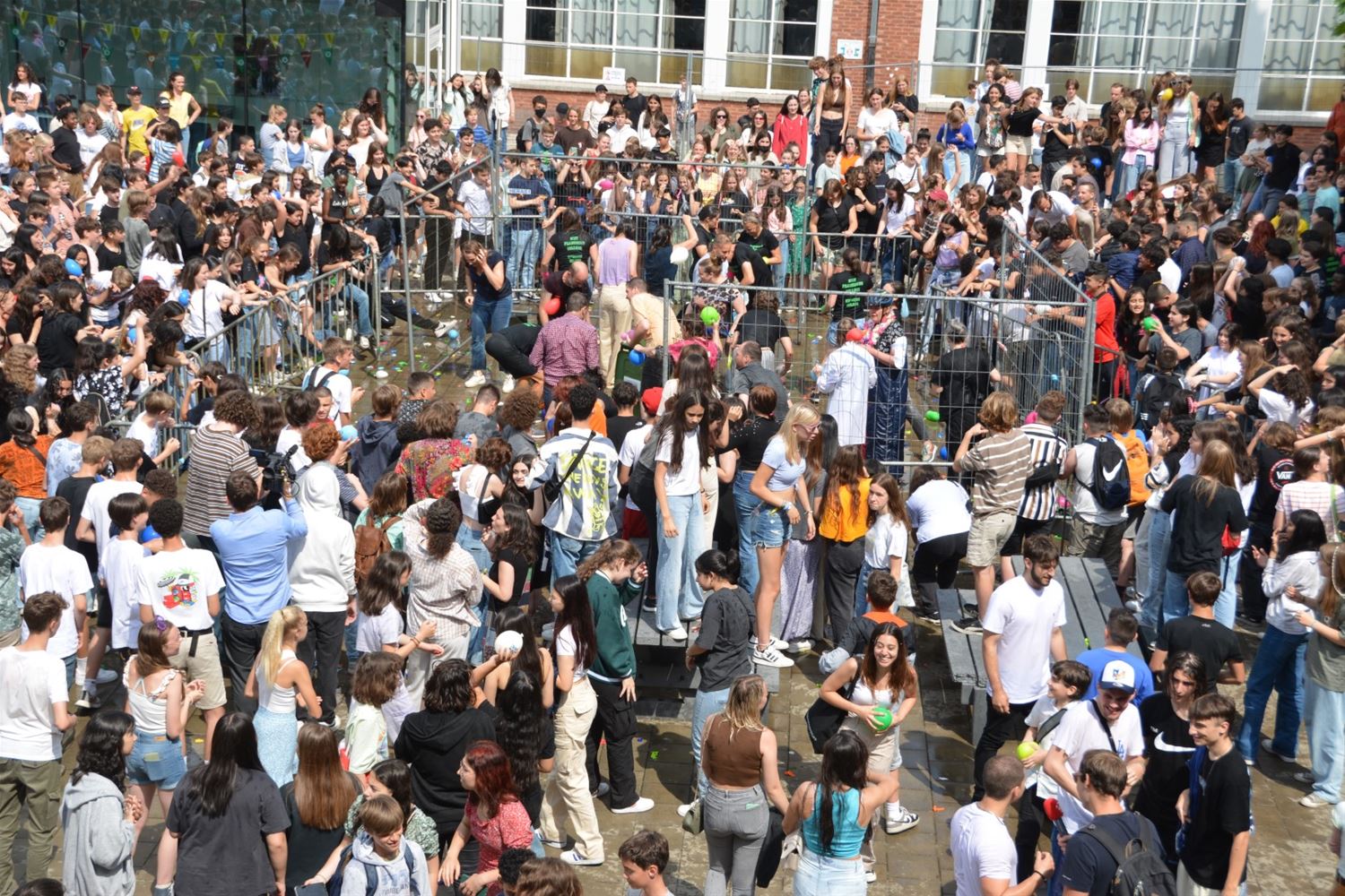 Als apotheose van de party is kort voor de middag op de speelplaats van het Sint-Franciscuscollege een gigantisch waterballonnengevecht losgebarsten. Gelukkig was gekozen voor behoorlijk sterke ballonnen die een aantal keren heen en weer gegooid konden worden alvorens te barsten en het slachtoffer op een douche te trakteren. (video en foto's Marina Poelmans)74514