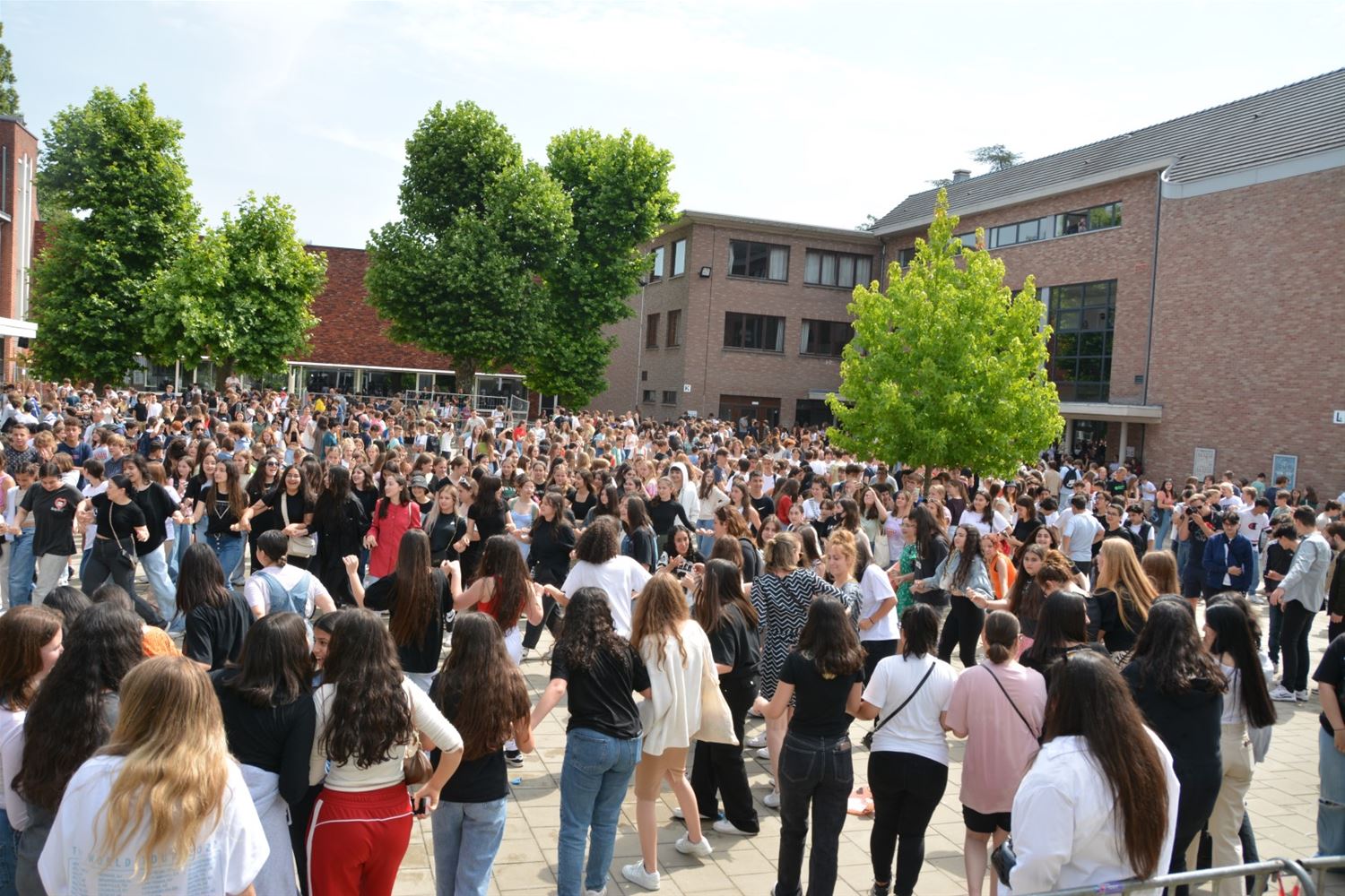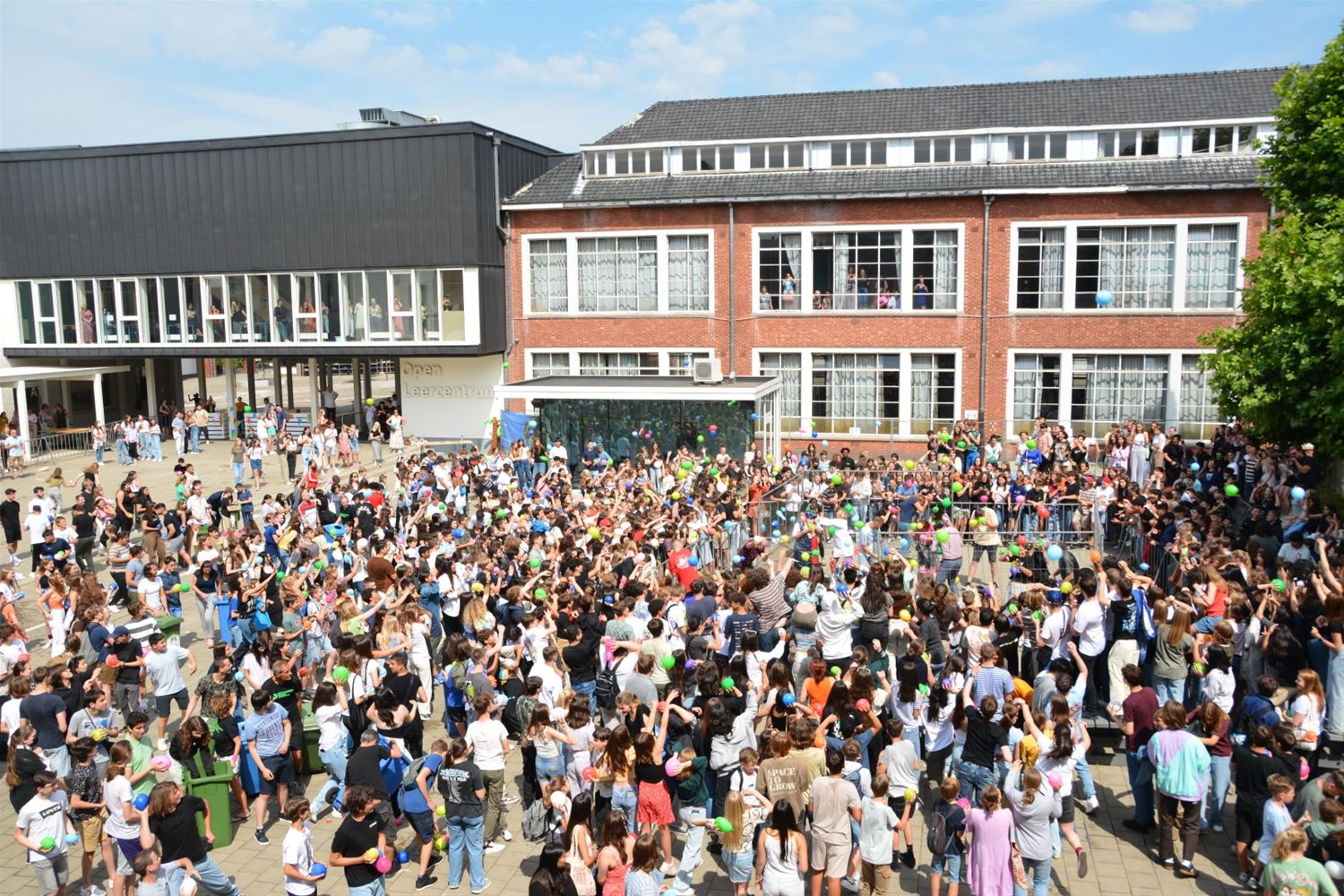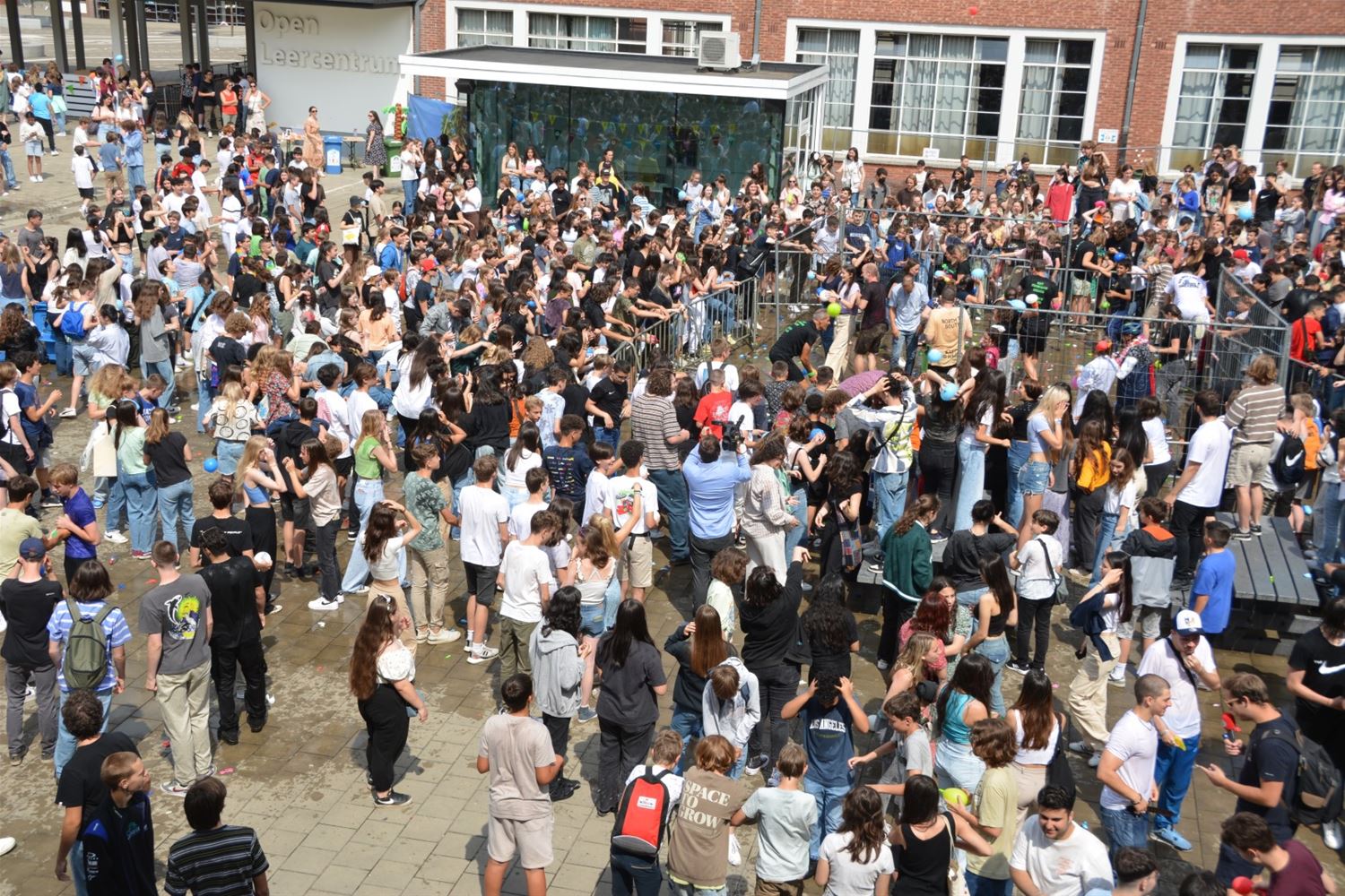 Als apotheose van de party is kort voor de middag op de speelplaats van het Sint-Franciscuscollege een gigantisch waterballonnengevecht losgebarsten. Gelukkig was gekozen voor behoorlijk sterke ballonnen die een aantal keren heen en weer gegooid konden worden alvorens te barsten en het slachtoffer op een douche te trakteren. (video en foto's Marina Poelmans)74514