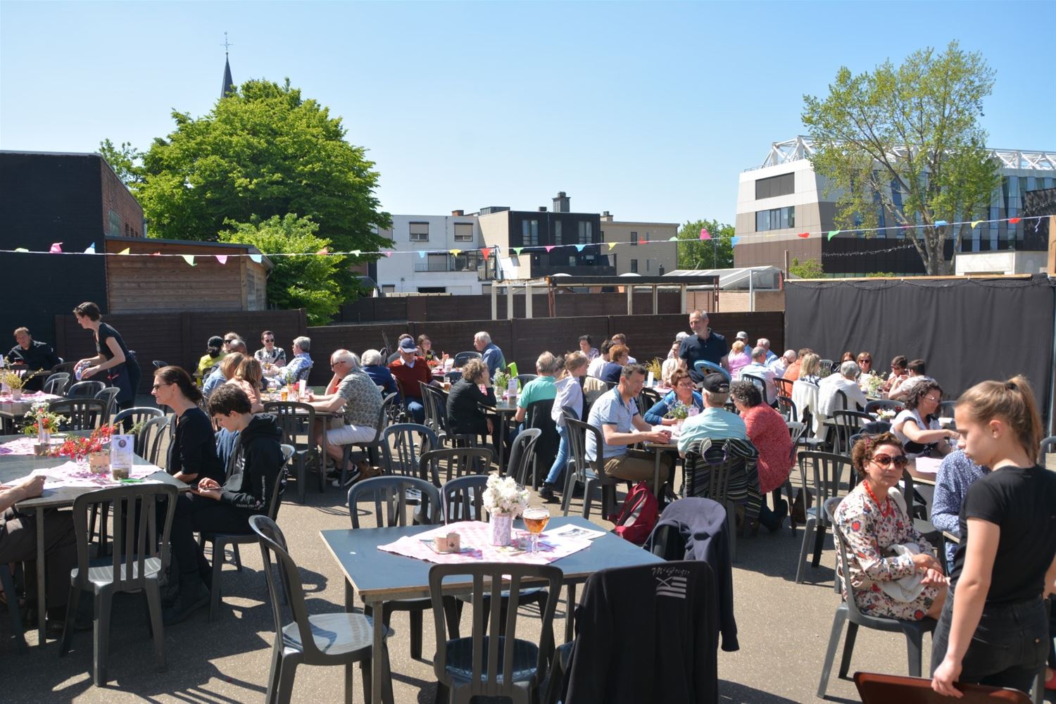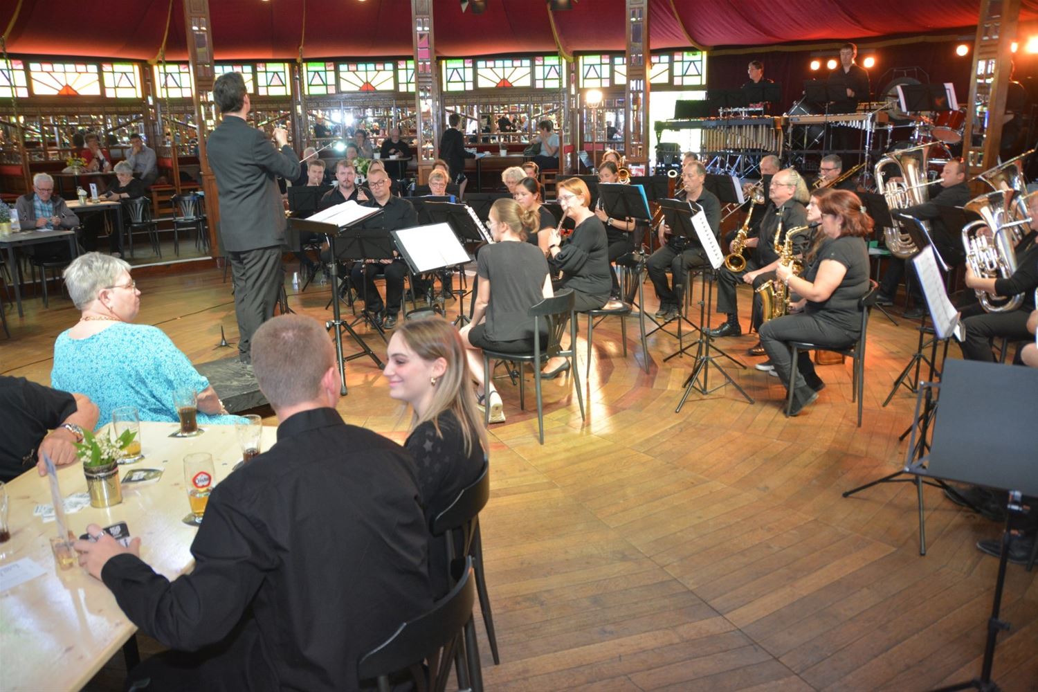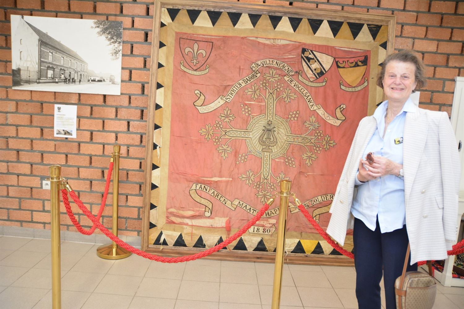 Het is vandaag opnieuw een succesvolle dag voor de Koninklijke Harmonie De Ware Vrienden. Heel de dag door spelen er harmonieën in de spiegeltent. Op de foto MuzALLiEk Westmalle. Ook buiten was het druk, velen genoten van het zonovergoten terras en de barbecue telde ruim 400 deelnemers. Ook de barones van Vogelsanck was zondagnamiddag present, het waren immers de baronnen van Vogelsanck die de harmonie in de loop der jaren hebben gesticht en ondersteund. Ze bezocht ook de tentoonstelling, op de foto bij de historische vlag die naar Vogelsanck verwijst. 73006