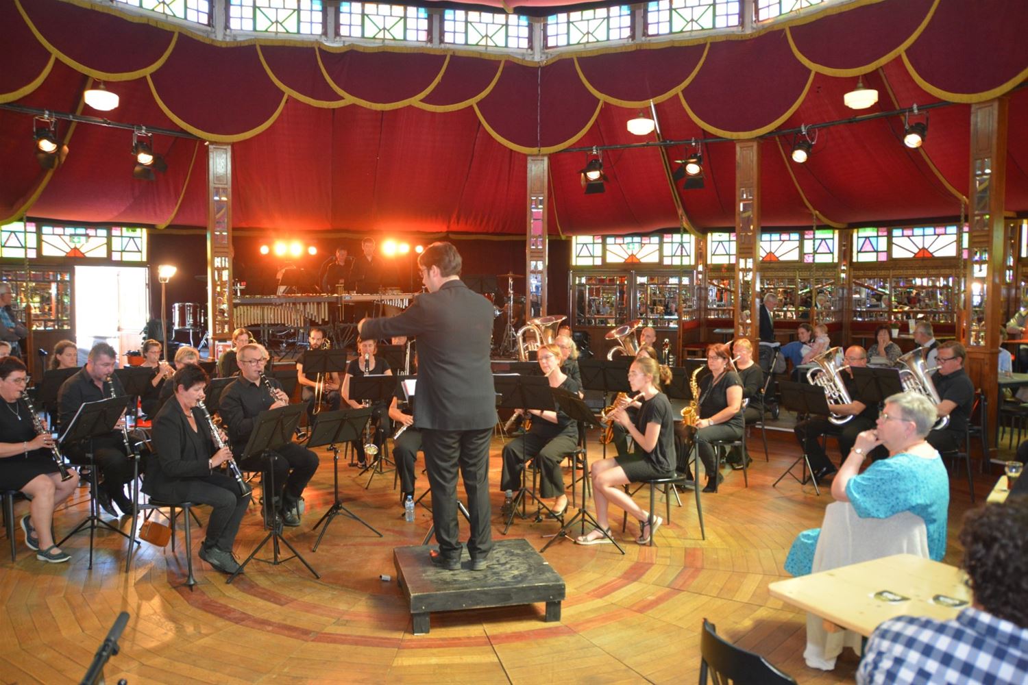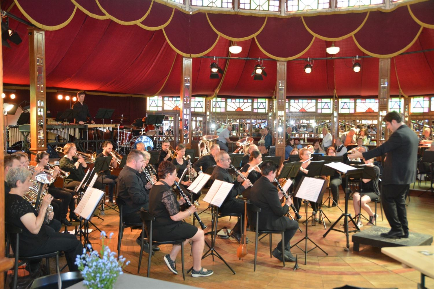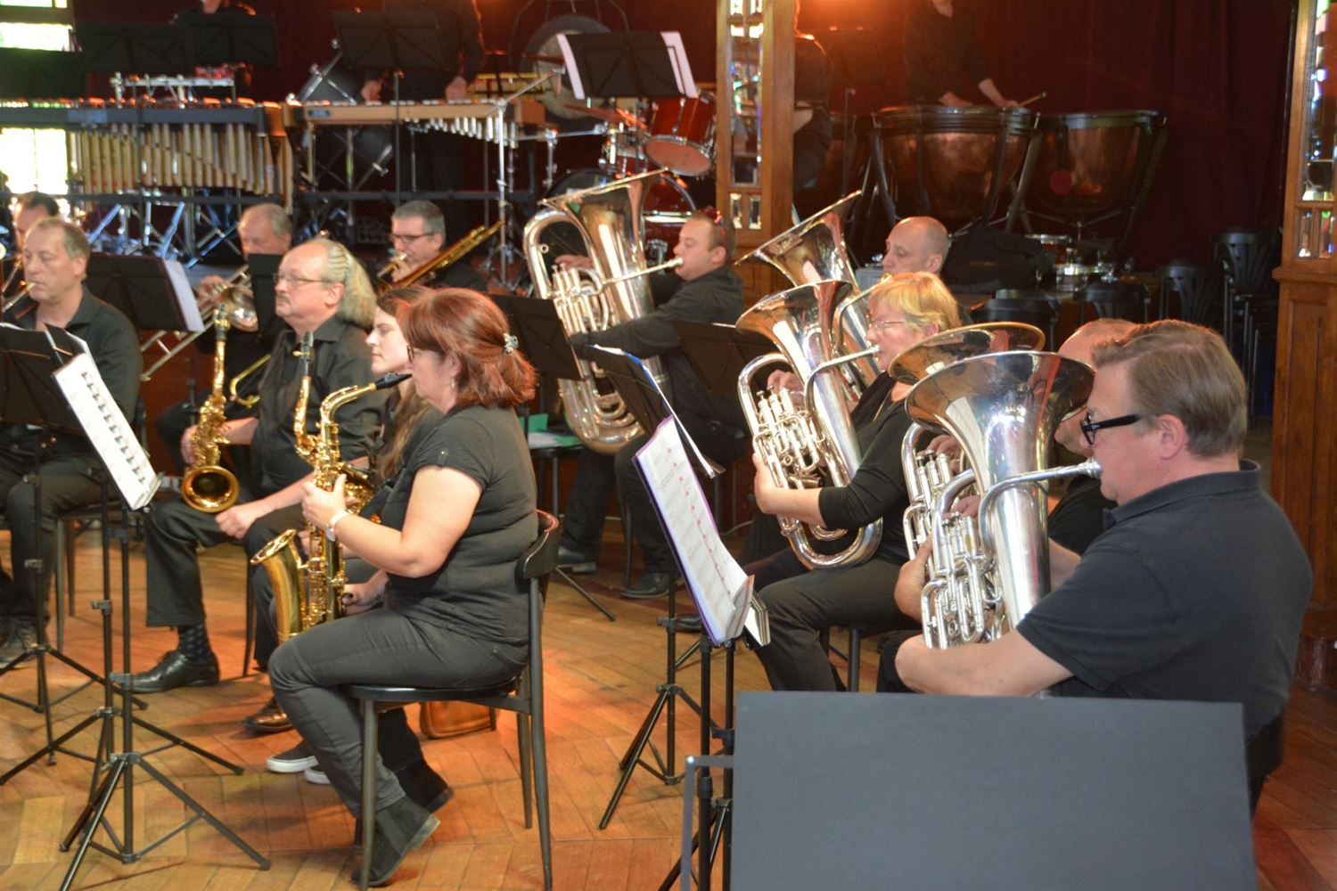 Het is vandaag opnieuw een succesvolle dag voor de Koninklijke Harmonie De Ware Vrienden. Heel de dag door spelen er harmonieën in de spiegeltent. Op de foto MuzALLiEk Westmalle. Ook buiten was het druk, velen genoten van het zonovergoten terras en de barbecue telde ruim 400 deelnemers. Ook de barones van Vogelsanck was zondagnamiddag present, het waren immers de baronnen van Vogelsanck die de harmonie in de loop der jaren hebben gesticht en ondersteund. Ze bezocht ook de tentoonstelling, op de foto bij de historische vlag die naar Vogelsanck verwijst. 73006