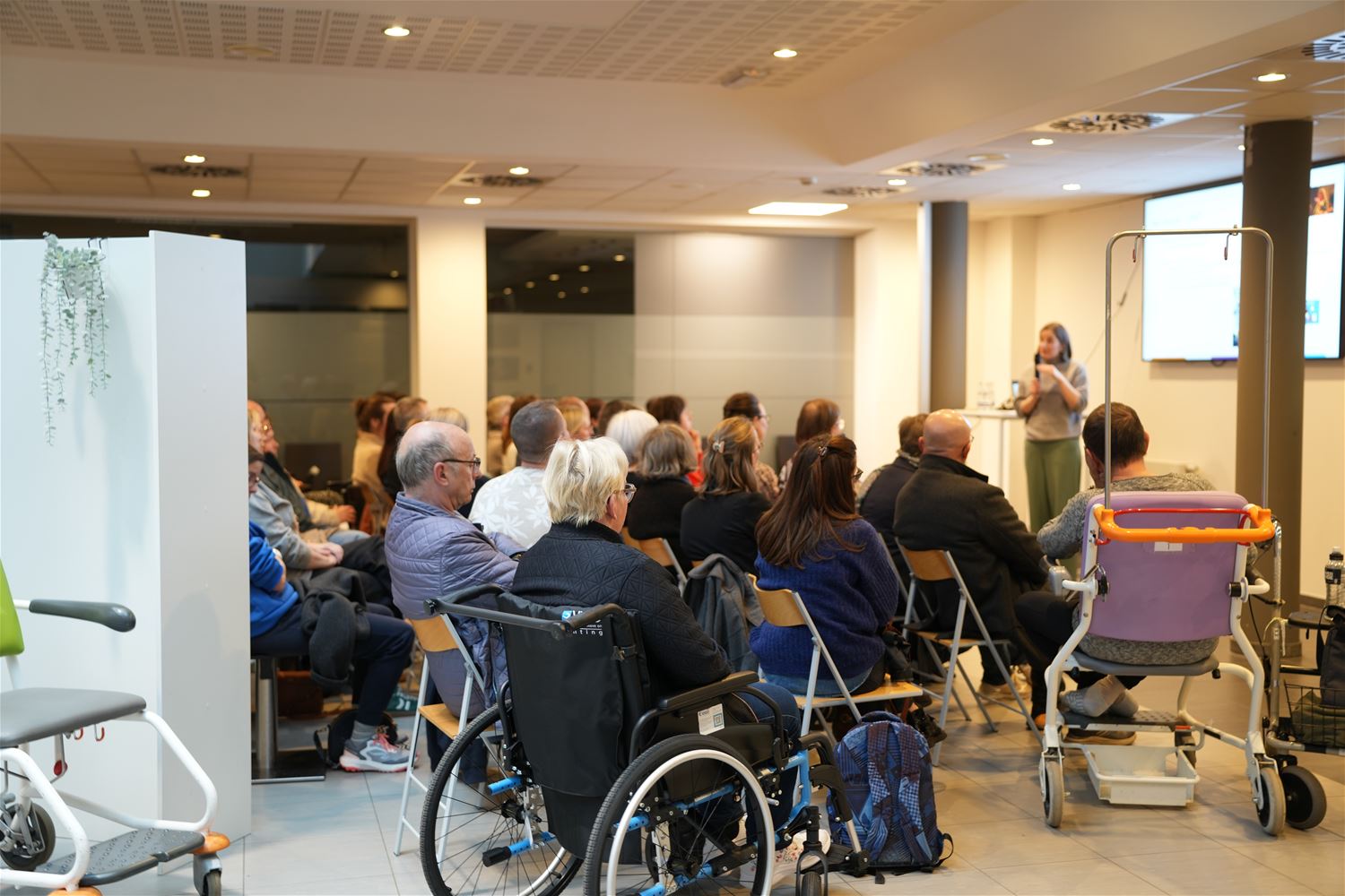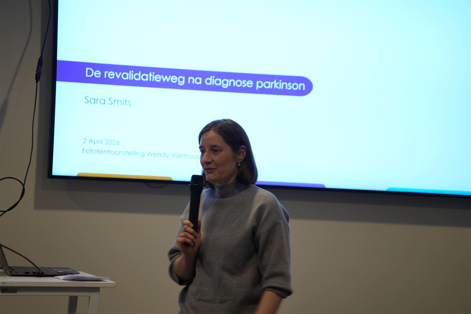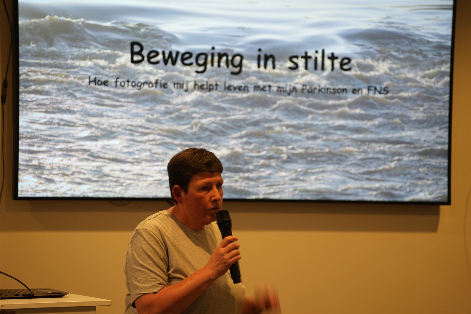 Er was vanavond erg veel belangstelling voor de opening van de tentoonstelling "Beweging in stilte" in het Sint-Franciscusziekenhuis. Het gaat om foto’s van Wendy Vanhoudt, zij bracht een getuigenis over leven met Parkinson en Functionele Neurologische Stoornis (FNS). Ze toont hoe ze haar leven na haar diagnose een invulling heeft kunnen geven. Ze vertelt over haar zoektocht naar iets dat haar identiteit versterkt en haar energie geeft en over hoe belangrijk het is om meer te zijn dan haar ziekte. Fotografie werd een vorm van therapie, een manier om rust te vinden in een lichaam dat niet altijd meewerkt, om opnieuw verbinding te maken met zichzelf en met de wereld rondom. Ondanks haar trillingen slaagt ze erin om fantastische beelden in macrofotografie te maken. Ze presenteert in de expo dan ook prachtige natuurfoto’s. De opening van de tentoonstelling kreeg nog meer inhoudelijke invulling onder meer door de uitleg van neuroloog dokter Josje Voncken over de impact van Parkinson op je lichaam. Sara Smits van de dienst revalidatie belichtte het belang van veerkracht en in beweging blijven. De tentoonstelling van Wendy Vanhoudt is te bekijken in de inkomhal van het ziekenhuis. (foto’s Johan Put)88174