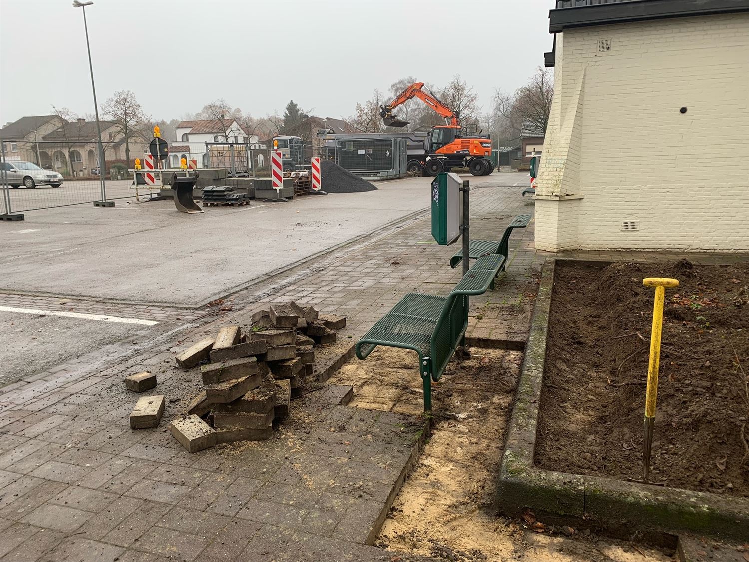 Na een dagje uitstel wegens het winterweer, zijn vandaag de werkzaamheden van start gegaan om de stoepen langs het Koning Boudewijnplein te vernieuwen. Die worden fase per fase aangepakt. Als het weer niet nog eens roet - of sneeuw - in het eten strooit, zou iedereen over ongeveer drie maanden zonder struikelen over de voetpaden moeten kunnen. Ondertussen blijkt ook zoals verwacht dat boomwortels medeplichtig zijn aan de omhoog gekomen klinkers. (foto's Julien Maebe)79361