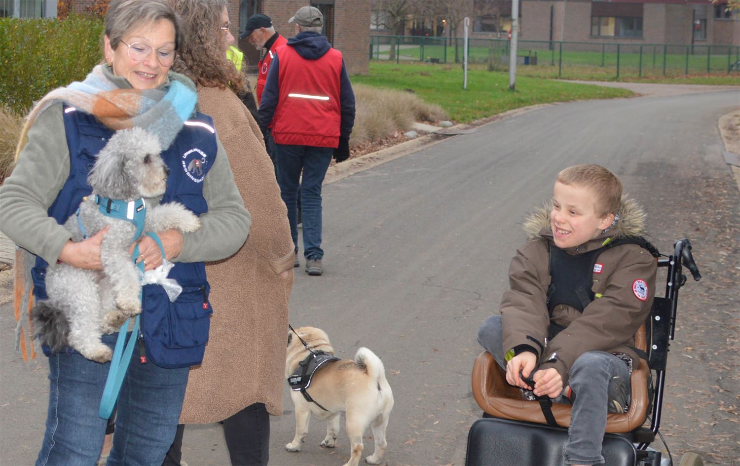 Het was vanmorgen een gezellige drukte aan 't Weyerke waar de Limburgse Reddings- en Therapiehonden neerstreken. De organisatie komt twee keer per maand langs in 't Weyerke - en bij nog 8 andere organisaties - om met de gasten te wandelen en hen te laten knuffelen met de honden. Die bezoeken hebben hun voordelen zoals beweging van de mensen, minder stress, ontstaan van sociale banden en ook lichamelijke voordelen. Vandaag was een bijzondere oproep gedaan naar andere eigenaars, in de hoop dat hier nog extra vrijwilligers met honden uit voortkomen. (foto's David Amgad)76010