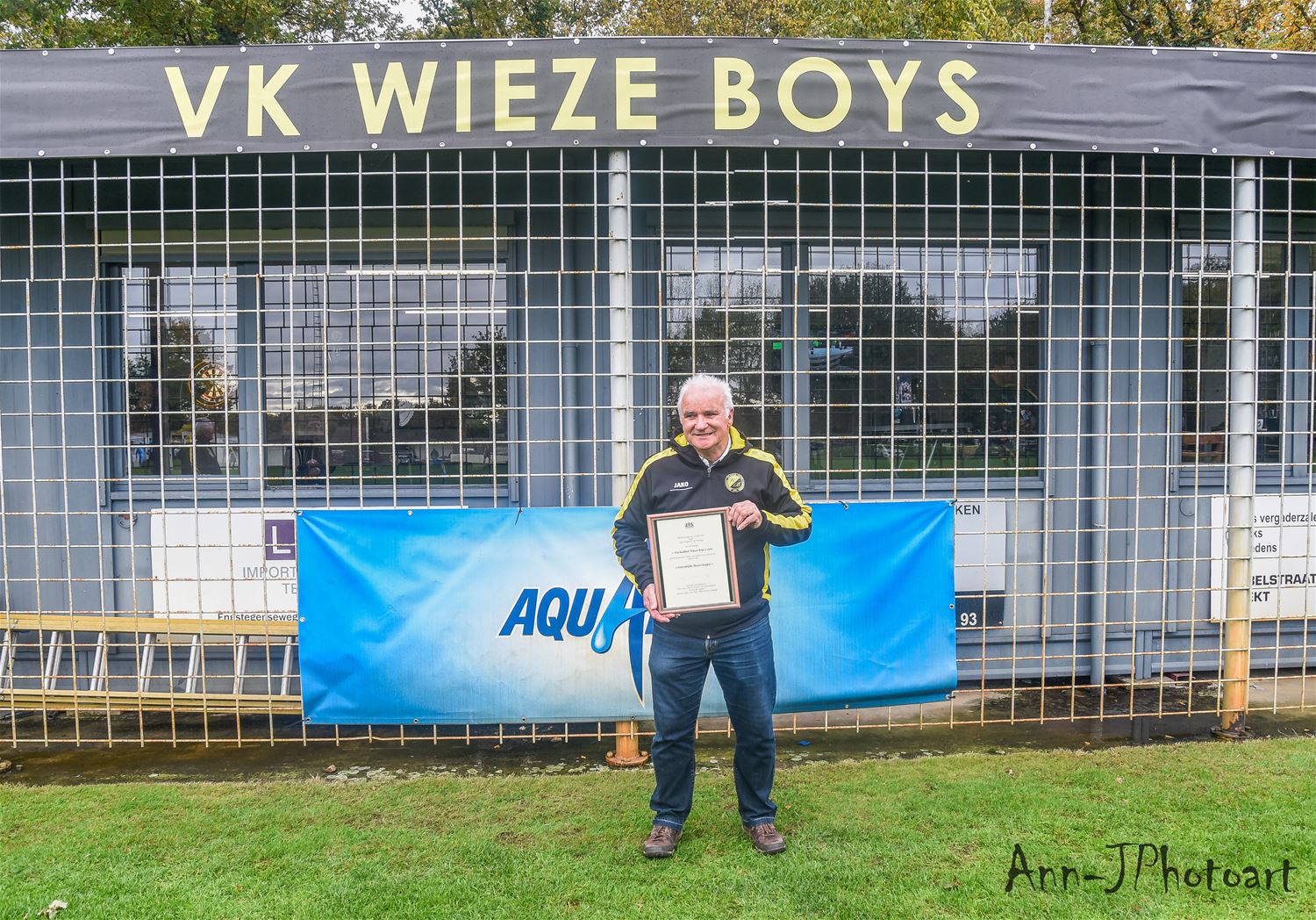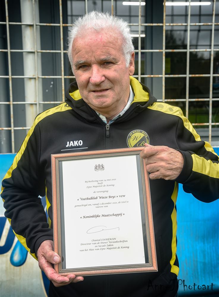 Bij de Wieze Boys in Boekt was het vandaag een feestelijke namiddag. De club bestaat 50 jaar en mag zich dus voortaan Koninklijke Maatschappij noemen. Lode Beerten kon trots de oorkonde tonen waarin staat dat de koning op 24 mei de titel heeft toegekend, vanaf 2 december 2021 mag de club trots die titel dragen. En hoe kon dat beter gevierd worden dan met een wedstrijd tussen Wieze Boys A en Wieze Boys B, toevallig was die partij dan ook nog eens geloot voor de achtste finales van de beker in de klbs. Met veel supporters langs de lijn wilden beide ploegen elkaar geen duimbreed toegeven, maar logischerwijze was het toch topclub Wieze Boys A dat met een koninklijke 6-1 Wieze Boys B uit de beker wipte. We hebben het zelf niet kunnen zien, maar vermoeden wel dat achteraf gezamelijk ettelijke pinten zijn achterovergeslagen, op de club en op de koning. Nog in de beker gaat ook RP Products door na een 3-2 zege tegen FC Vini's. (foto's Ann Jordens)71156
