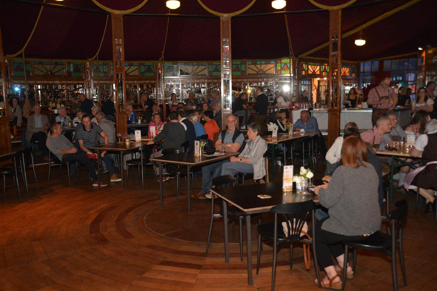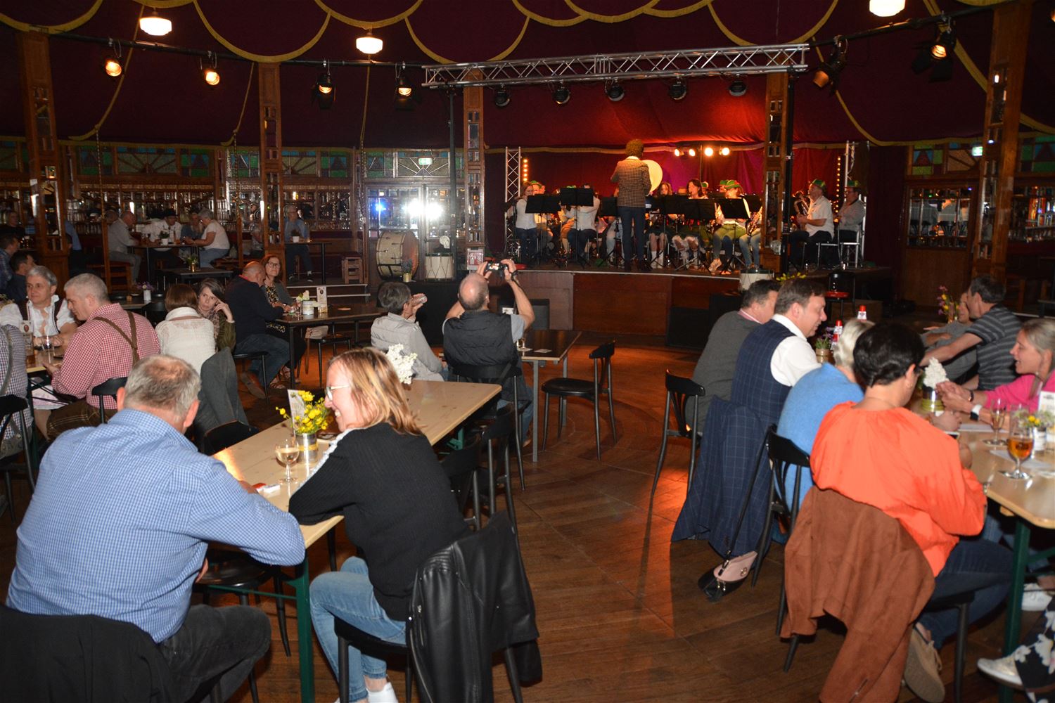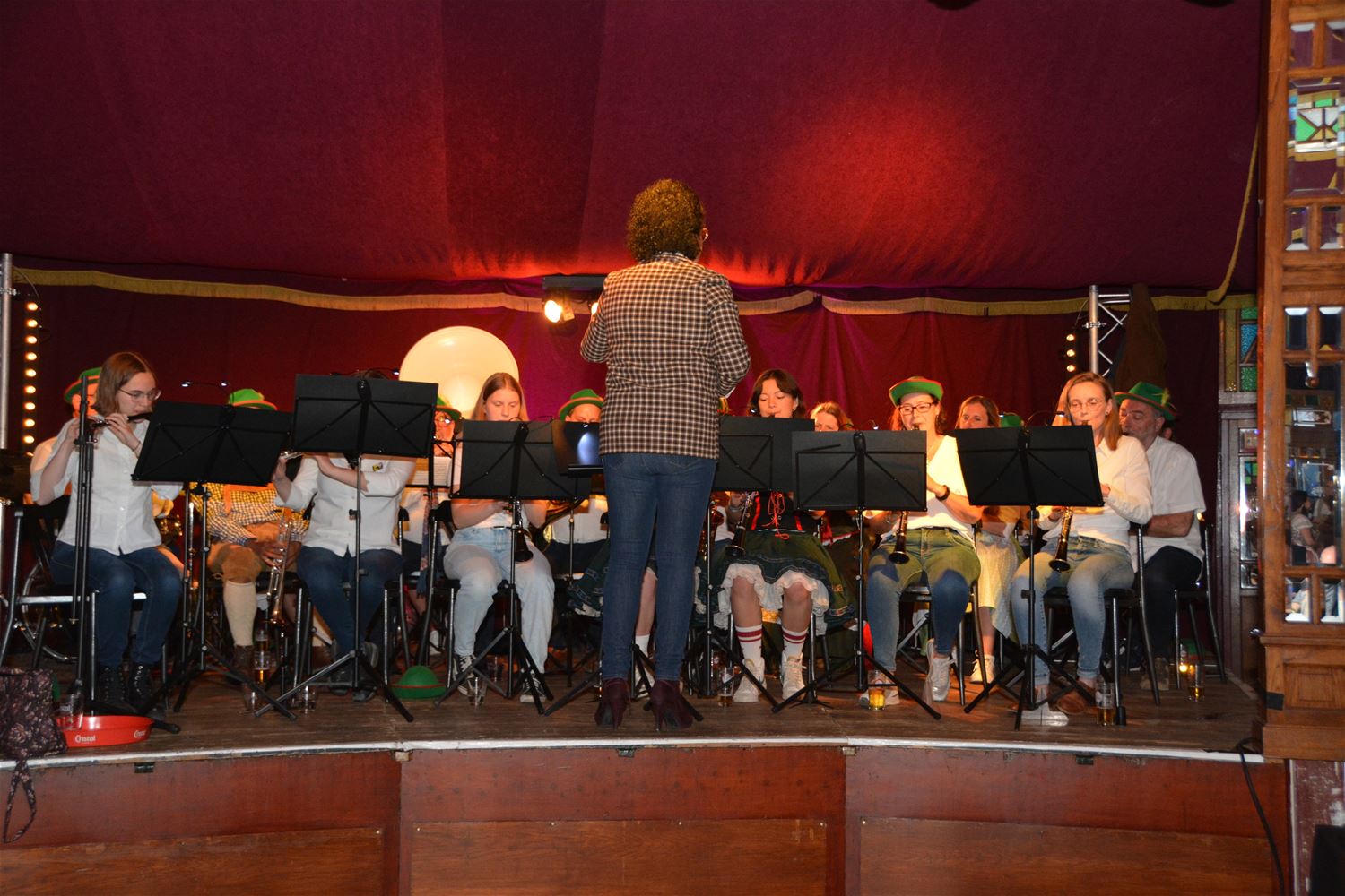 De Koninklijke Harmonie De Ware Vrienden heeft haar feestweekend sfeervol ingezet. Wie vanavond de spiegeltent binnenstapte, waande zich inderdaad ergens in Beieren tijdens de oktoberfeesten. We bespeurden lederhosen, decolletés, bierpotten en vooral aangepaste ambiancemuziek. De tent zat niet overvol, maar was wel voldoende gevuld om er de sfeer in te krijgen. Alles werd dan ook met een knipoog gebracht. Een grote harmonie als De Ware Vrienden heeft ook de luxe om zich in twee orkesten te kunnen opsplitsen, kwestie van te kunnen opwarmen/bijtanken als de collega's aan het werk zijn. En het bier Ware Vriend vloeide rijkelijk. Maar er is nog genoeg voor de rest van het weekend.72988