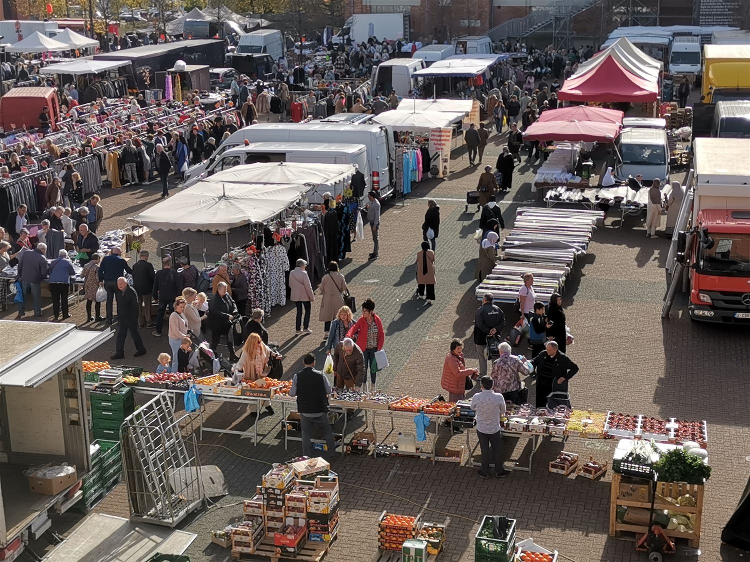 Het bijna zomerse weer zorgde vandaag voor een grote drukte op de MijnMarkt. Er heerste bijna een vakantiesfeertje. Er werd ook goed gekocht, alleen de herfst- en winterkleding bleef onaangeroerd, maar dat is momenteel een fenomeen in alle handelszaken. 75642